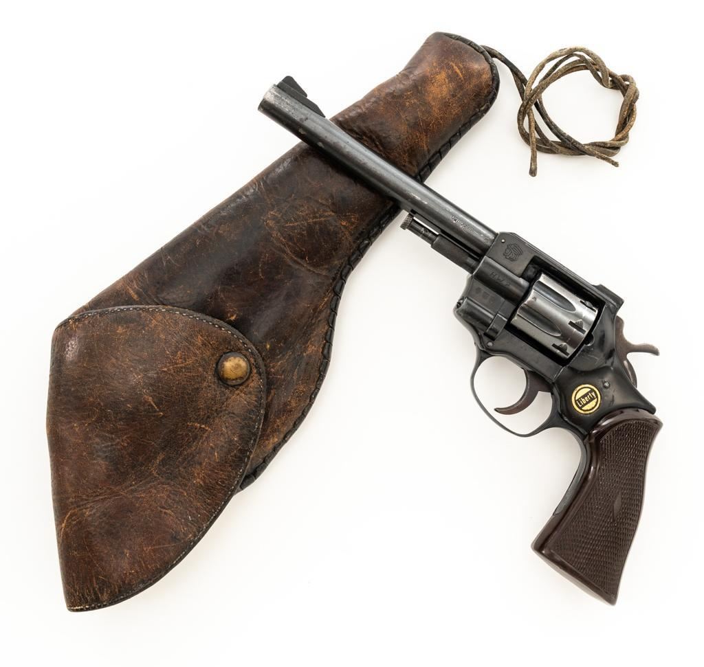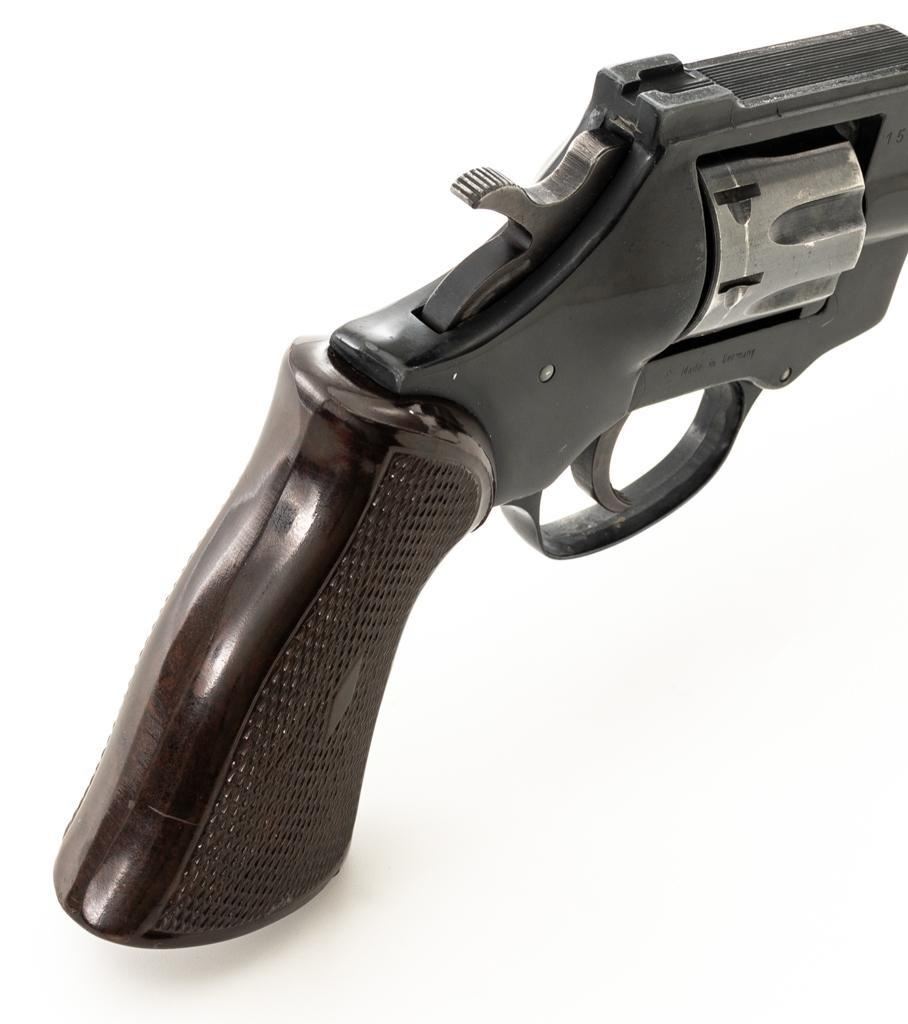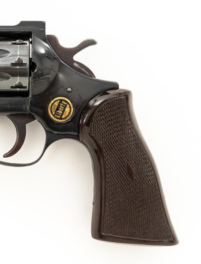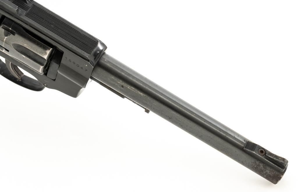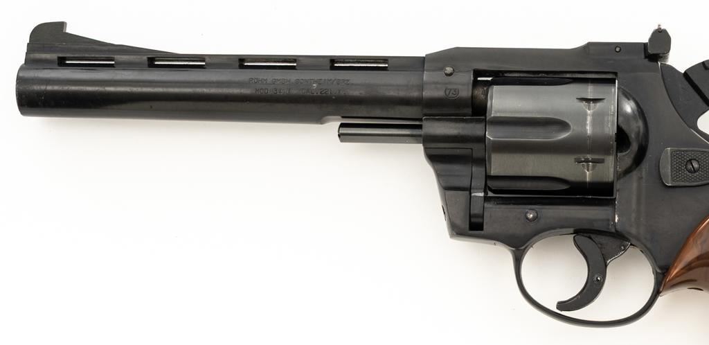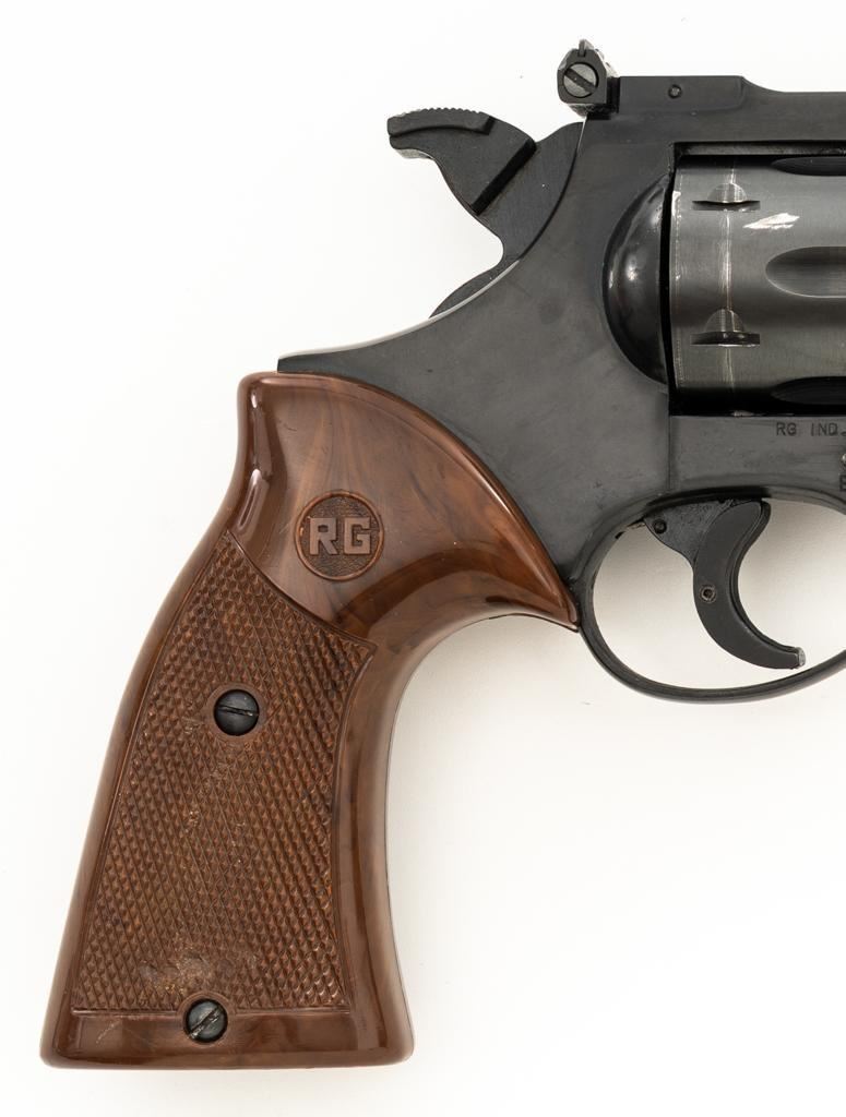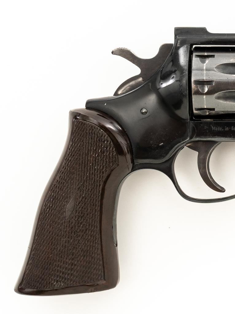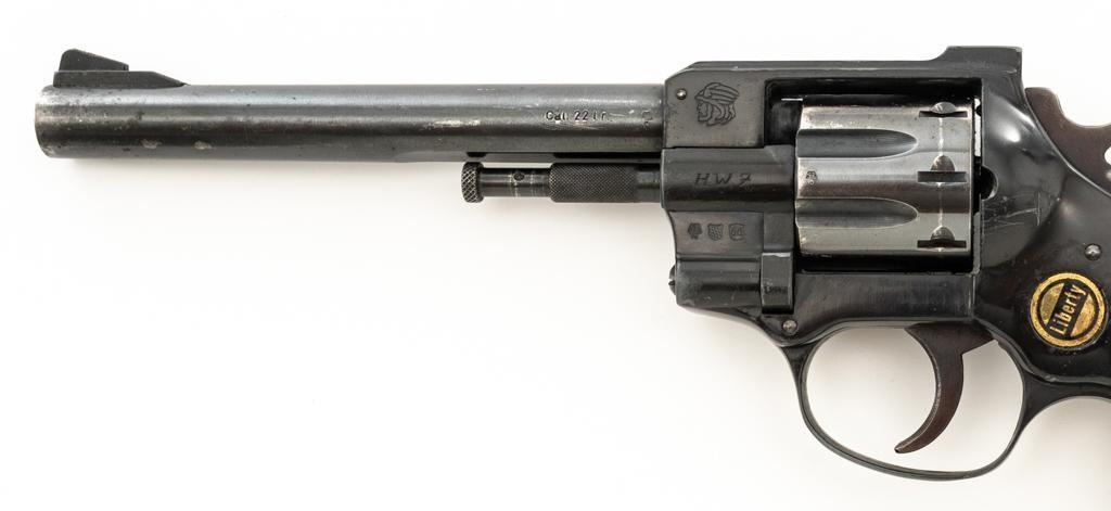 Lot of Two (2) Double Action Revolvers by RG & Arminius: 1.) RG Model 34T Double Action 6-Shot Revolver, #EB304391, .22 LR cal., 6'' vent rib barrel, black finish, checkered plastic two-piece grips, Patridge style front and adjustable square notch rear sight. Revolver is in near excellent overall condition, retaining approx. 95% thinning factory finish. Grips with a few flea bite chips at the bases and some minor damage at the base of the right panel. Action functions well. Bore is near excellent with defined rifling. 2.) Arminius Model HW7 Double Action 8-Shot Revolver, #159047, .22 LR cal., 6'' barrel, blue finish, checkered composition one-piece grips, serrated blade front and fixed square-notch rear sight. Includes a Eubanks Leather of Boise, ID stitched leather flap holster with fleece lining and brass snaps, marked on the reverse. Holster is in very good condition with tight stitching. Revolver is in very good overall condition, retaining approx. 90%-92% thinning finish, with wear and surface rust at the muzzle. Grips are very good. Action functions smoothly. Bore is very good with defined rifling. Est:$200-$300/lot(Both/Modern) (Not available to Calif. residents.)