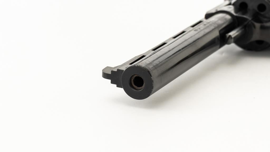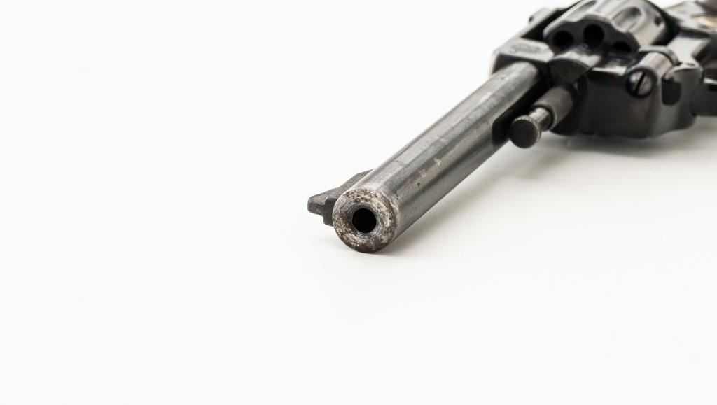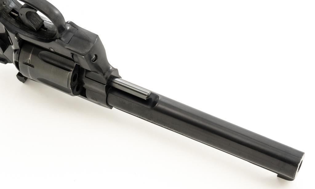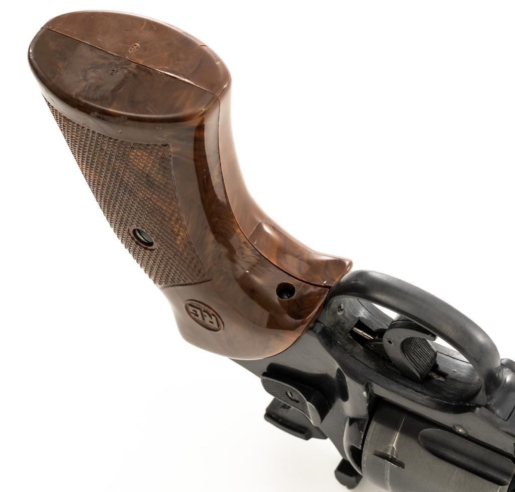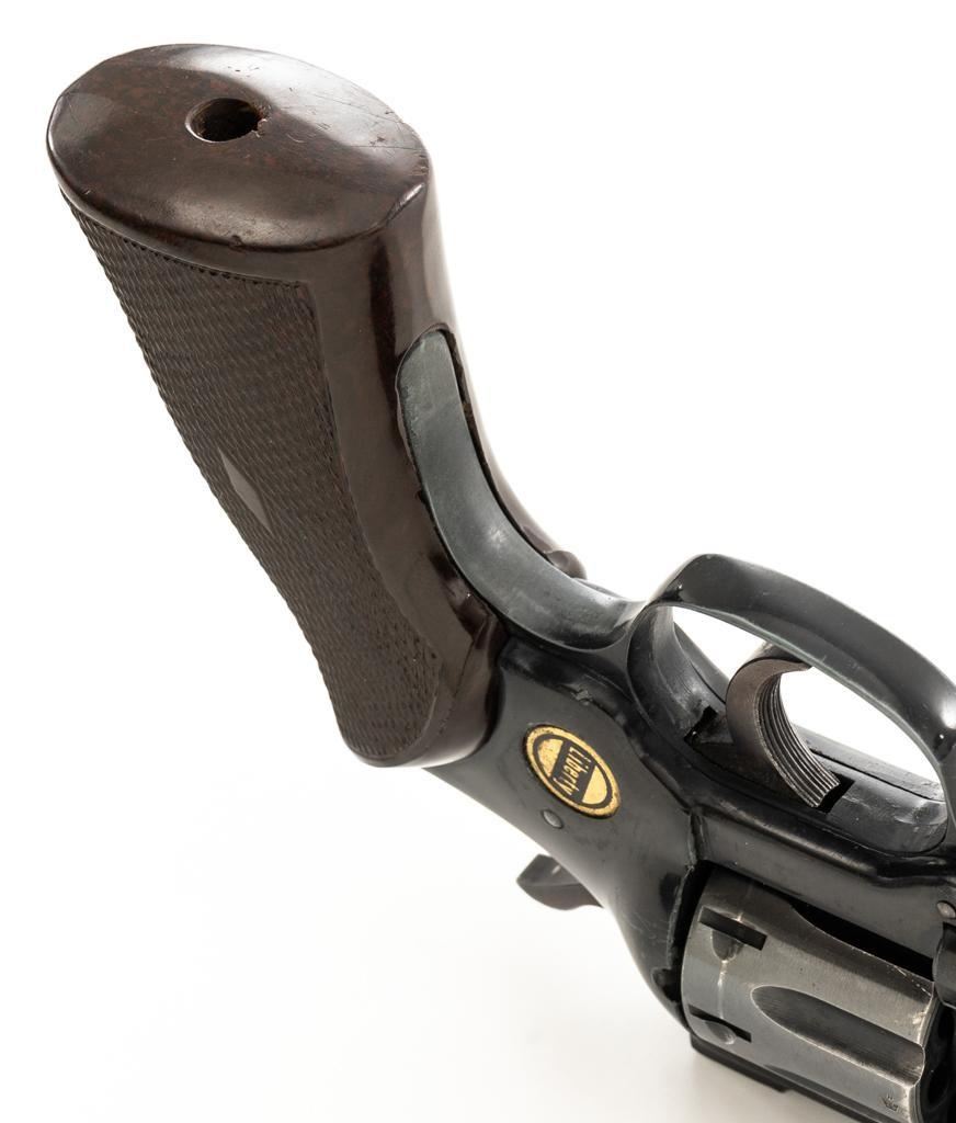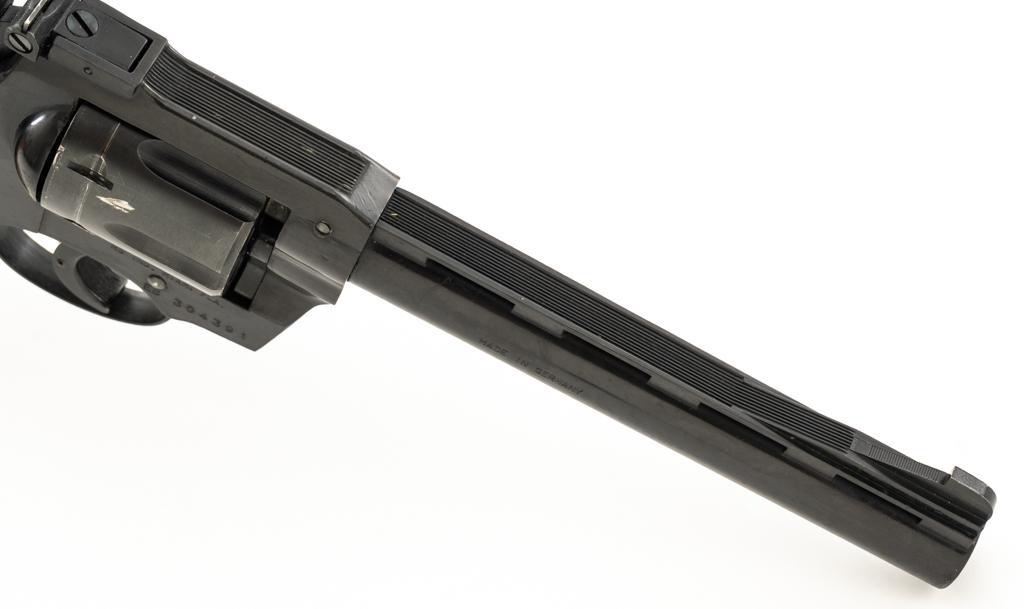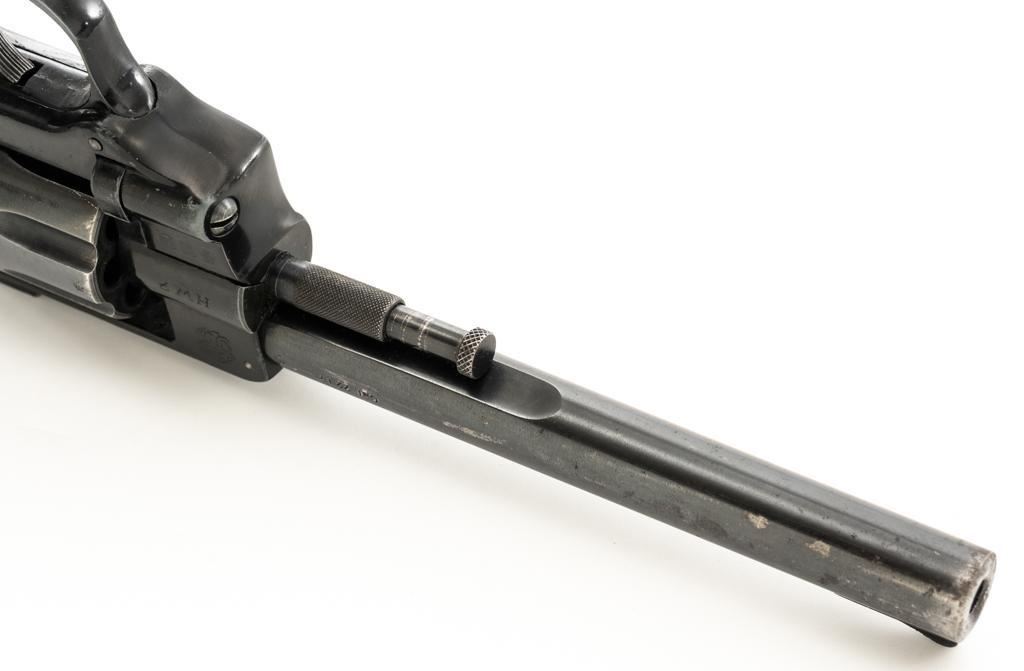 Lot of Two (2) Double Action Revolvers by RG & Arminius: 1.) RG Model 34T Double Action 6-Shot Revolver, #EB304391, .22 LR cal., 6'' vent rib barrel, black finish, checkered plastic two-piece grips, Patridge style front and adjustable square notch rear sight. Revolver is in near excellent overall condition, retaining approx. 95% thinning factory finish. Grips with a few flea bite chips at the bases and some minor damage at the base of the right panel. Action functions well. Bore is near excellent with defined rifling. 2.) Arminius Model HW7 Double Action 8-Shot Revolver, #159047, .22 LR cal., 6'' barrel, blue finish, checkered composition one-piece grips, serrated blade front and fixed square-notch rear sight. Includes a Eubanks Leather of Boise, ID stitched leather flap holster with fleece lining and brass snaps, marked on the reverse. Holster is in very good condition with tight stitching. Revolver is in very good overall condition, retaining approx. 90%-92% thinning finish, with wear and surface rust at the muzzle. Grips are very good. Action functions smoothly. Bore is very good with defined rifling. Est:$200-$300/lot(Both/Modern) (Not available to Calif. residents.)