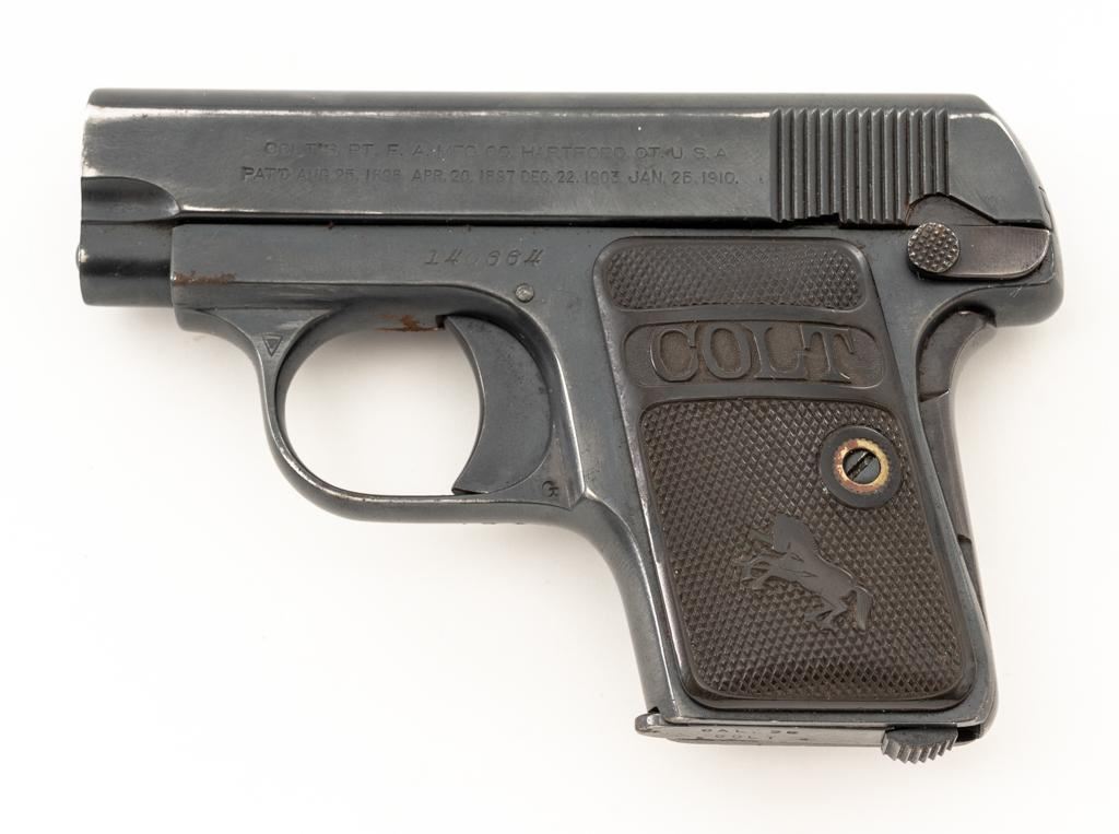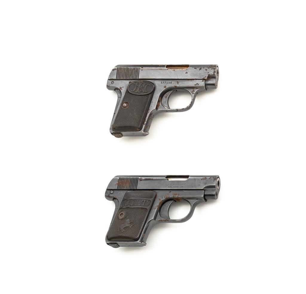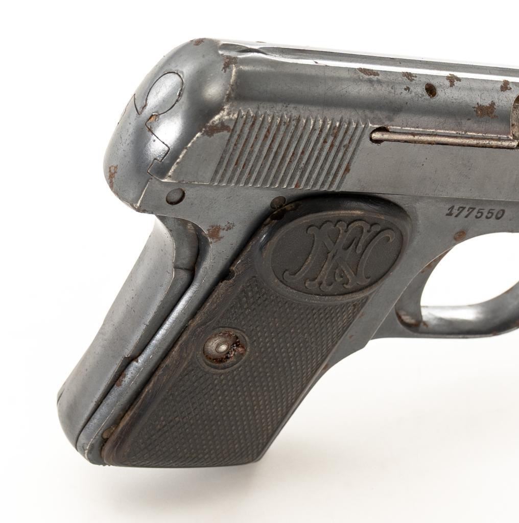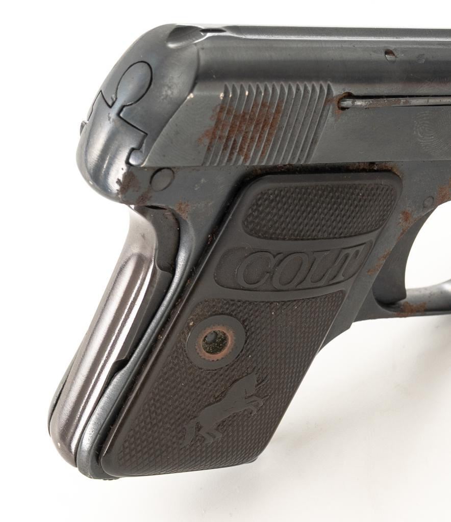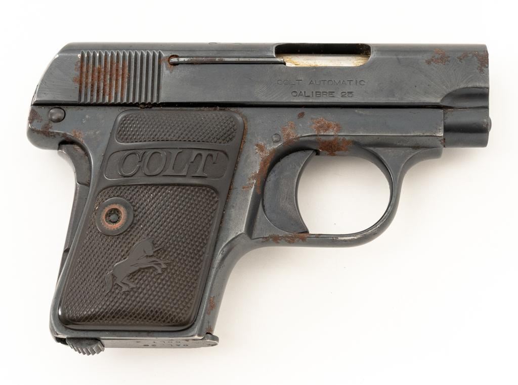 Lot of Two (2) Semi-Automatic Vest Pocket Pistols: 1.) Fabrique Nationale Baby, #177550, .25 ACP cal., 2'' barrel, blue finish, checkered hard rubber two-piece grips, low profile blade front and fixed ''U''-notch rear sight, with one blue steel 6-round magazine. Pistol is in fair condition, retaining approx. 80%-85% thinning finish, with moderate surface rust on the slide and frame, due to poor storage. Grips are in good condition with insect damage on the left panel. Action is stiff but functions and would benefit from some TLC. Bore is dark with moderate pitting and surface rust. 2.) Colt Model 1908 Vest Pocket Hammerless Pistol, #140664, .25 ACP cal., 2'' barrel, blue finish, checkered hard rubber two-piece Colt grips, low profile blade front and fixed ''U''-notch rear sight, with one 6-round blue steel Colt magazine. Mfg'd 1916. Pistol is in good overall condition, retaining approx 90%- 92% thinning finish, with wear at the muzzle, and scattered areas of light to moderate surface rust, which is heavier on the slide and frame at the trigger guard. Grips are in fine condition with subtle smoothing of the checkering detail. Action functions but is sluggish and needs cleaning. Bore is very good, with some areas of minor erosion, and well-defined rifling. Est.: $400-$700/lot. (C&R/PPT)