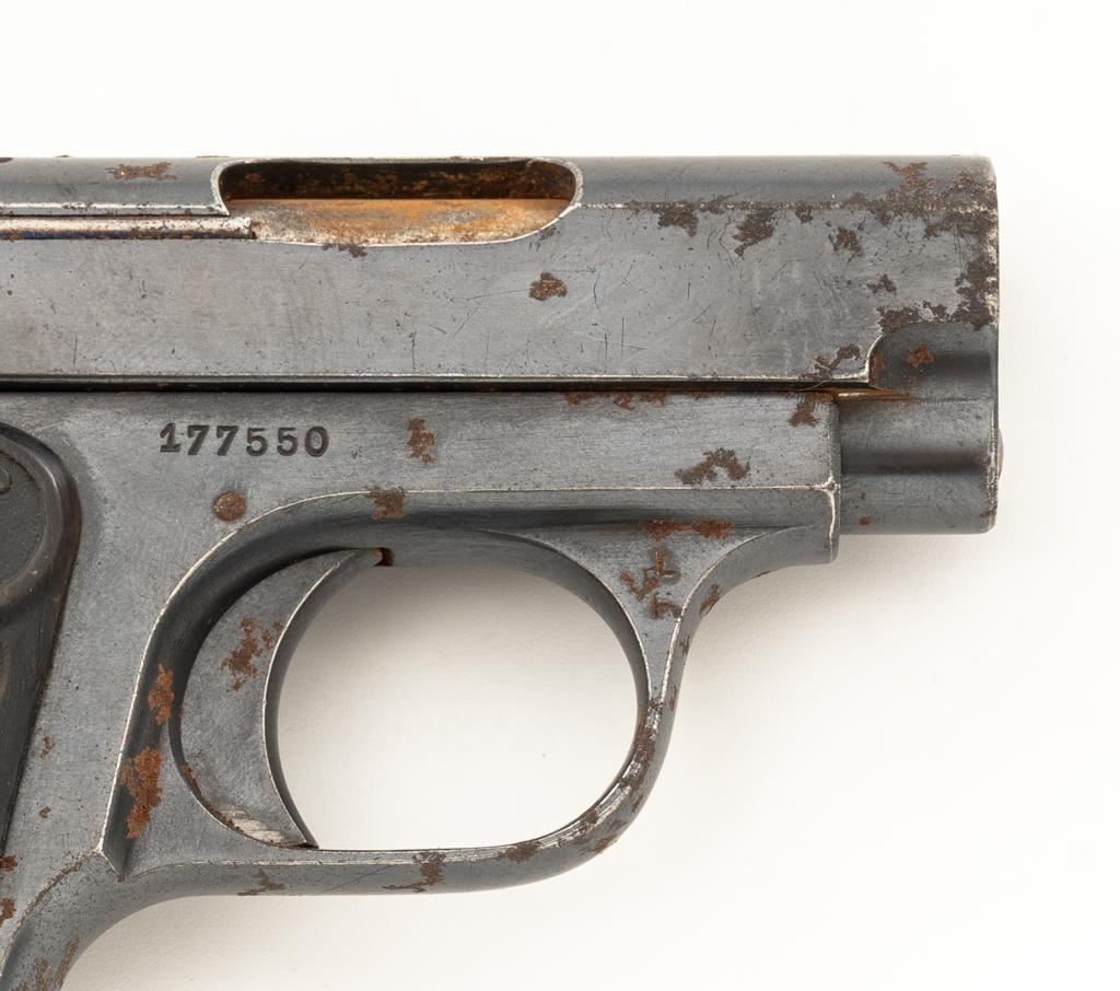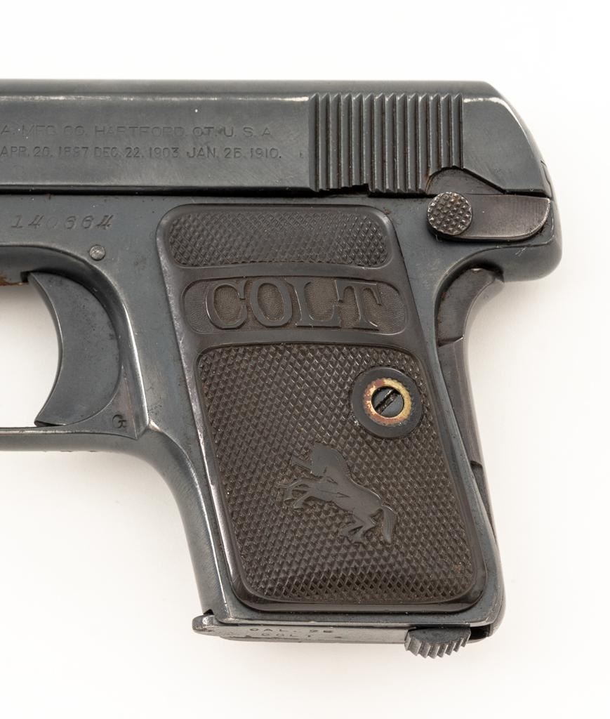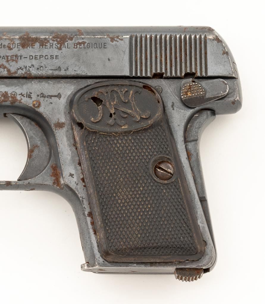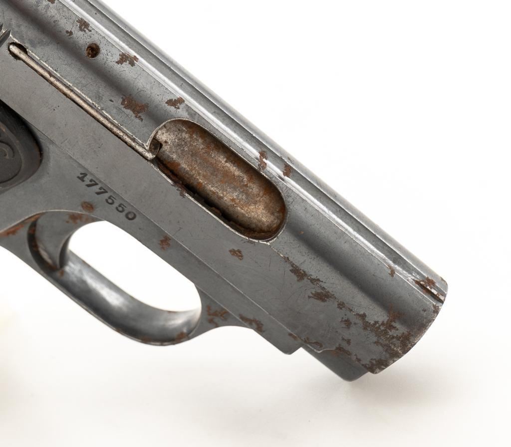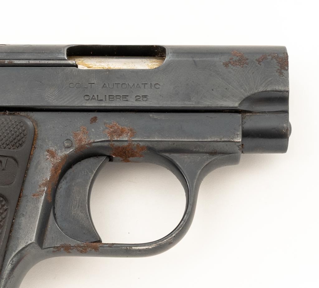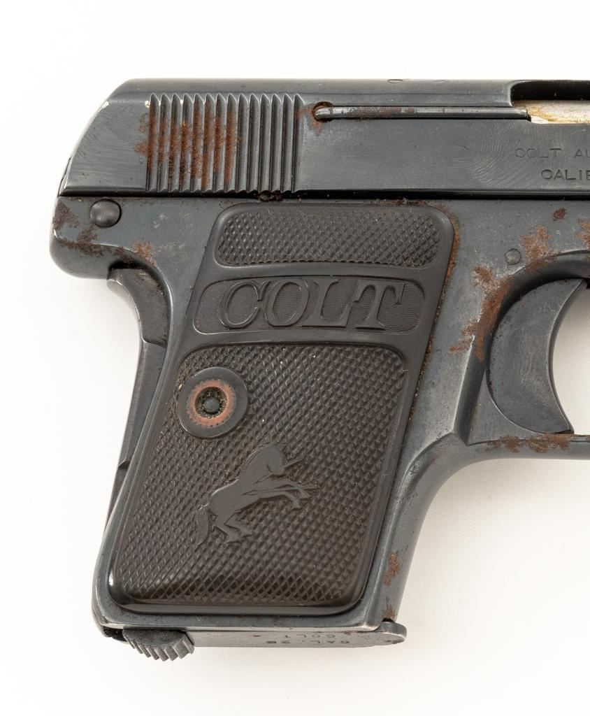 Lot of Two (2) Semi-Automatic Vest Pocket Pistols: 1.) Fabrique Nationale Baby, #177550, .25 ACP cal., 2'' barrel, blue finish, checkered hard rubber two-piece grips, low profile blade front and fixed ''U''-notch rear sight, with one blue steel 6-round magazine. Pistol is in fair condition, retaining approx. 80%-85% thinning finish, with moderate surface rust on the slide and frame, due to poor storage. Grips are in good condition with insect damage on the left panel. Action is stiff but functions and would benefit from some TLC. Bore is dark with moderate pitting and surface rust. 2.) Colt Model 1908 Vest Pocket Hammerless Pistol, #140664, .25 ACP cal., 2'' barrel, blue finish, checkered hard rubber two-piece Colt grips, low profile blade front and fixed ''U''-notch rear sight, with one 6-round blue steel Colt magazine. Mfg'd 1916. Pistol is in good overall condition, retaining approx 90%- 92% thinning finish, with wear at the muzzle, and scattered areas of light to moderate surface rust, which is heavier on the slide and frame at the trigger guard. Grips are in fine condition with subtle smoothing of the checkering detail. Action functions but is sluggish and needs cleaning. Bore is very good, with some areas of minor erosion, and well-defined rifling. Est.: $400-$700/lot. (C&R/PPT)