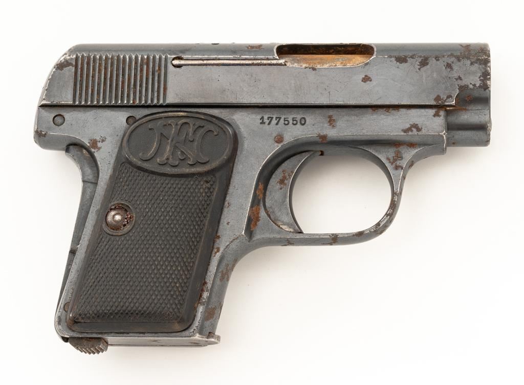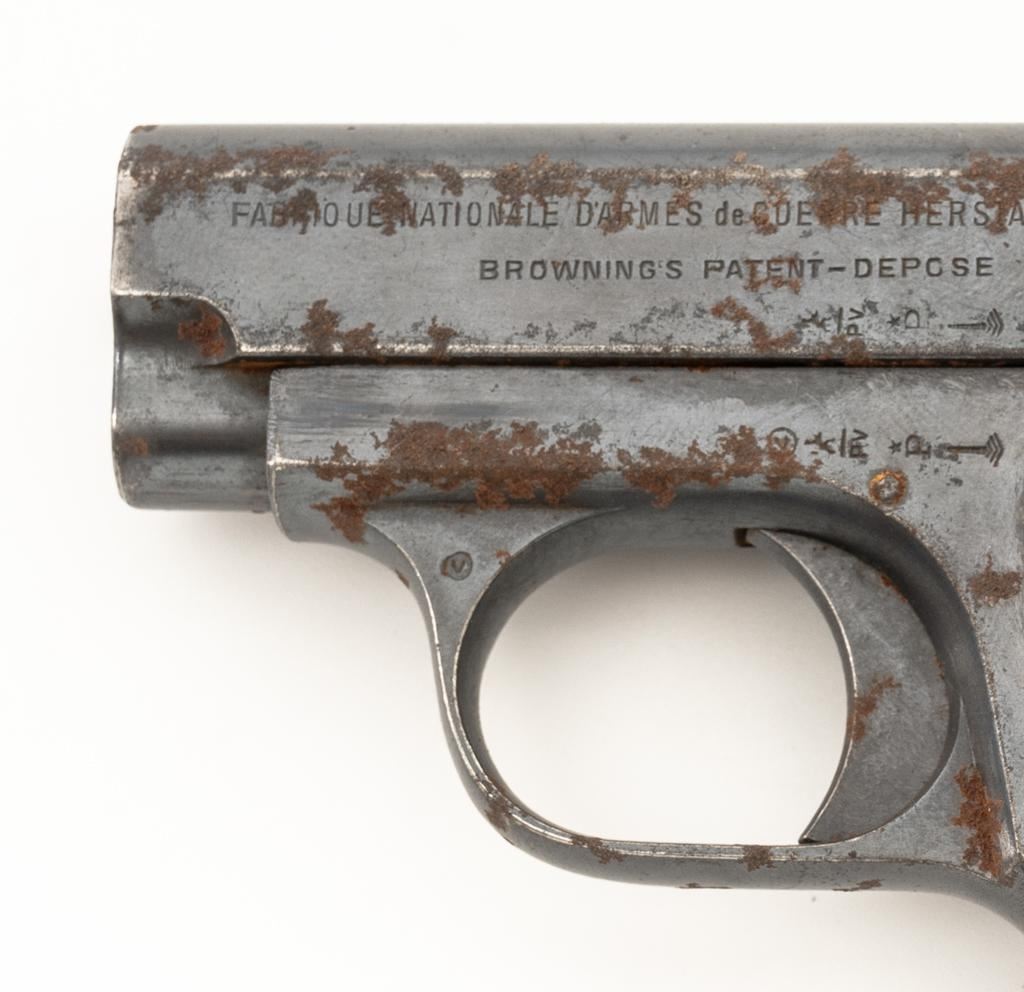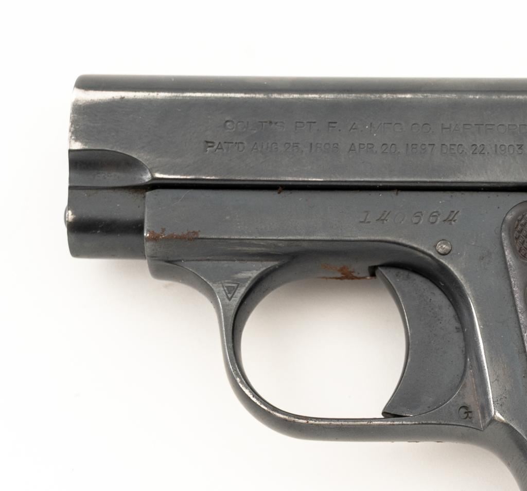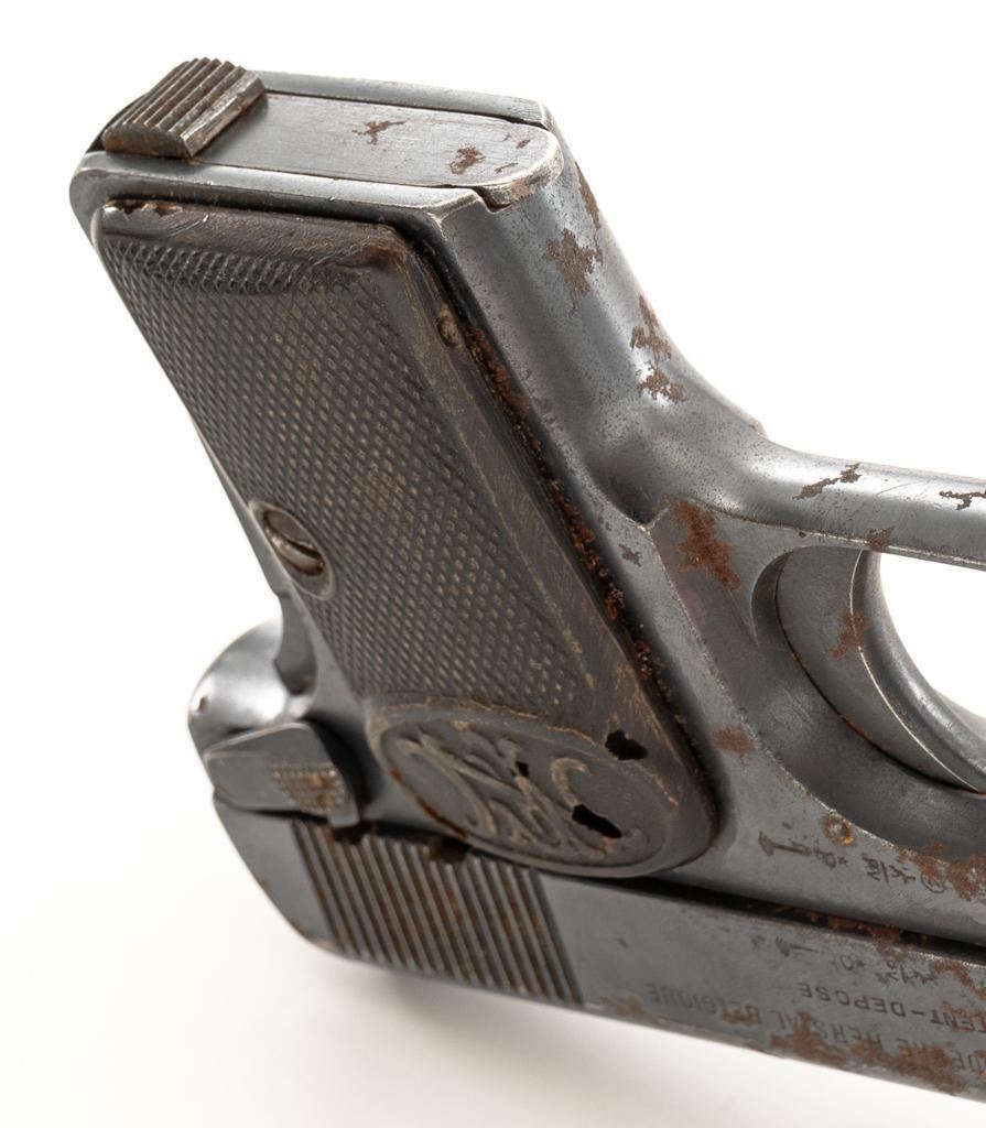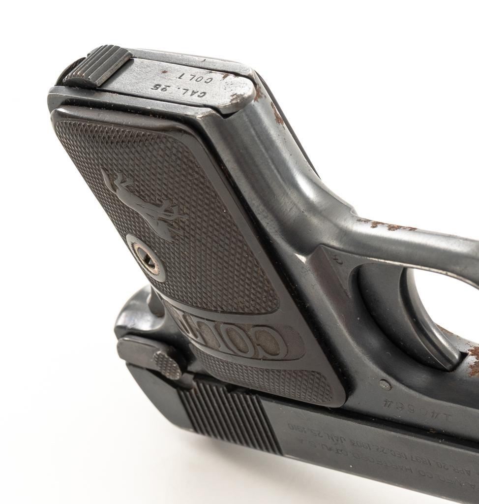 Lot of Two (2) Semi-Automatic Vest Pocket Pistols: 1.) Fabrique Nationale Baby, #177550, .25 ACP cal., 2'' barrel, blue finish, checkered hard rubber two-piece grips, low profile blade front and fixed ''U''-notch rear sight, with one blue steel 6-round magazine. Pistol is in fair condition, retaining approx. 80%-85% thinning finish, with moderate surface rust on the slide and frame, due to poor storage. Grips are in good condition with insect damage on the left panel. Action is stiff but functions and would benefit from some TLC. Bore is dark with moderate pitting and surface rust. 2.) Colt Model 1908 Vest Pocket Hammerless Pistol, #140664, .25 ACP cal., 2'' barrel, blue finish, checkered hard rubber two-piece Colt grips, low profile blade front and fixed ''U''-notch rear sight, with one 6-round blue steel Colt magazine. Mfg'd 1916. Pistol is in good overall condition, retaining approx 90%- 92% thinning finish, with wear at the muzzle, and scattered areas of light to moderate surface rust, which is heavier on the slide and frame at the trigger guard. Grips are in fine condition with subtle smoothing of the checkering detail. Action functions but is sluggish and needs cleaning. Bore is very good, with some areas of minor erosion, and well-defined rifling. Est.: $400-$700/lot. (C&R/PPT)