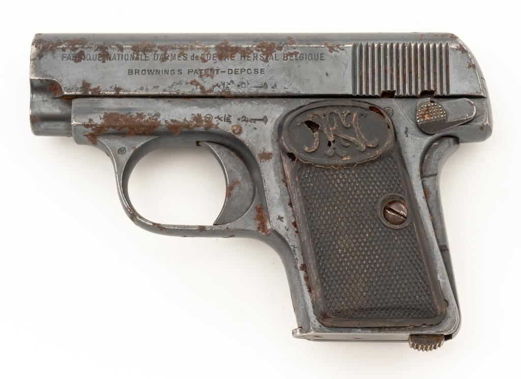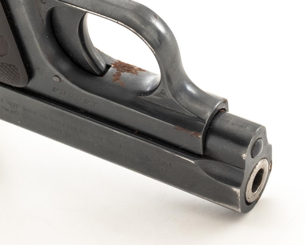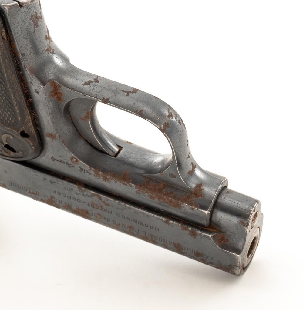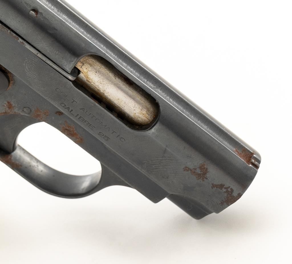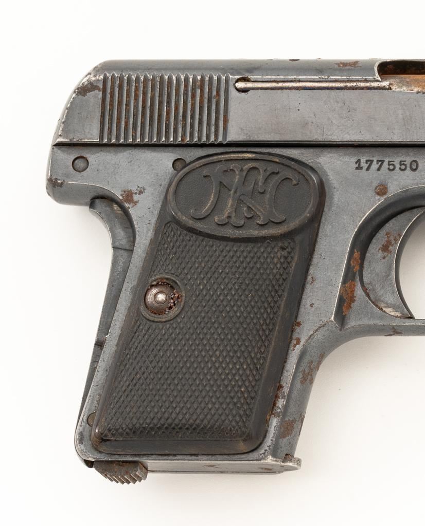 Lot of Two (2) Semi-Automatic Vest Pocket Pistols: 1.) Fabrique Nationale Baby, #177550, .25 ACP cal., 2'' barrel, blue finish, checkered hard rubber two-piece grips, low profile blade front and fixed ''U''-notch rear sight, with one blue steel 6-round magazine. Pistol is in fair condition, retaining approx. 80%-85% thinning finish, with moderate surface rust on the slide and frame, due to poor storage. Grips are in good condition with insect damage on the left panel. Action is stiff but functions and would benefit from some TLC. Bore is dark with moderate pitting and surface rust. 2.) Colt Model 1908 Vest Pocket Hammerless Pistol, #140664, .25 ACP cal., 2'' barrel, blue finish, checkered hard rubber two-piece Colt grips, low profile blade front and fixed ''U''-notch rear sight, with one 6-round blue steel Colt magazine. Mfg'd 1916. Pistol is in good overall condition, retaining approx 90%- 92% thinning finish, with wear at the muzzle, and scattered areas of light to moderate surface rust, which is heavier on the slide and frame at the trigger guard. Grips are in fine condition with subtle smoothing of the checkering detail. Action functions but is sluggish and needs cleaning. Bore is very good, with some areas of minor erosion, and well-defined rifling. Est.: $400-$700/lot. (C&R/PPT)