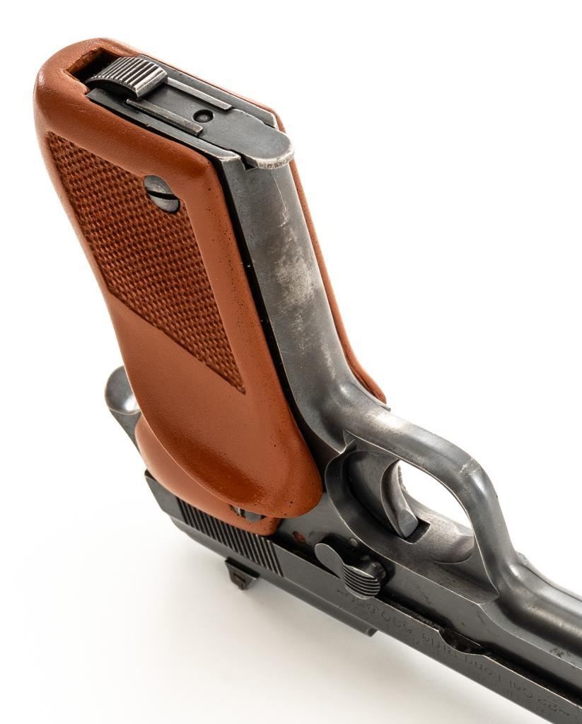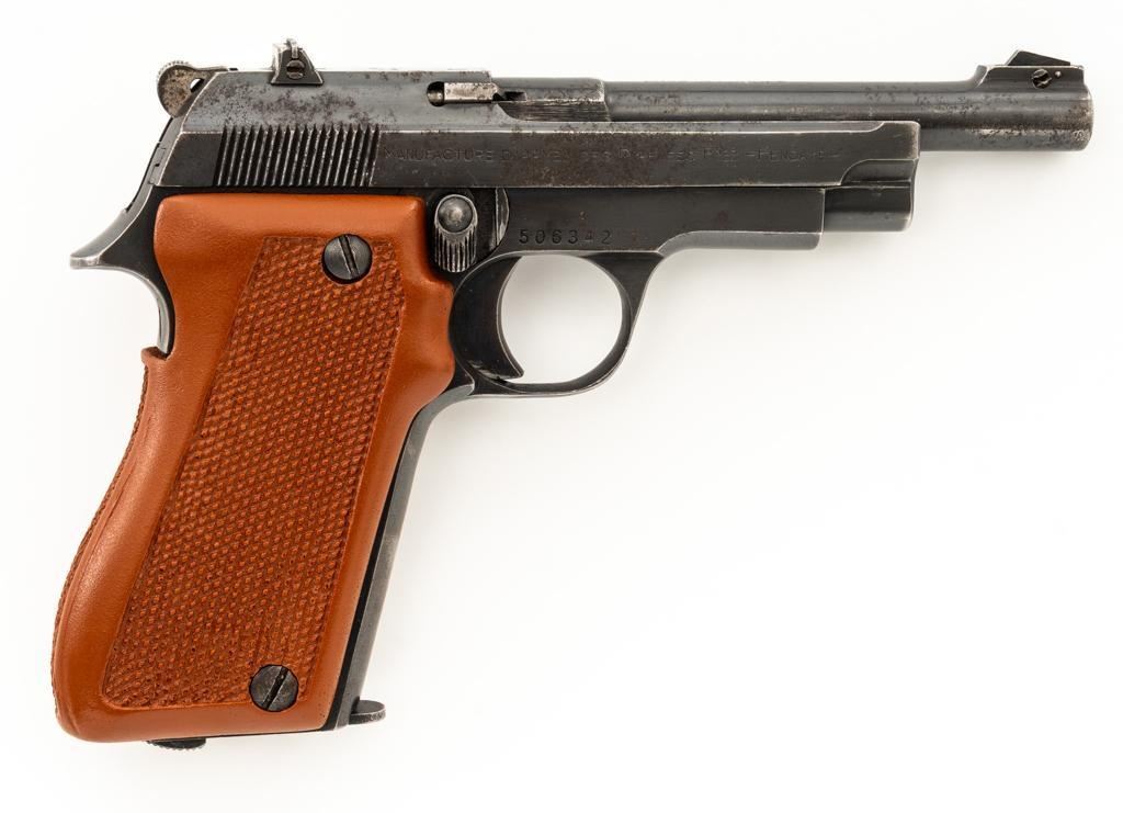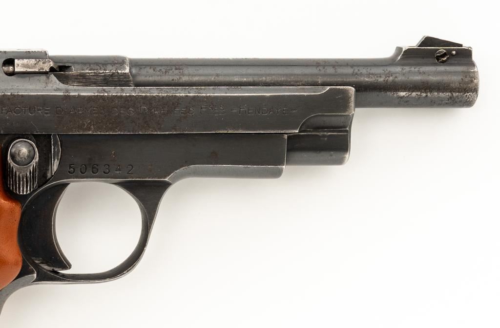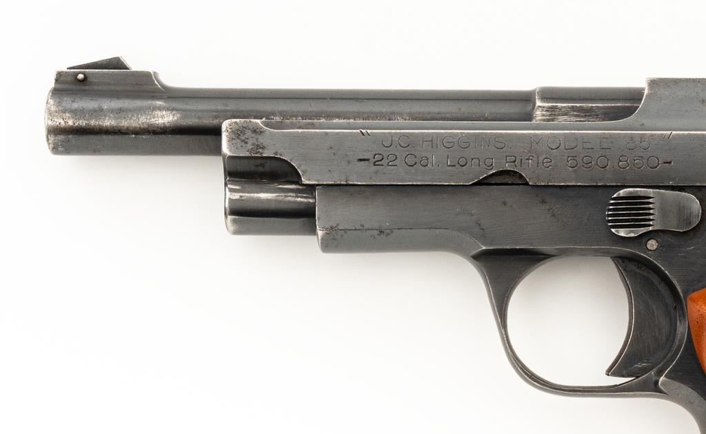 J.C. Higgins Model 85 Semi-Automatic Pistol, #506342, .22 LR cal., 4'' barrel, blue finish, replacement checkered plastic two-piece grips with left side thumbrest, blade front and drift adjustable square-notch rear sight, with one 10-round blue steel magazine. Factory markings are clear. Right side is marked ''MANUFACTURE D'ARMESDES PYRENEES FSES-HENDAYE''. Top of the barrel is marked ''MADE IN FRANCE''. Pistol is in very good overall condition, retaining approx 85%-90% thinning finish, with wear at the muzzle, and scattered patches of light surface rust. Slide shows edgewear and corrosion, worse on the right side. Front strap has worn to gray. Grips are in excellent condition with sharp checkering. Action is stiff but functions. Bore is very good with areas of minor erosion and defined rifling. An interesting French pistol manufactured for retail by Sears, Roebuck & Co. under the J.C. Higgins label. Est.: $150-$250. (C&R/PPT)