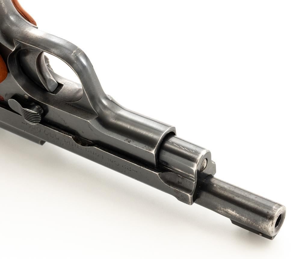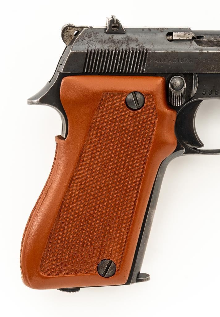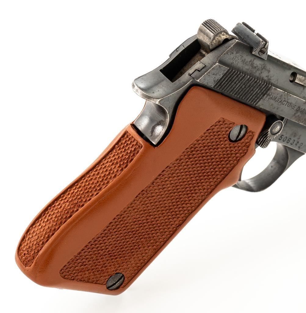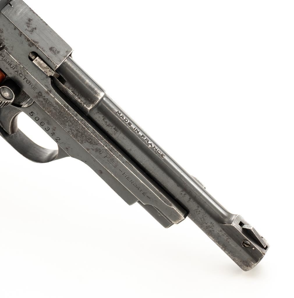 J.C. Higgins Model 85 Semi-Automatic Pistol, #506342, .22 LR cal., 4'' barrel, blue finish, replacement checkered plastic two-piece grips with left side thumbrest, blade front and drift adjustable square-notch rear sight, with one 10-round blue steel magazine. Factory markings are clear. Right side is marked ''MANUFACTURE D'ARMESDES PYRENEES FSES-HENDAYE''. Top of the barrel is marked ''MADE IN FRANCE''. Pistol is in very good overall condition, retaining approx 85%-90% thinning finish, with wear at the muzzle, and scattered patches of light surface rust. Slide shows edgewear and corrosion, worse on the right side. Front strap has worn to gray. Grips are in excellent condition with sharp checkering. Action is stiff but functions. Bore is very good with areas of minor erosion and defined rifling. An interesting French pistol manufactured for retail by Sears, Roebuck & Co. under the J.C. Higgins label. Est.: $150-$250. (C&R/PPT)