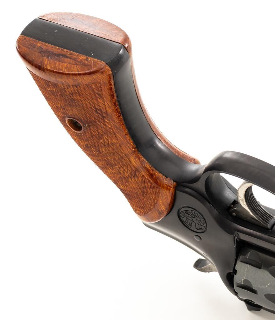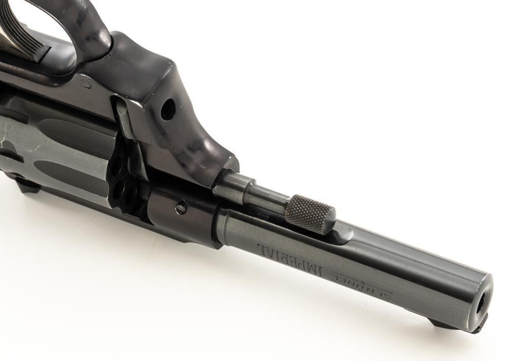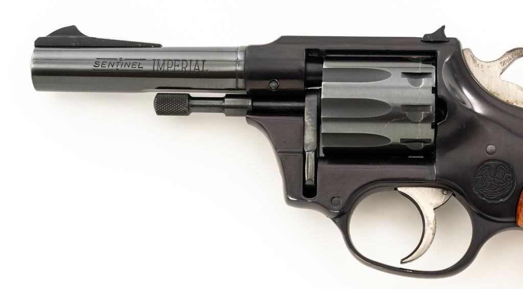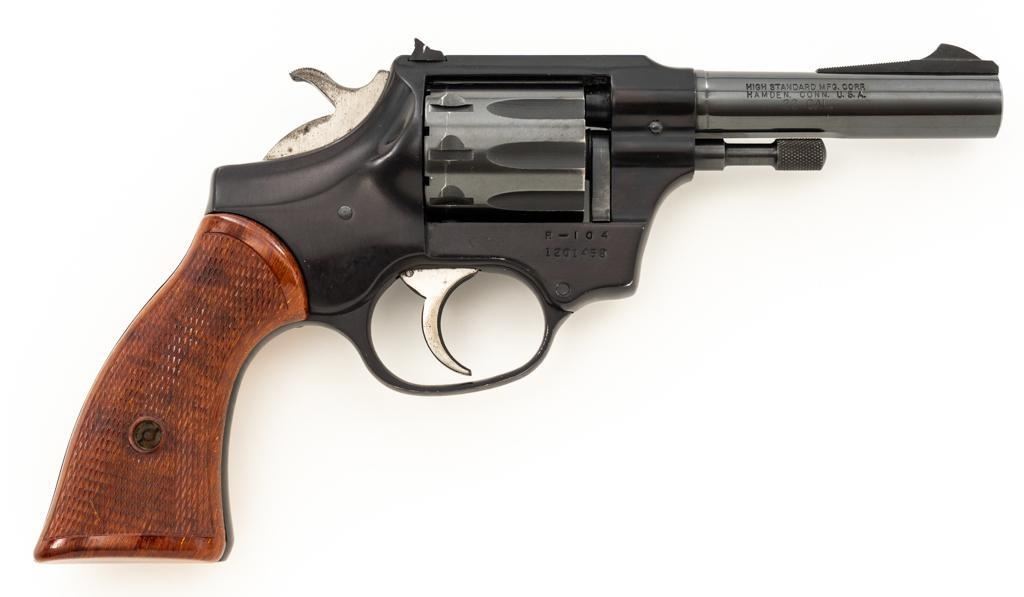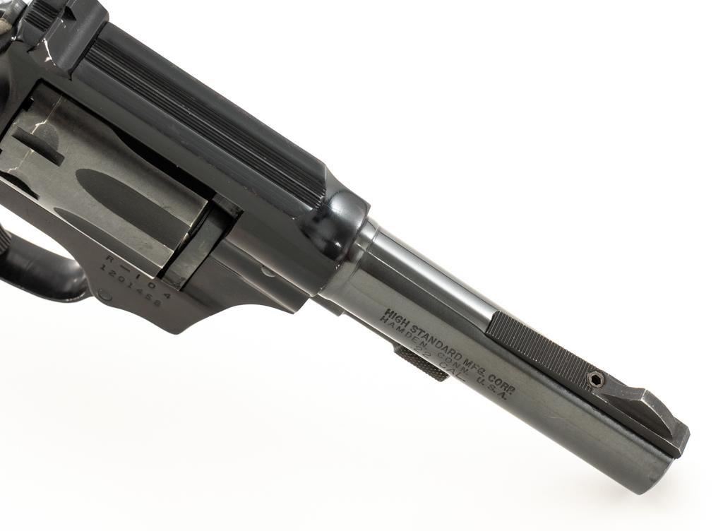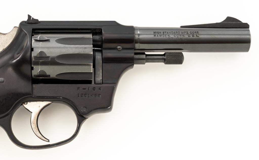 High Standard R-104 Sentinel Imperial 9-Shot Double Action Revolver, #1201458, .22 LR cal., 4'' barrel, blue finish, checkered plastic two-piece grips, ramped blade front and drift adjustable square-notch rear sight. Marked ''HIGH STANDARD MFG. CORP. / HAMDEN, CONN. U.S.A.'' Mfg'd 1961. Revolver is in near excellent overall condition, retaining approx. 97%-98% toning factory finish, with light wear at the muzzle and minor marks. Cylinder displays a faint index. Factory markings are clear. Grips are in excellent condition with sharp checkering. Action functions smoothly and locks up securely. Bore is mirror bright with excellent rifling, showing little use. Est.: $200-$400. (C&R/PPT)