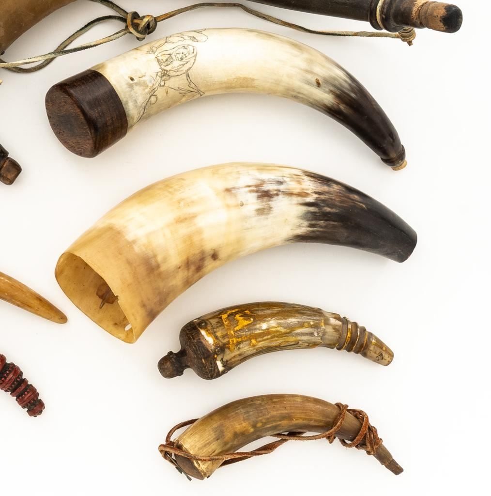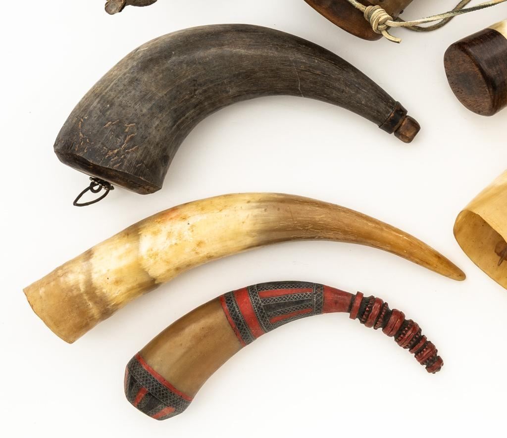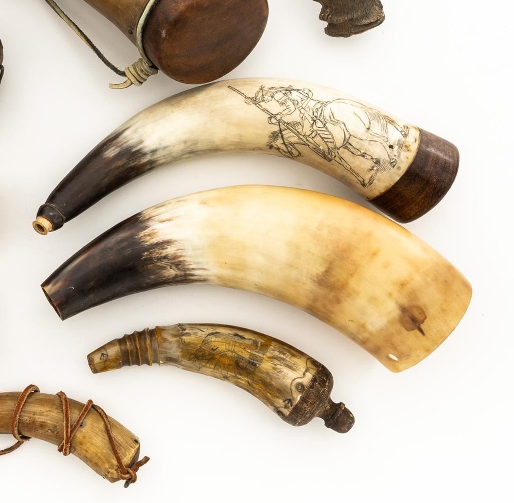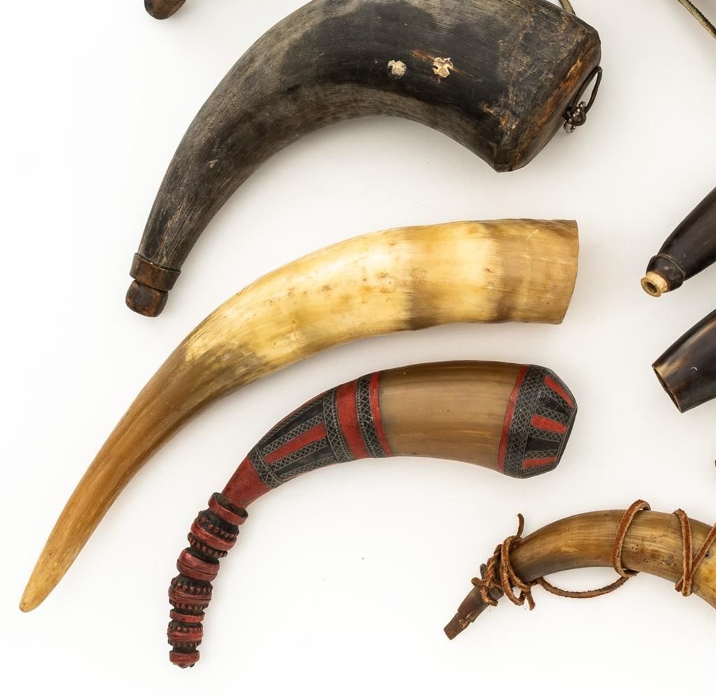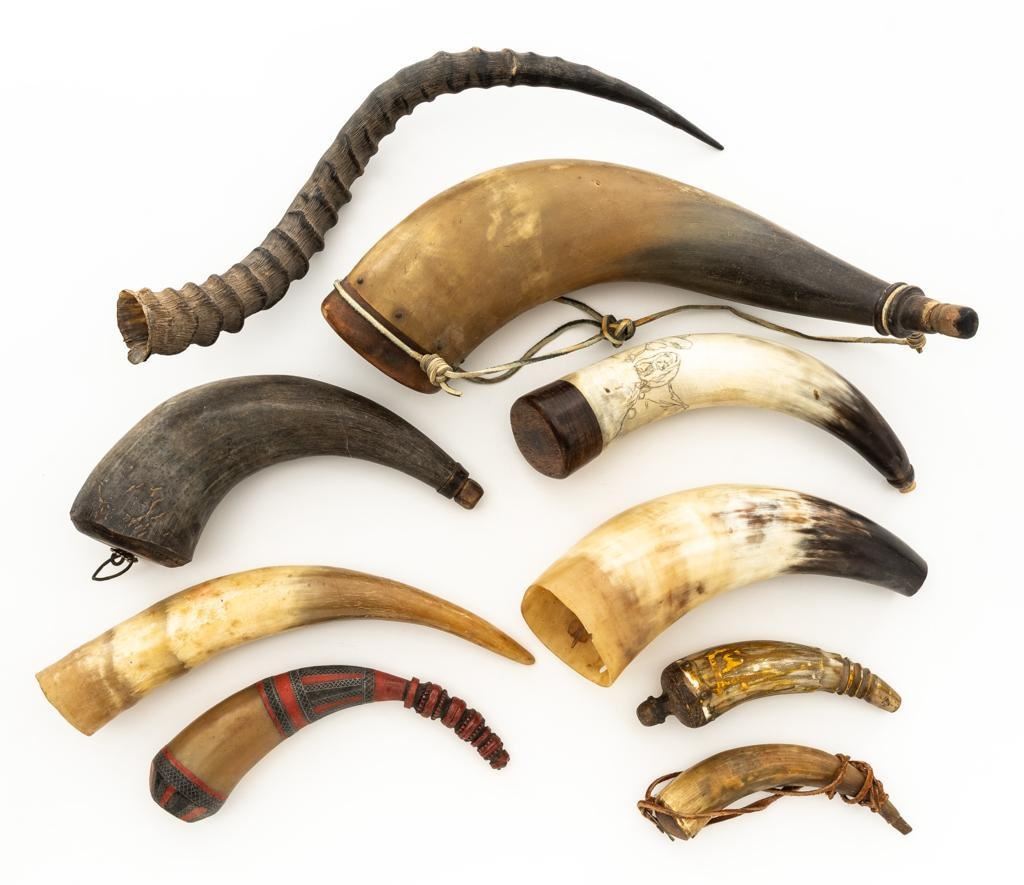 Lot of Nine (9) Misc. Powder Horns, ranging in size from approx. 16'' to 7'' overall, and in generally good condition. Ages vary but most appear to be older. One is hand carved and decorated in red and black; another with intricate ship engraving; third horn has what appears to be newer applied engraving of Native American and a bear. Several with stoppers and wooden base plugs. Most appear to be made of cow horn and one 17'' ibex horn. Est.: $200-$300/lot.(Michael Streitbeck Collection)