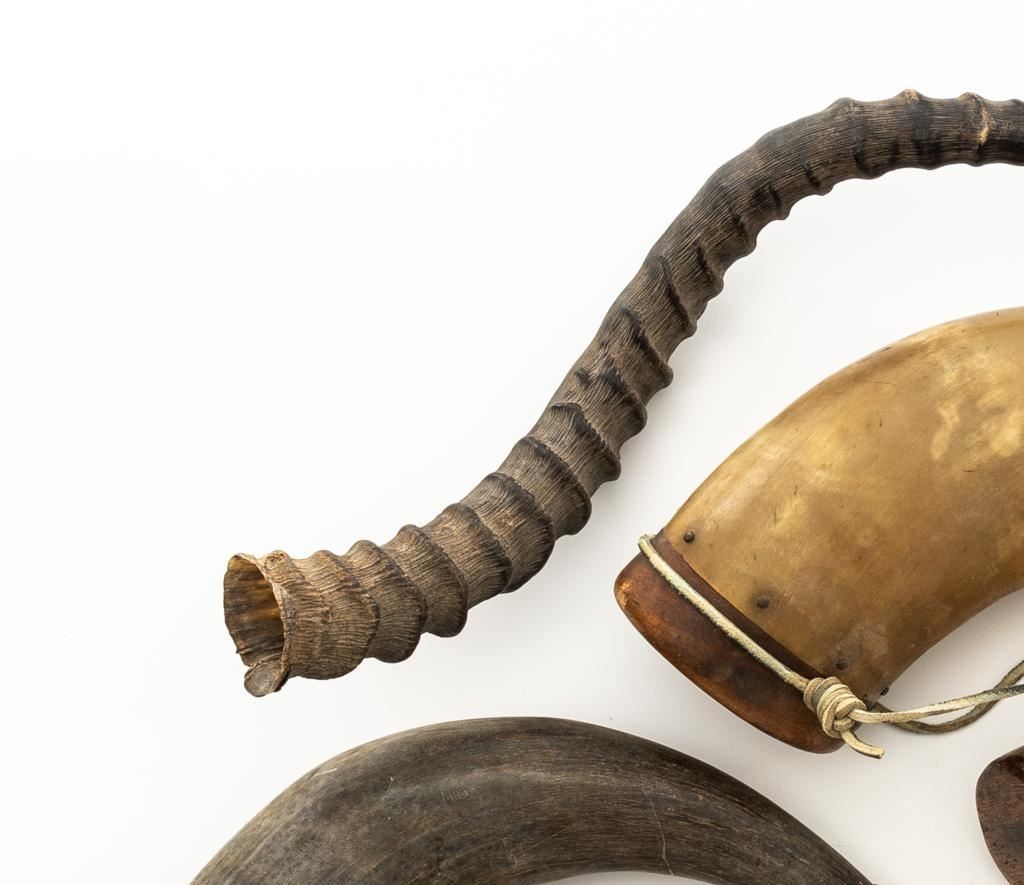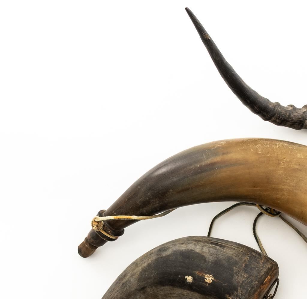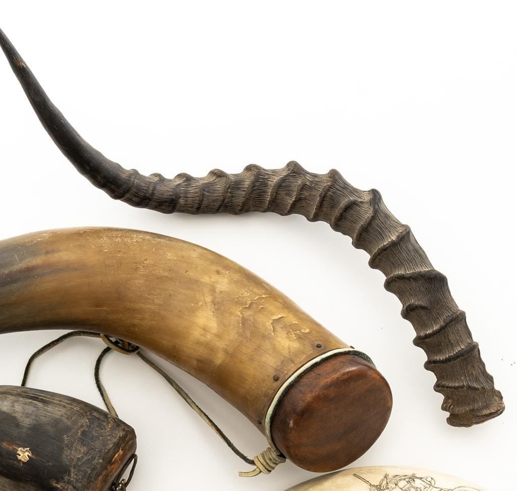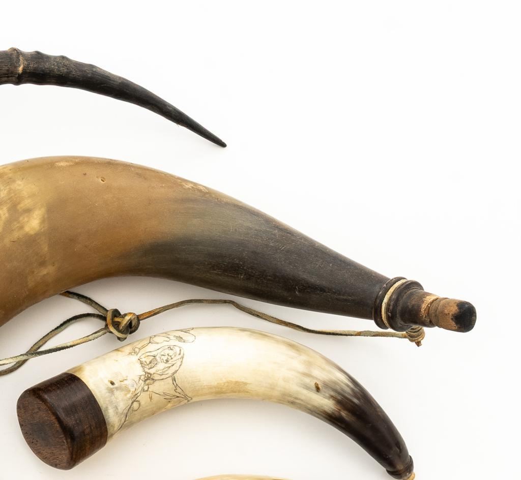 Lot of Nine (9) Misc. Powder Horns, ranging in size from approx. 16'' to 7'' overall, and in generally good condition. Ages vary but most appear to be older. One is hand carved and decorated in red and black; another with intricate ship engraving; third horn has what appears to be newer applied engraving of Native American and a bear. Several with stoppers and wooden base plugs. Most appear to be made of cow horn and one 17'' ibex horn. Est.: $200-$300/lot.(Michael Streitbeck Collection)