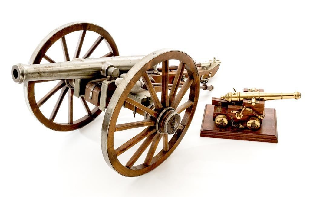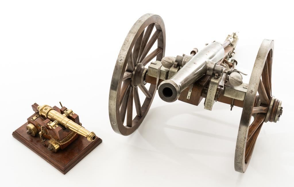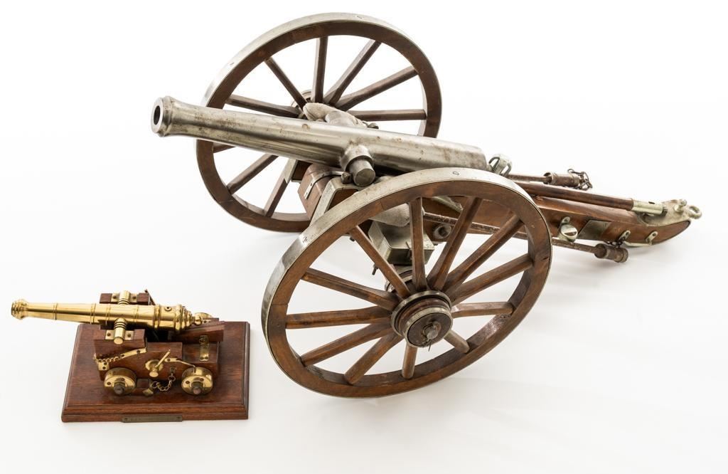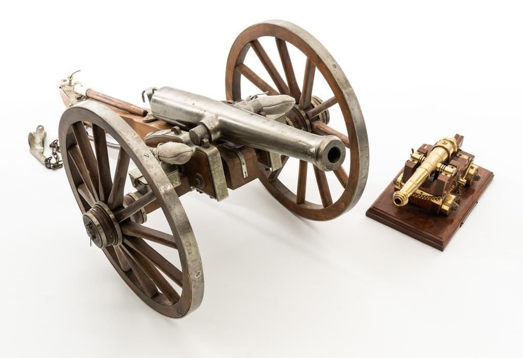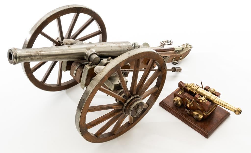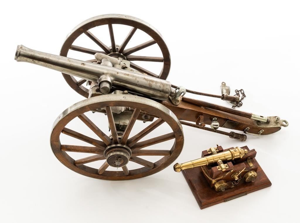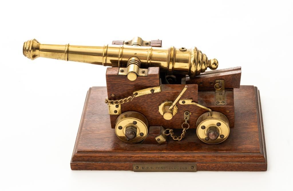 Lot of Two (2) Miniature Cannons: 1.) Unmarked Napoleon III Civil War style cannon, made in Spain, #H5379, barrel marked “MENDI” 14" barrel, wood carriage and 11.5" wood spooked wheels. Barrel weighs approx. 8lbs with a bore of .70''. Includes two swabbing rods and functioning storage boxes on either side. Overall condition is very good; barrel is in the white and has scattered areas of minor surface rust. Carriage, wheels, and accessories have scattered nicks and scratches but no visible cracks. Swabbing rods have noticeable bends. Both trunnions are missing 2.) Brass-plated desktop miniature naval cannon, 7" barrel, wood carriage, and brass wheels. Plaque on side reads ''U.S.S. CONNSTITUTION''. Overall condition is very good, displaying light handling marks. Est.: $300-$500/lot.