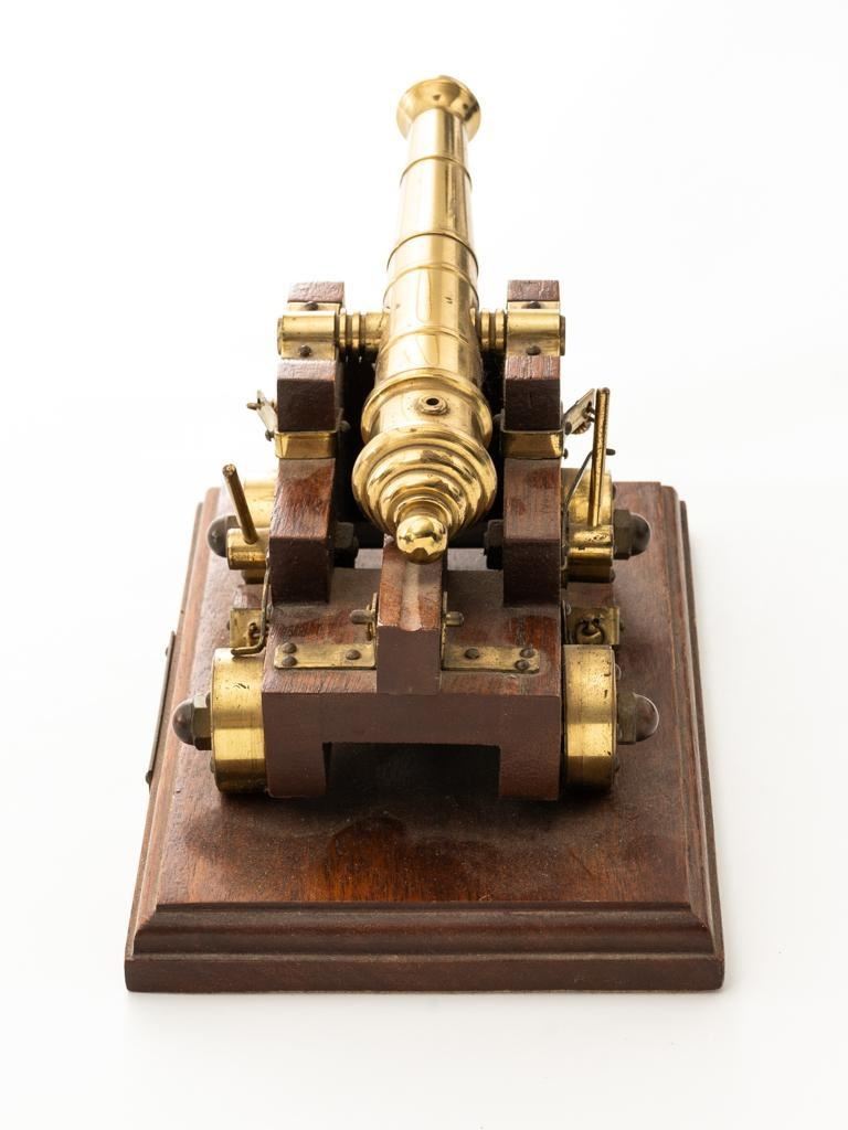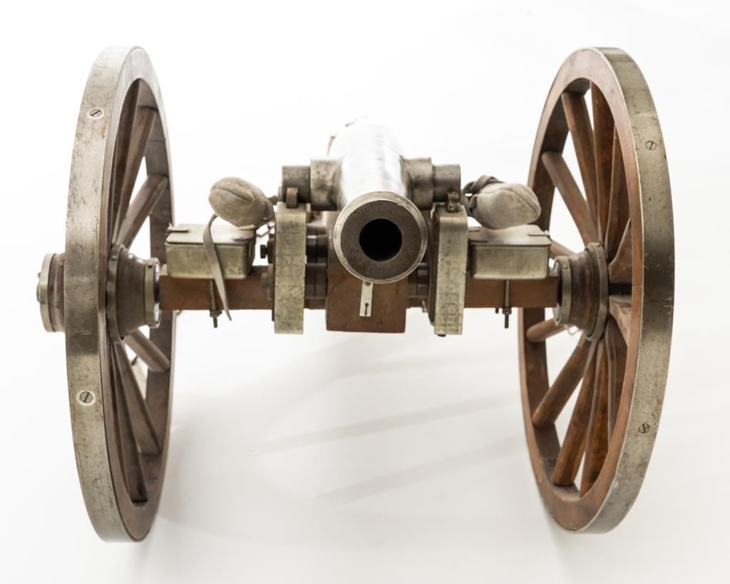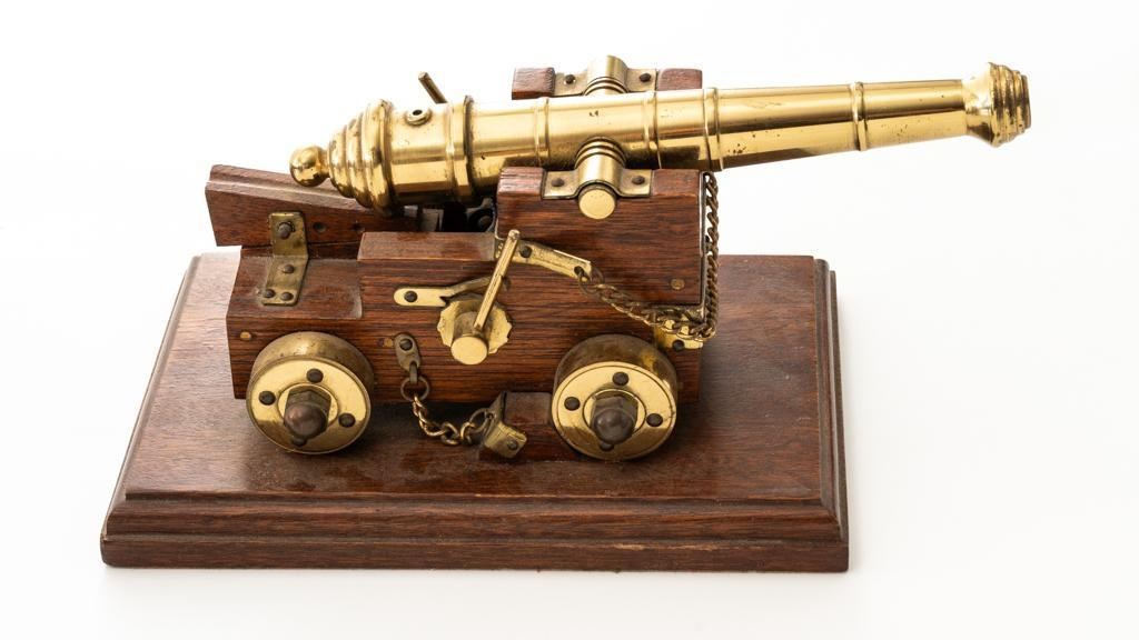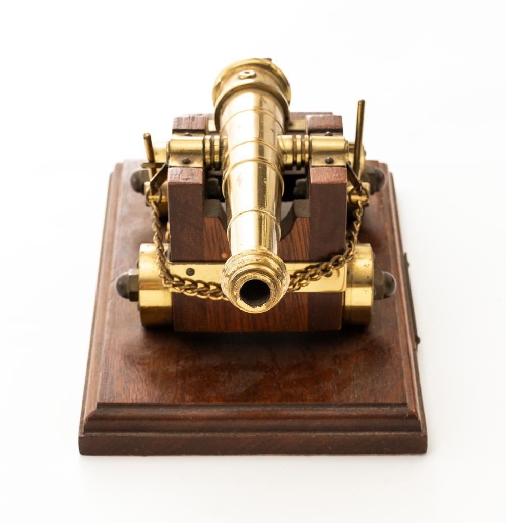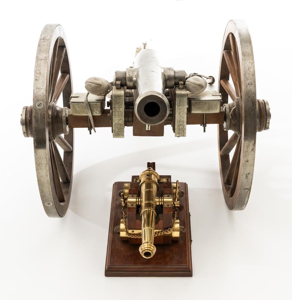 Lot of Two (2) Miniature Cannons: 1.) Unmarked Napoleon III Civil War style cannon, made in Spain, #H5379, barrel marked “MENDI” 14" barrel, wood carriage and 11.5" wood spooked wheels. Barrel weighs approx. 8lbs with a bore of .70''. Includes two swabbing rods and functioning storage boxes on either side. Overall condition is very good; barrel is in the white and has scattered areas of minor surface rust. Carriage, wheels, and accessories have scattered nicks and scratches but no visible cracks. Swabbing rods have noticeable bends. Both trunnions are missing 2.) Brass-plated desktop miniature naval cannon, 7" barrel, wood carriage, and brass wheels. Plaque on side reads ''U.S.S. CONNSTITUTION''. Overall condition is very good, displaying light handling marks. Est.: $300-$500/lot.