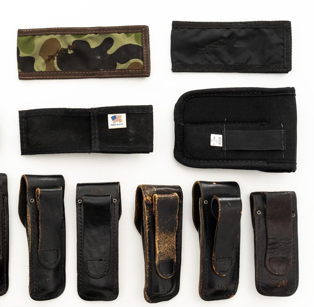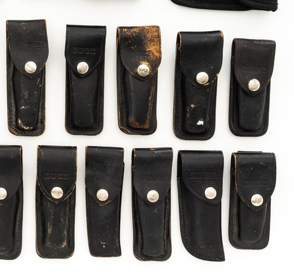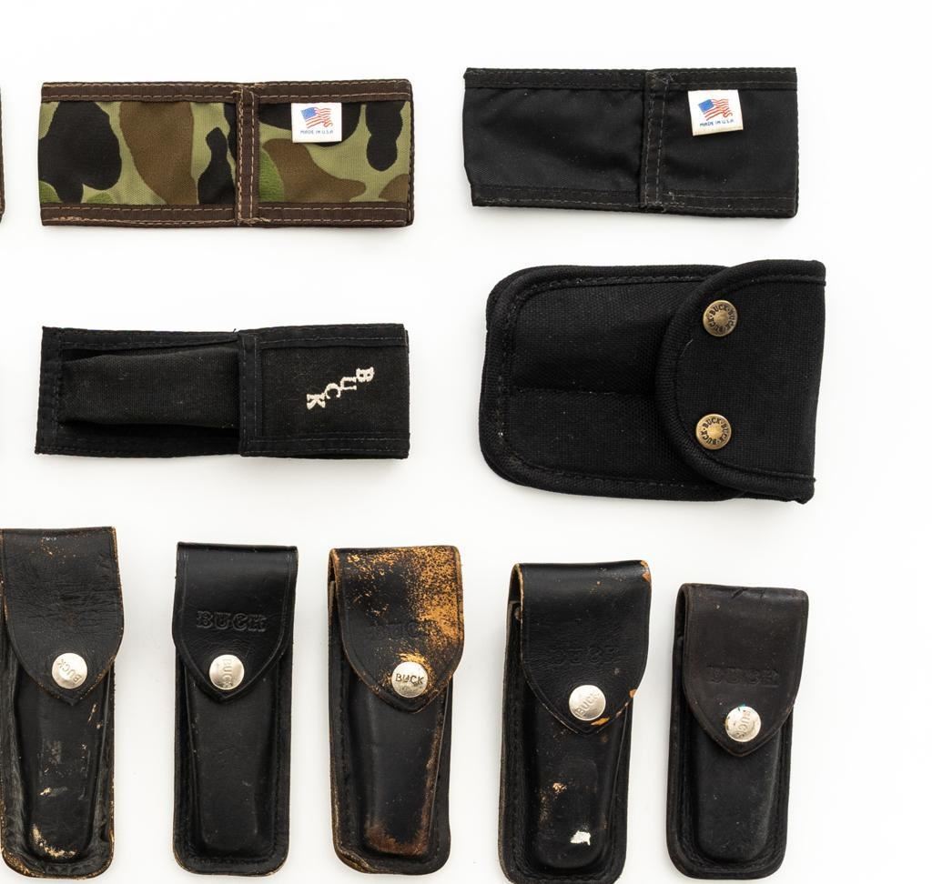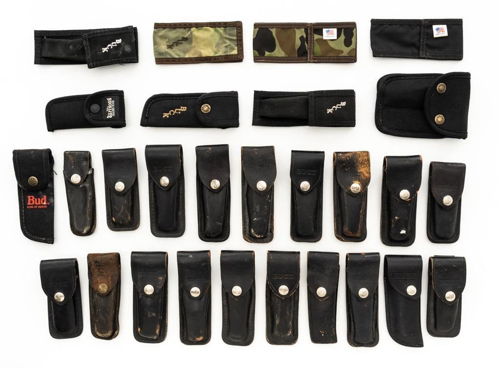 Lot of Twenty-Eight (28) Buck Knife Folding Knife Sheath/Pouches, most are leather but cordura nylon are also included. Five (5) are for Model 317, four (4) for Model 500, eight (8) for Model 110, eleven (11) are either unmarked or generic. Conditions range from poor to near excellent, showing varying degrees of age and wear, with most being in good used condition. Est.: $300-$500/lot.
