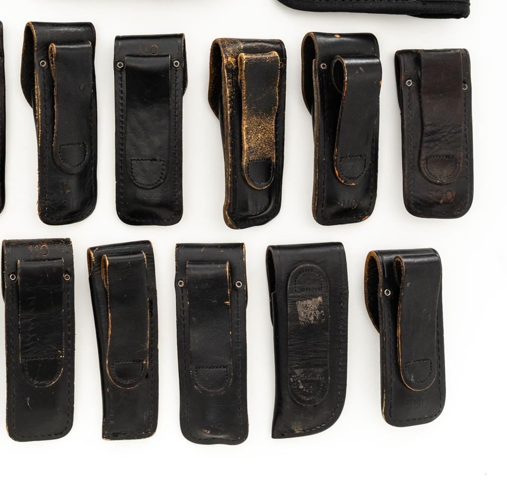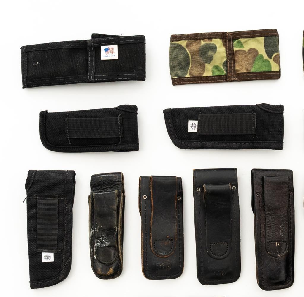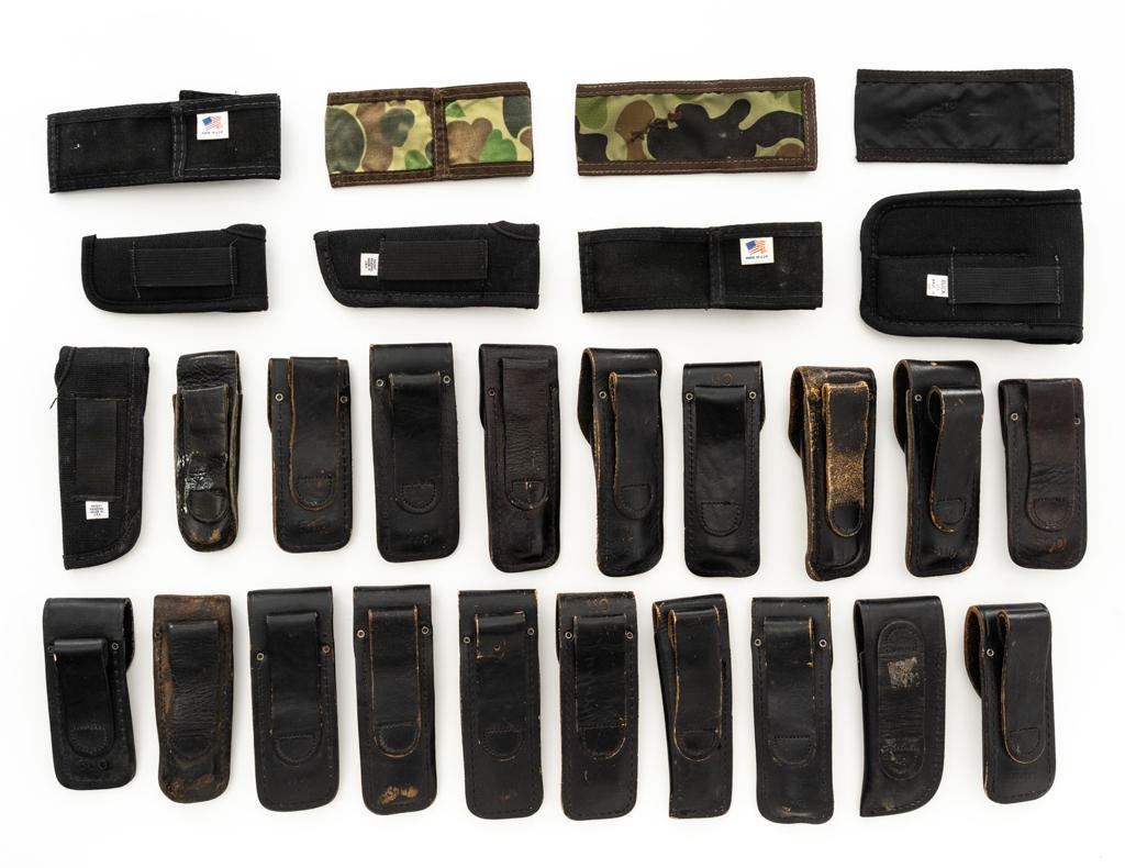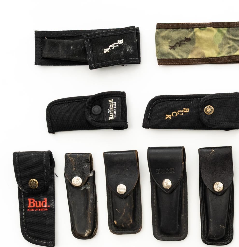 Lot of Twenty-Eight (28) Buck Knife Folding Knife Sheath/Pouches, most are leather but cordura nylon are also included. Five (5) are for Model 317, four (4) for Model 500, eight (8) for Model 110, eleven (11) are either unmarked or generic. Conditions range from poor to near excellent, showing varying degrees of age and wear, with most being in good used condition. Est.: $300-$500/lot.