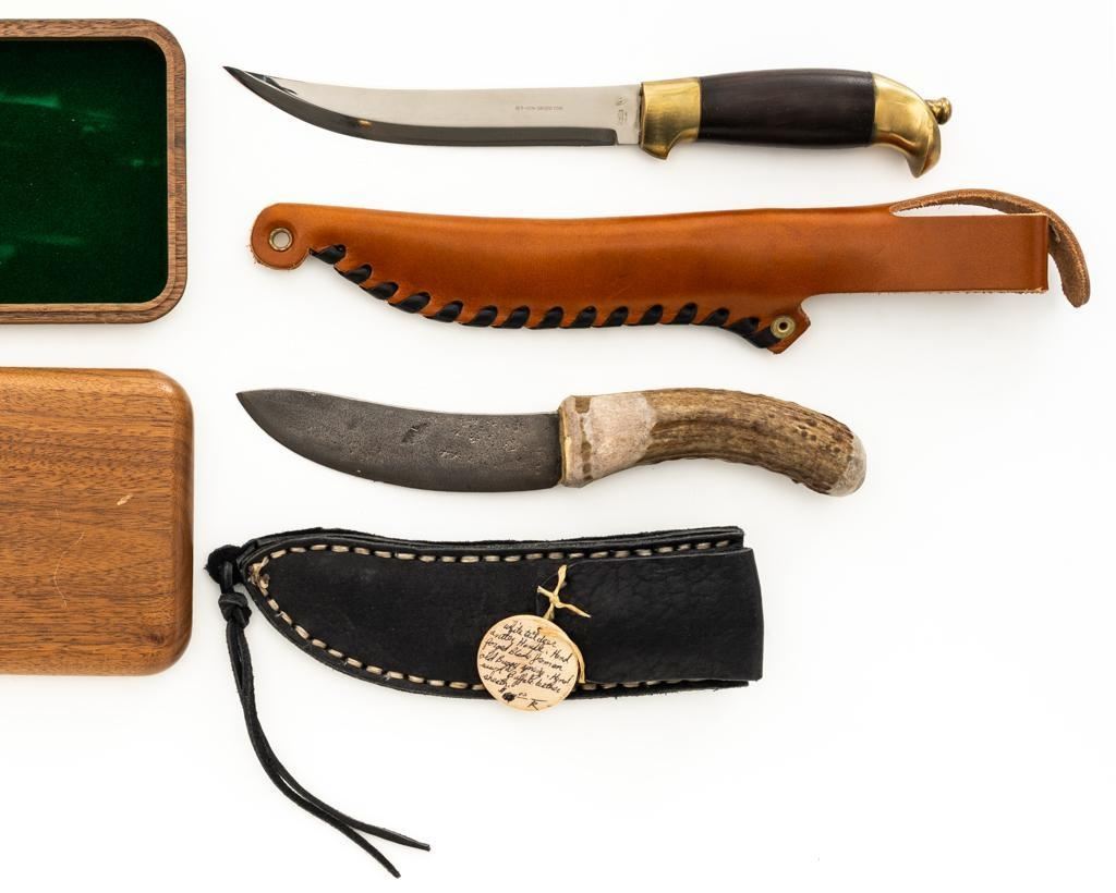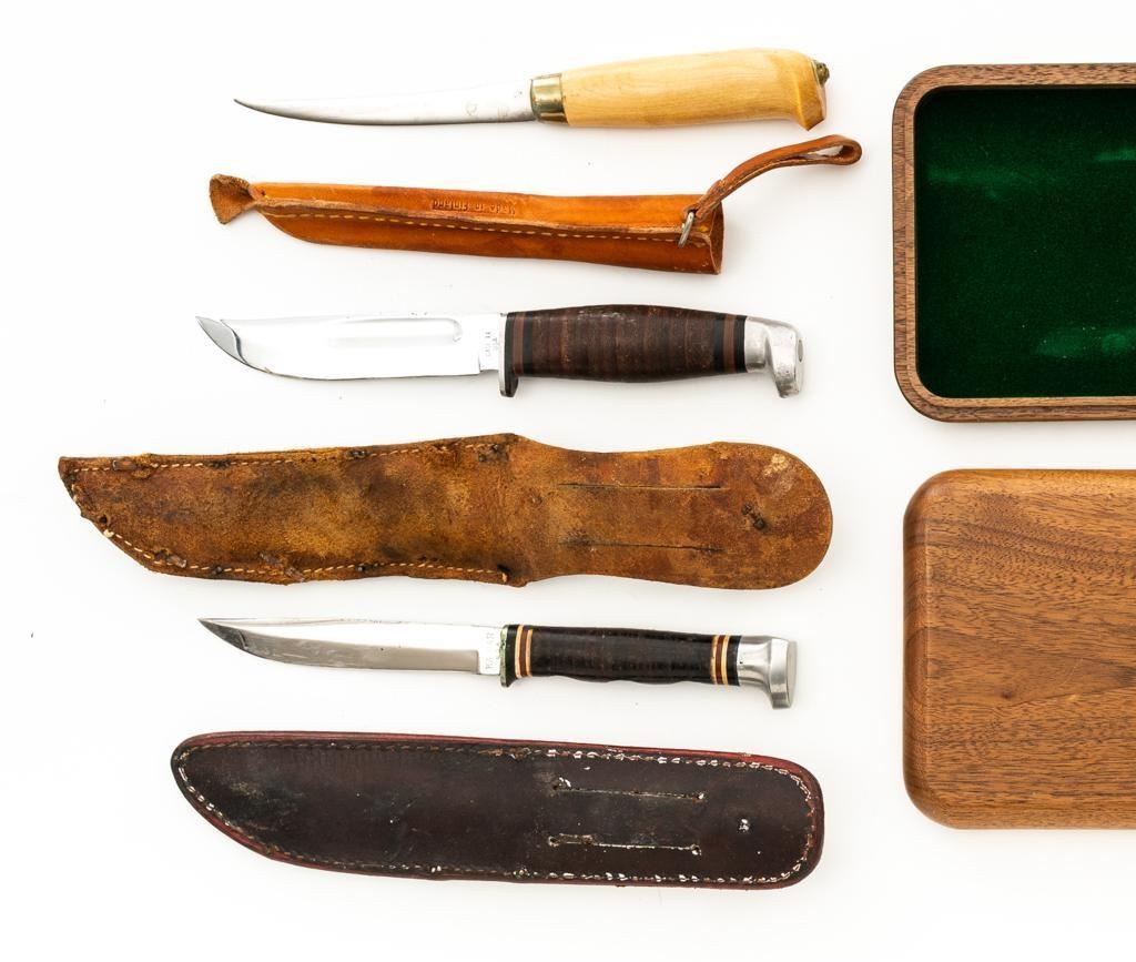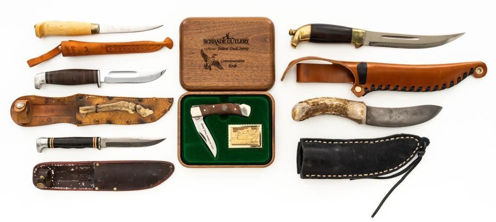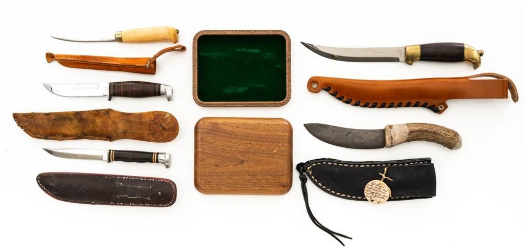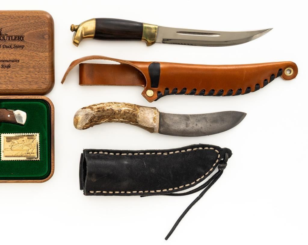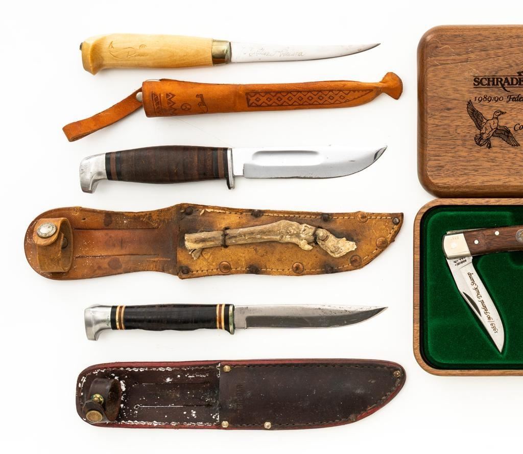 Lot of Six (6) Knives: 1.) Schrade 1989/90 Federal Duck Stamp Commemorative folding knife with wood case; in excellent condition. 2.) Helle Norway, 6.5'' fixed blade with sheath; in near excellent condition. 3.) KA-BAR, 4.25'' fixed blade with sheath; in very good used condition, finger grooves have been added to handle. 4.) Case, 4.25'' fixed blade with sheath; in very good used condition, blade has been sharpened. 5.) Rapala Finland, 4'' fixed blade with sheath; in very good used condition. 6.) Dakota Craftsman, hand forged 5'' fixed blade with sheath; in very good condition, with a small chip in blade. Est.: $150-$250/Lot.