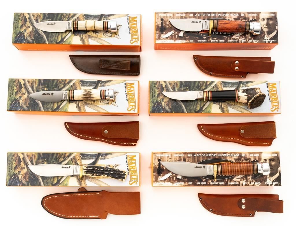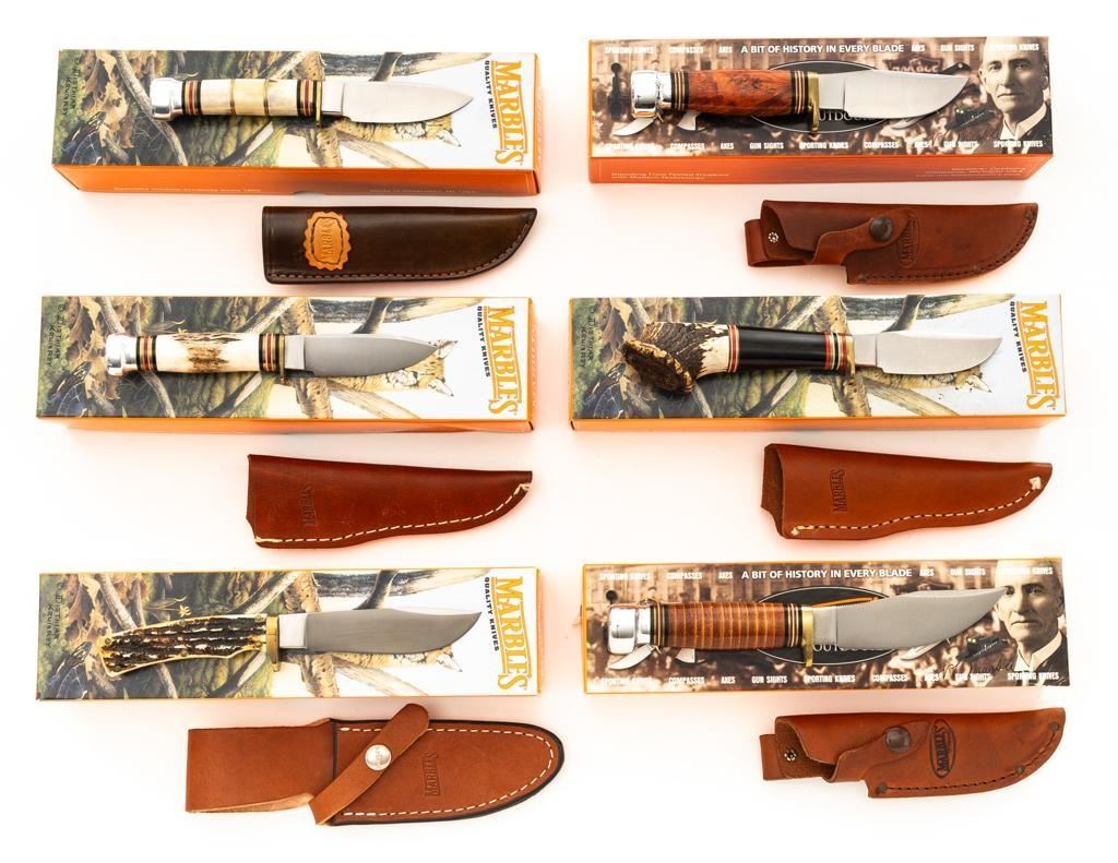 Lot of Six (6) Marbles Fixed Blade Knives: 1.) #72138010 Marlin, Stag/Aluminum. 2.) #72158584 Trailcraft, Buffalo/Crown Stag. 3.) #72138010 Marlin, Stag/Aluminum. 4.) #80202 Woodcraft, Stacked Leather. 5.) Trailcraft, Burled Maple. 6.) Marlin Campcraft 2000. All include matching factory box and sheath. Knives are in as new condition. Boxes are mostly excellent with storage wear. The box for #72158584 is creased and torn. Est.: $600-$1,000/lot.