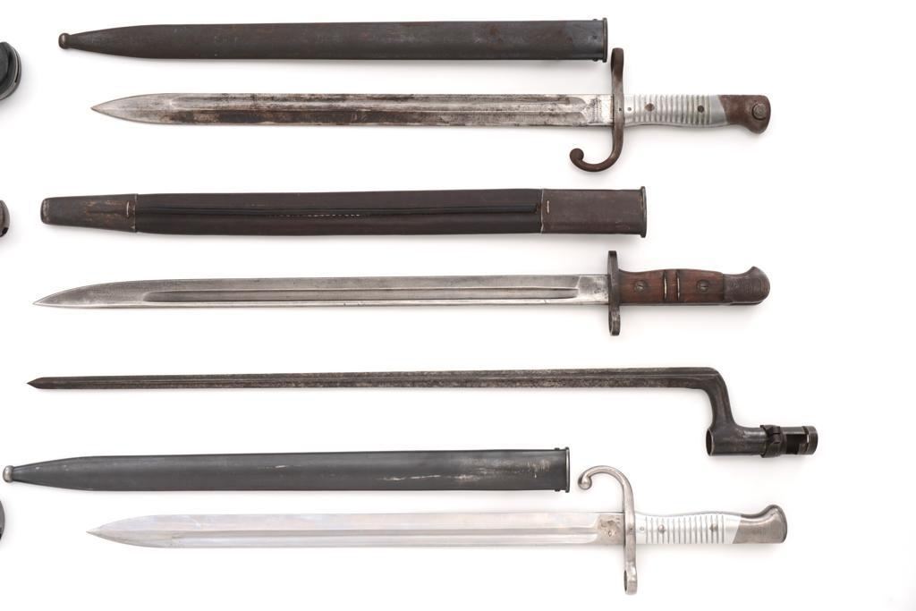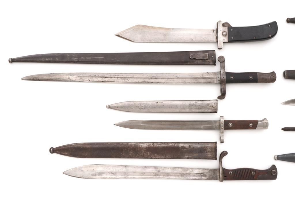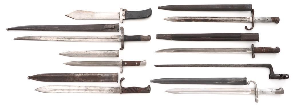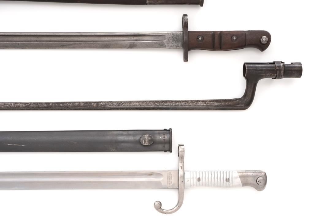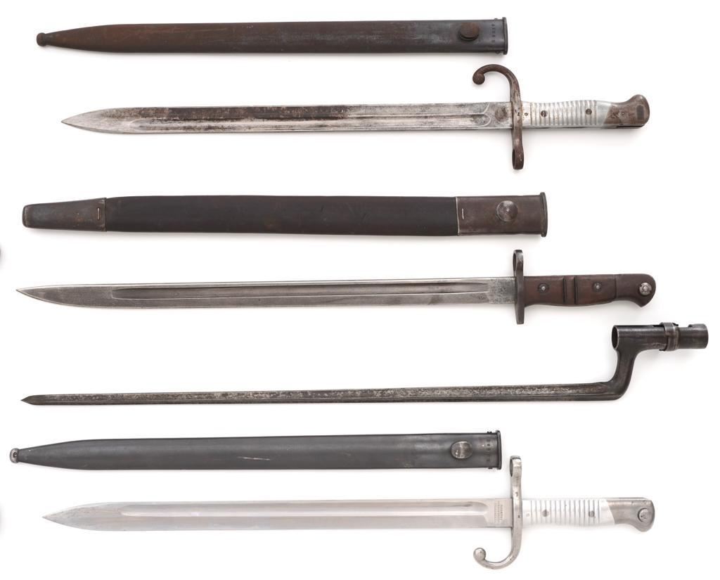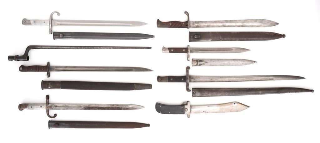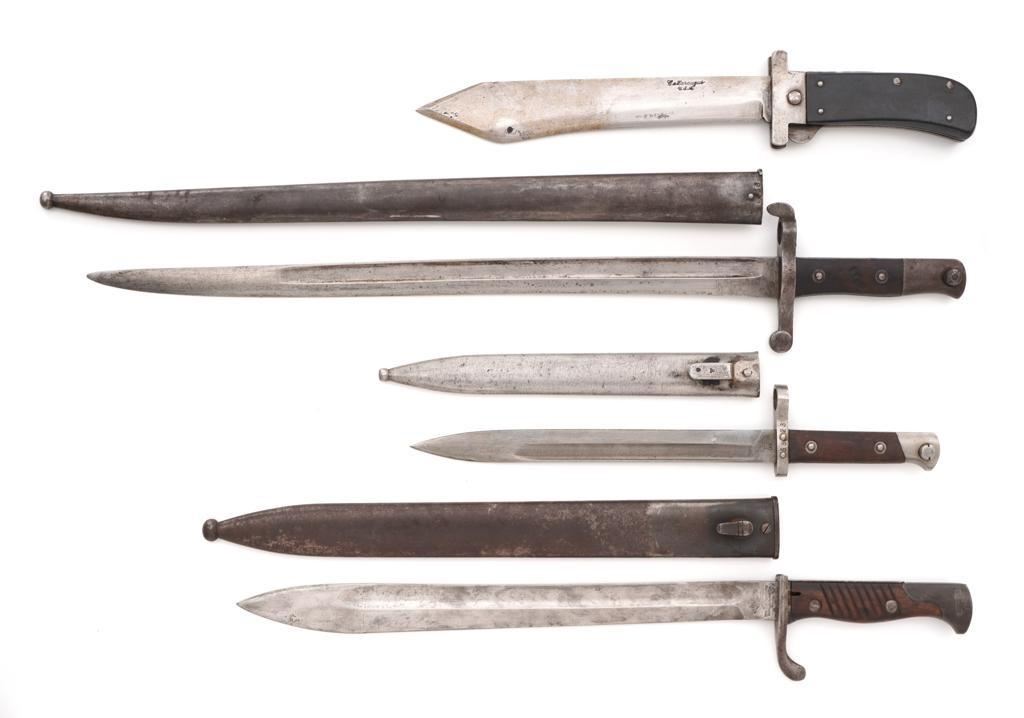 Lot of Seven (7) Bayonets and One Machete: 1.) Portuguese Steyr Model 1886 Kropatchek Bayonet & Scabbard. 2.) German 98/05 Bayonet & Scabbard, marked ''STAHLBLUME/(Angel)/FERD.SCHLEUTERMANN/REMSCHEID-HASTEN'' on blade ricasso and ''(Crown)/W/16'' on the spine. In good overall condition. 3.) Austrian M1895 with Scabbard, marked ''F.G.GY.'' with an Austrian Eagle on blade. 4.) British 1913 Pattern Bayonet with Scabbard, marked ''1913/3 17/REMINGTON'' on blade with British inspector's marks and Arabic numbers stamped on the pommel. 5.) Argentine Model 1891 Mauser Bayonet with Scabbard, marked ''WEYERSBERG/KIRSCHBAUM & Co/SOLINGEN''. The Argentine crest has been ground off. Bayonet and scabbard with matching numbers. 6.) Argentine Model 1891 Mauser Bayonet with Scabbard, marked ''WEYERSBERG/KIRSCHBAUM & Co/SOLINGEN''. The Argentine crest has been ground off. The serial number is partially ground off the blade but appears to match the number on the scabbard. 7.) Rolling Block Socket Bayonet, no scabbard, unmarked. 8.) Cattaragus USAAF Folding Machete, marked ''Cattaraugus/U.S.A.''. Tip of the blade has been reshaped into a spear point. Condition of all the items ranges from fair to very good, showing varying amounts of age and wear. Est.: $400-$700/lot.