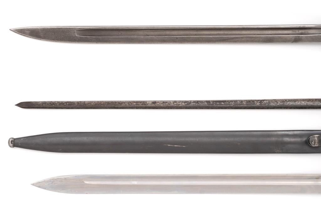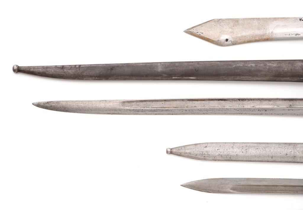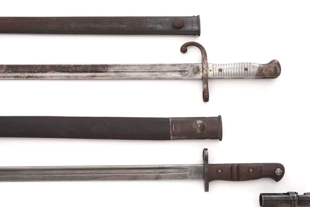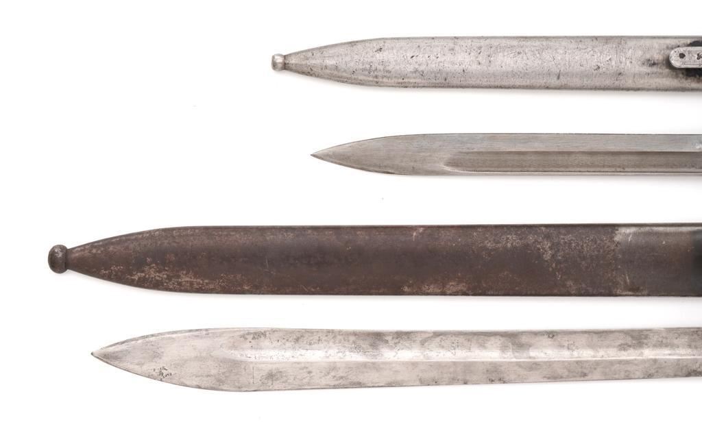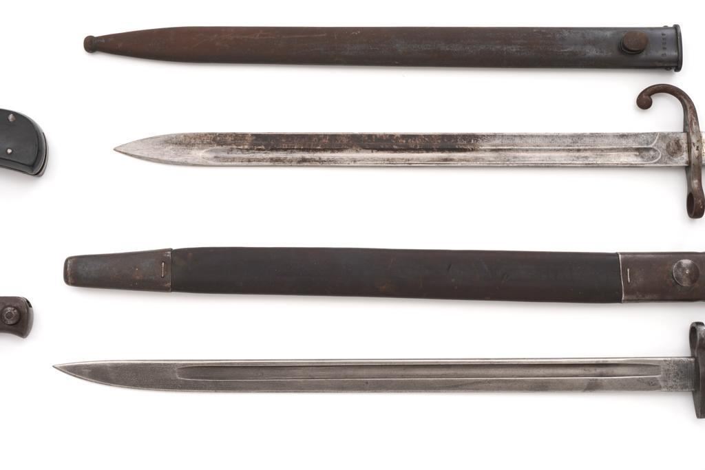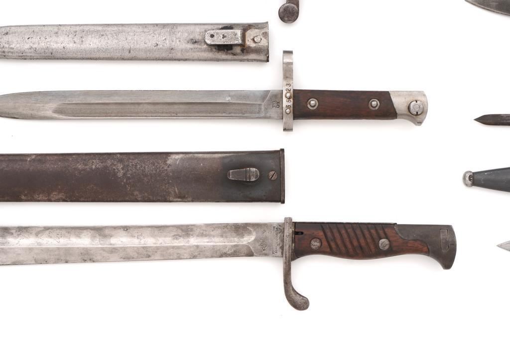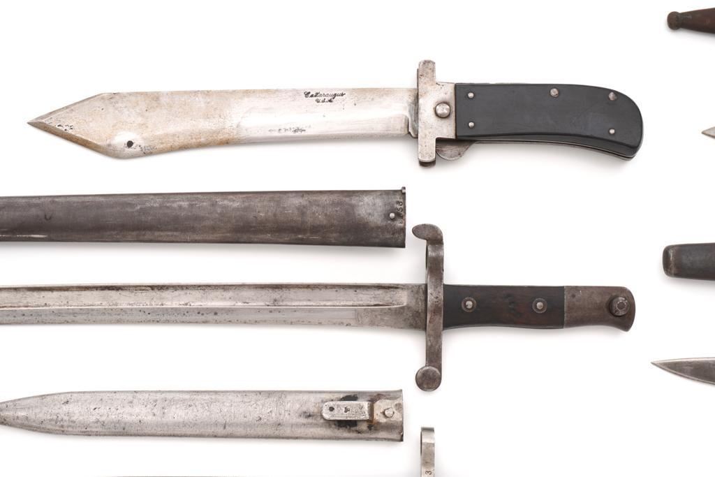 Lot of Seven (7) Bayonets and One Machete: 1.) Portuguese Steyr Model 1886 Kropatchek Bayonet & Scabbard. 2.) German 98/05 Bayonet & Scabbard, marked ''STAHLBLUME/(Angel)/FERD.SCHLEUTERMANN/REMSCHEID-HASTEN'' on blade ricasso and ''(Crown)/W/16'' on the spine. In good overall condition. 3.) Austrian M1895 with Scabbard, marked ''F.G.GY.'' with an Austrian Eagle on blade. 4.) British 1913 Pattern Bayonet with Scabbard, marked ''1913/3 17/REMINGTON'' on blade with British inspector's marks and Arabic numbers stamped on the pommel. 5.) Argentine Model 1891 Mauser Bayonet with Scabbard, marked ''WEYERSBERG/KIRSCHBAUM & Co/SOLINGEN''. The Argentine crest has been ground off. Bayonet and scabbard with matching numbers. 6.) Argentine Model 1891 Mauser Bayonet with Scabbard, marked ''WEYERSBERG/KIRSCHBAUM & Co/SOLINGEN''. The Argentine crest has been ground off. The serial number is partially ground off the blade but appears to match the number on the scabbard. 7.) Rolling Block Socket Bayonet, no scabbard, unmarked. 8.) Cattaragus USAAF Folding Machete, marked ''Cattaraugus/U.S.A.''. Tip of the blade has been reshaped into a spear point. Condition of all the items ranges from fair to very good, showing varying amounts of age and wear. Est.: $400-$700/lot.
