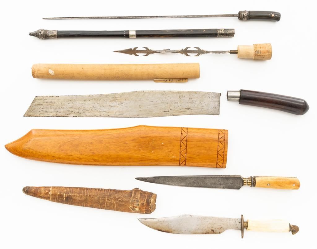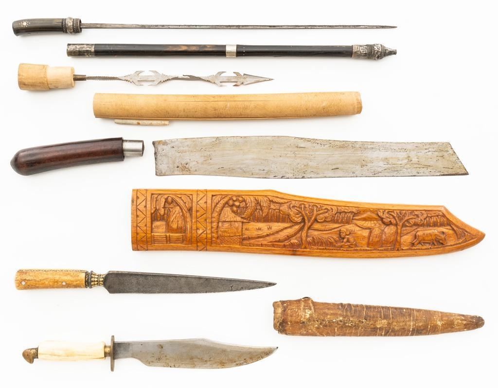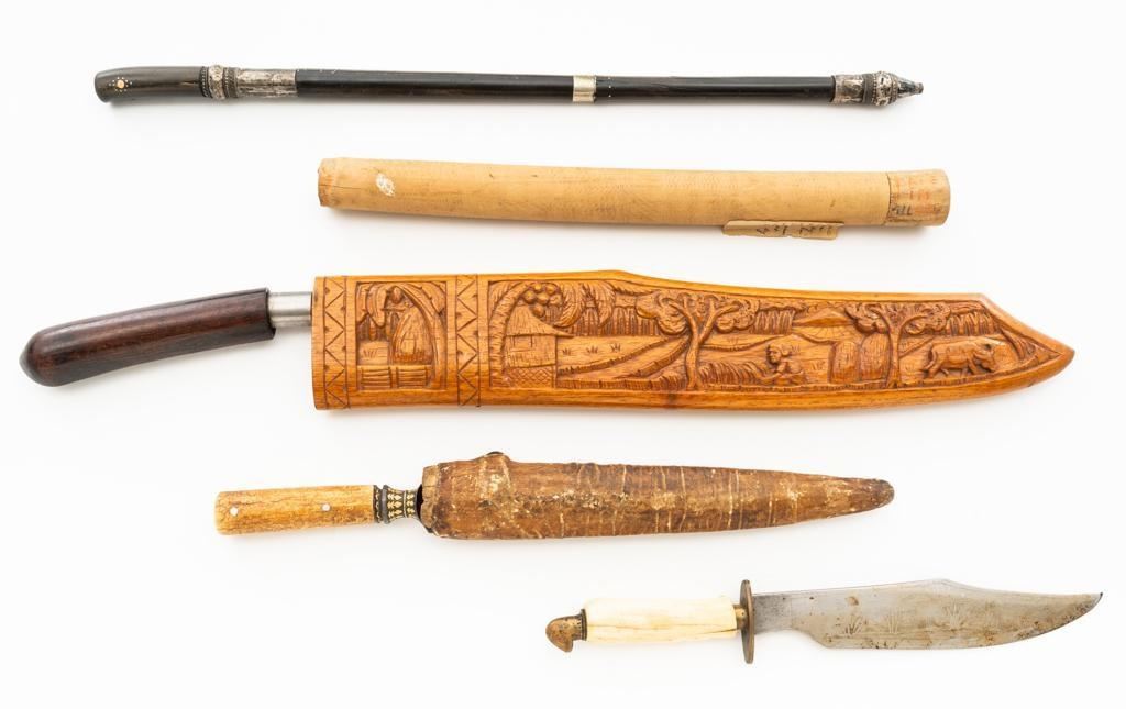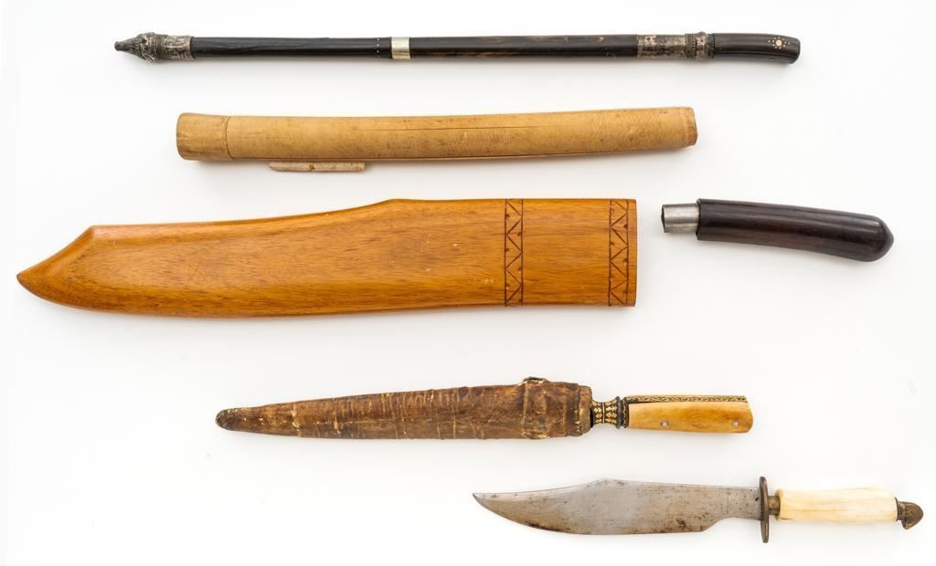 Lot of Five (5) Filipino and Afghan Knives: 1.) Filipino bowie knife, no sheath, 9'' acid etched blade with plants and volcanos, smooth bone handle; brass guard and head shaped pommel. Condition is good, showing age and wear. 2.) Stick sword with scabbard, 17.5'' four-sided needle point blade, inlaid horn handle, and bead embossed silver guard. Condition is good, showing age and wear, with a few dents to the guard. Scabbard is made from matching two piece horn with silver bolsters and end cap. Condition is good with a crack to the body. 3.) Afghan Choora type knife with scabbard, 9.25'' T-shaped unfullered blade, engraved and gold inlaid tang and guard; riveted two-piece bone handle. Condition is very good with forging marks and patina that shows a light recent sharpening. Scabbard has a wooden base wrapped with brown leather. Condition is fair showing age and wear. 4.) Filipino knife, 11'' blade with hooks and serrations, smooth round handle marked ''MADE IN VILLAGE''. Condition is good with patina spots to blade and toning to handle. Round tube scabbard fits into the handle. Condition is fair with a crack to one side. Owner's attached label identifies knife as brought home from Philippines. 5.) Broken Filipino machete, 17.5'' blade, and dark hardwood handle. Condition is poor, the blade tang has broken off inside the handle. Wooden scabbard is carved with a Filipino village scene on the right side. Condition is very good. Est.: $300-$500/lot.