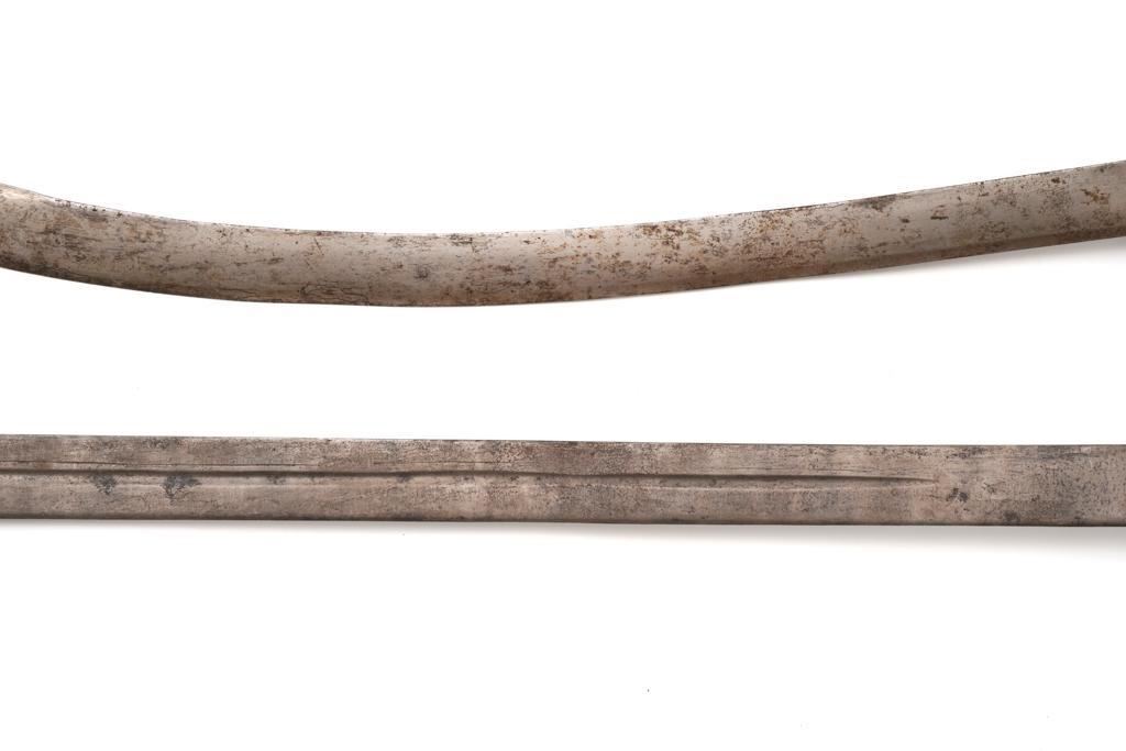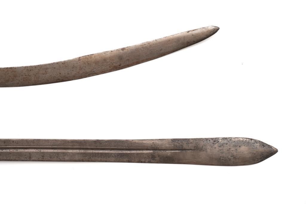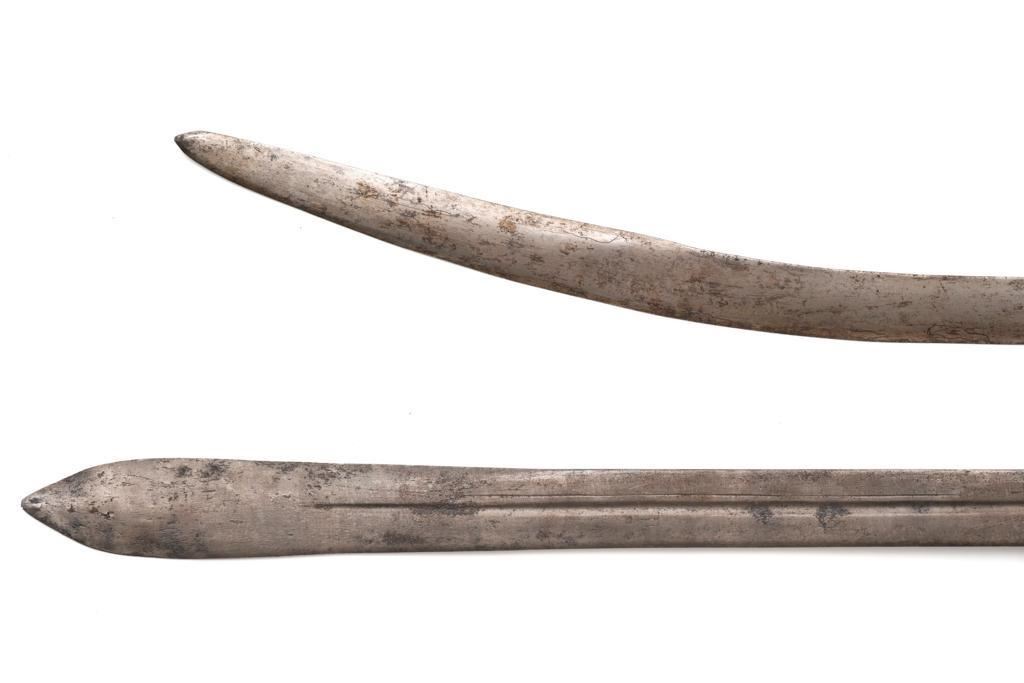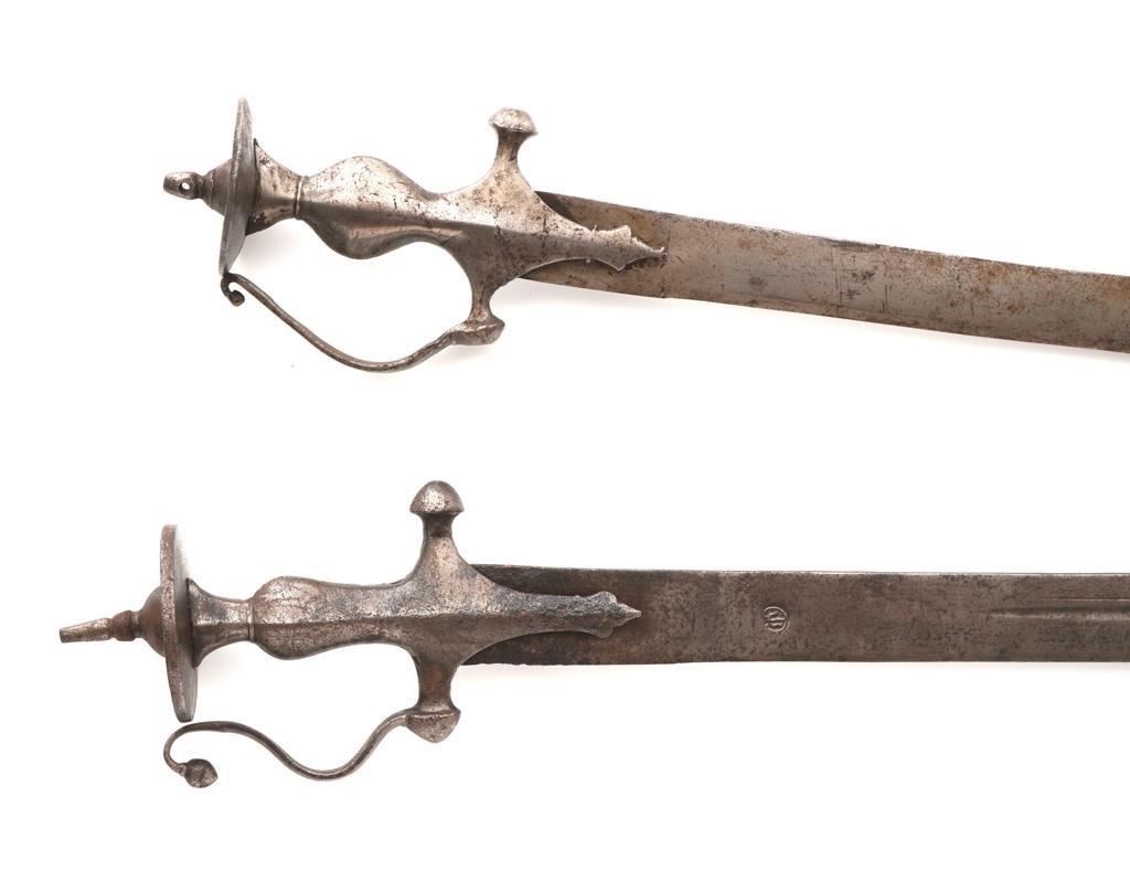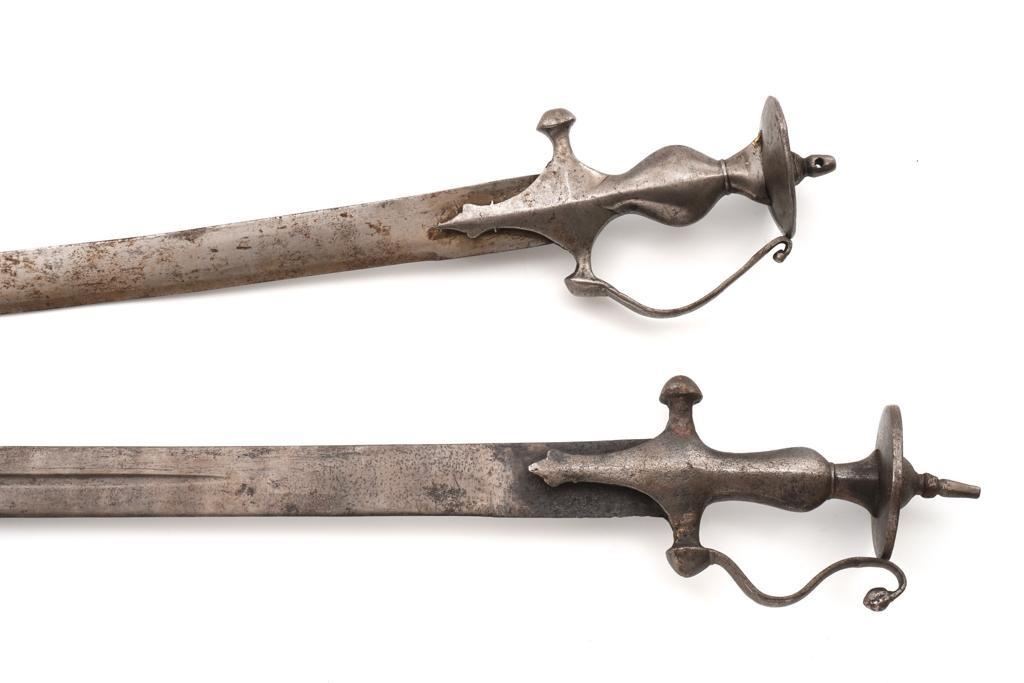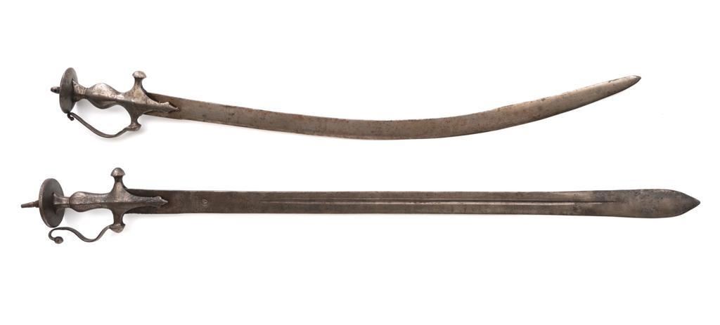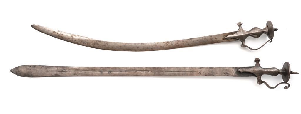Lot of Two (2) Indian Tulwar Swords: 1.) Indian tulwar with a rare straight blade, flared tip, and false back edge. Handle features disc pommel with finial, a knuckle bow, and langets. Blade is 34'' and has Sikh emblem on right side. Piece is 40'' overall. Likely 19th century, but blade could be older than the handle. 2.) Indian tulwar with typical disc pommel, knuckle bow, and langets on handle, with a heavily curved blade. Blade is 1.3'' at belly, 27.5'' from tip to ricasso, and 35'' from tip to pommel finial. Likely 19th century. Condition of both is good. Straight blade with scattered spots of cleaned moderate pitting. Both show age and wear. Est.: $500-$700/lot.