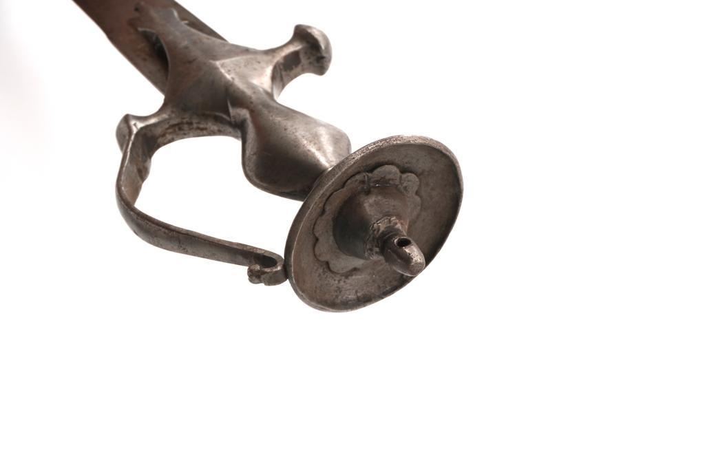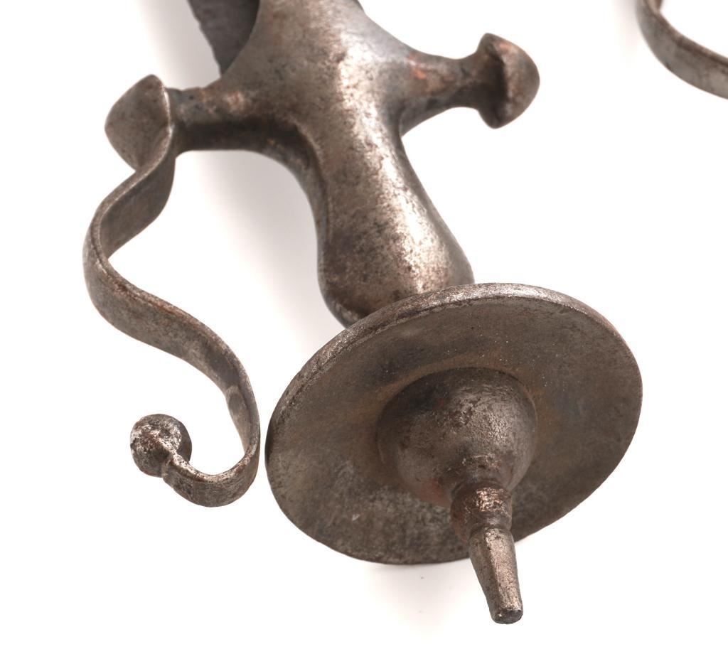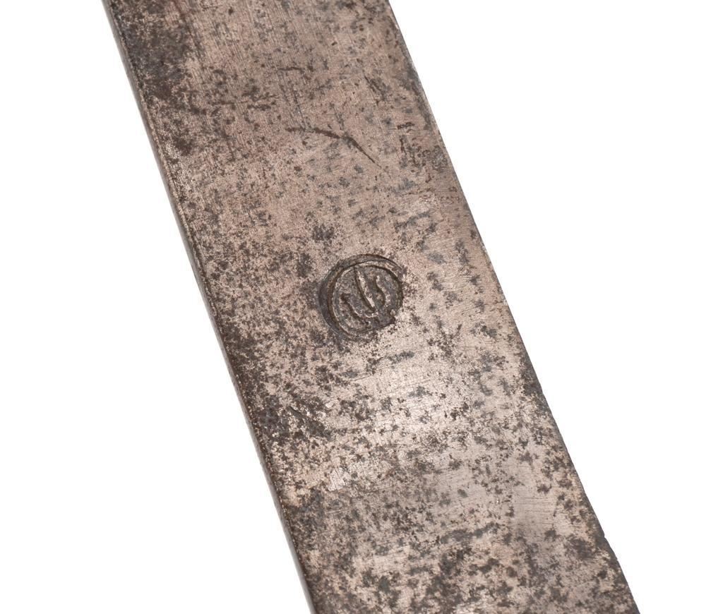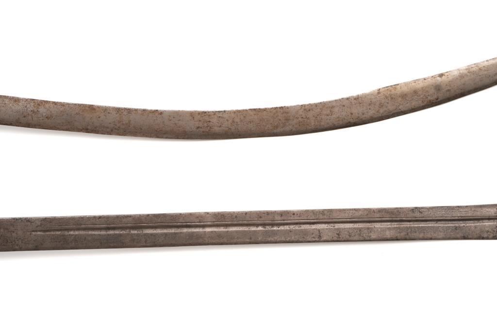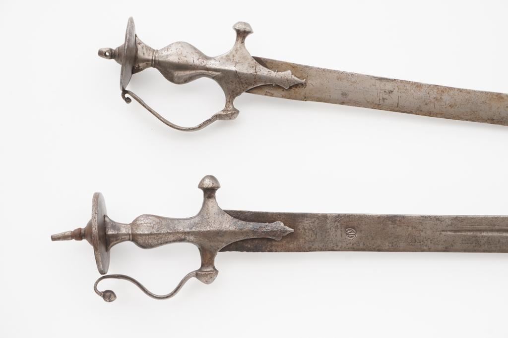 Lot of Two (2) Indian Tulwar Swords: 1.) Indian tulwar with a rare straight blade, flared tip, and false back edge. Handle features disc pommel with finial, a knuckle bow, and langets. Blade is 34'' and has Sikh emblem on right side. Piece is 40'' overall. Likely 19th century, but blade could be older than the handle. 2.) Indian tulwar with typical disc pommel, knuckle bow, and langets on handle, with a heavily curved blade. Blade is 1.3'' at belly, 27.5'' from tip to ricasso, and 35'' from tip to pommel finial. Likely 19th century. Condition of both is good. Straight blade with scattered spots of cleaned moderate pitting. Both show age and wear. Est.: $500-$700/lot.