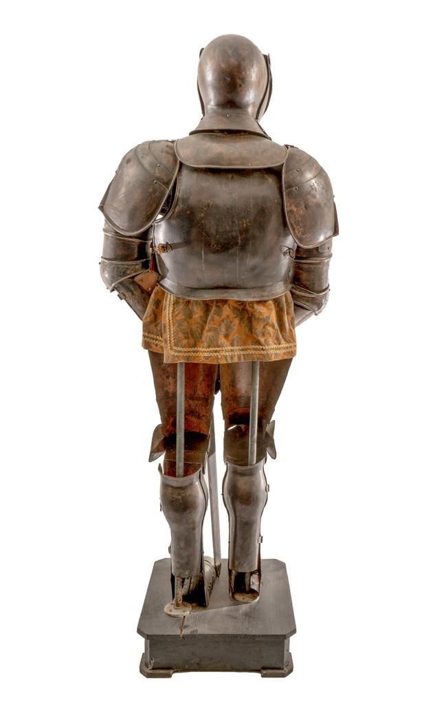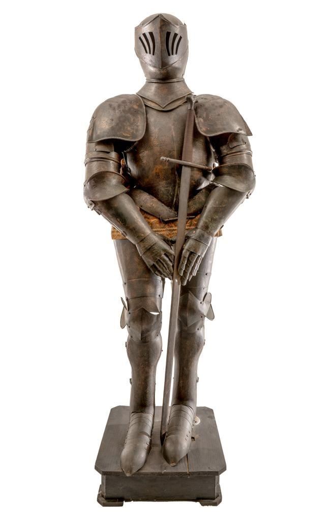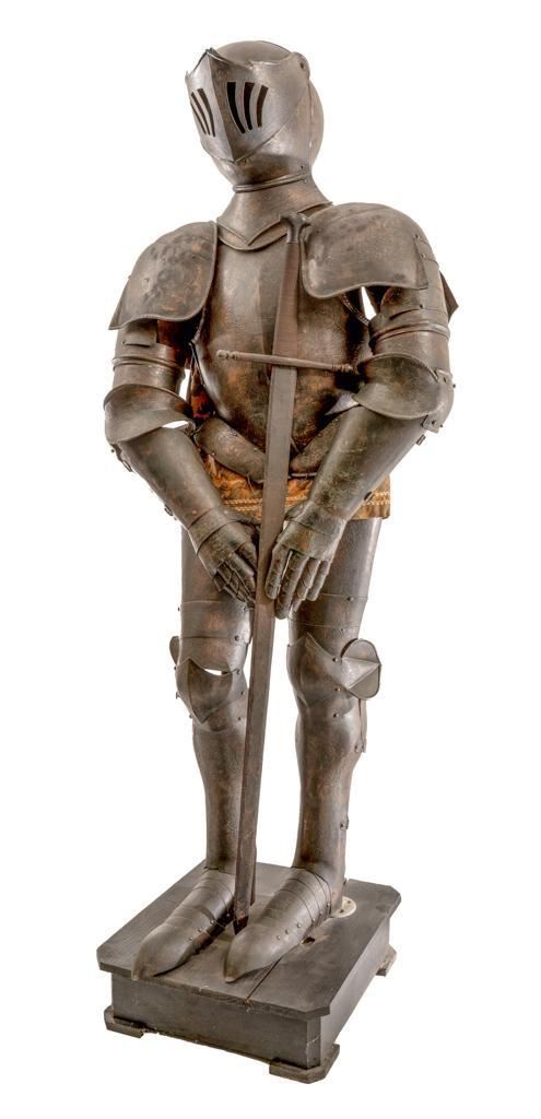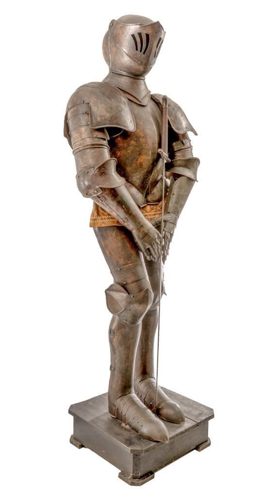 Complete Reproduction Suit of High Medieval Knights Armor and Sword, likely late 19th or 20th century production in a 16th century style. Suit is etched throughout and interlocking plates are riveted together. Whole suit is 64'' tall. Sword features a wire wrapped handle, fishtail pommel, and cruciform hilt with quillons terminating in spherical finials. Blade is marked Toledo two inches above hilt. Blade is 41.5'' and sword is 51.75'' overall and appears contemporary with armor. Armor is in very good overall condition, showing a nice, aged appearance with dark patination; scattered spots of rust patina and verdigris. Nicely constructed with detailed etched patterns. Est.: $700-$900.