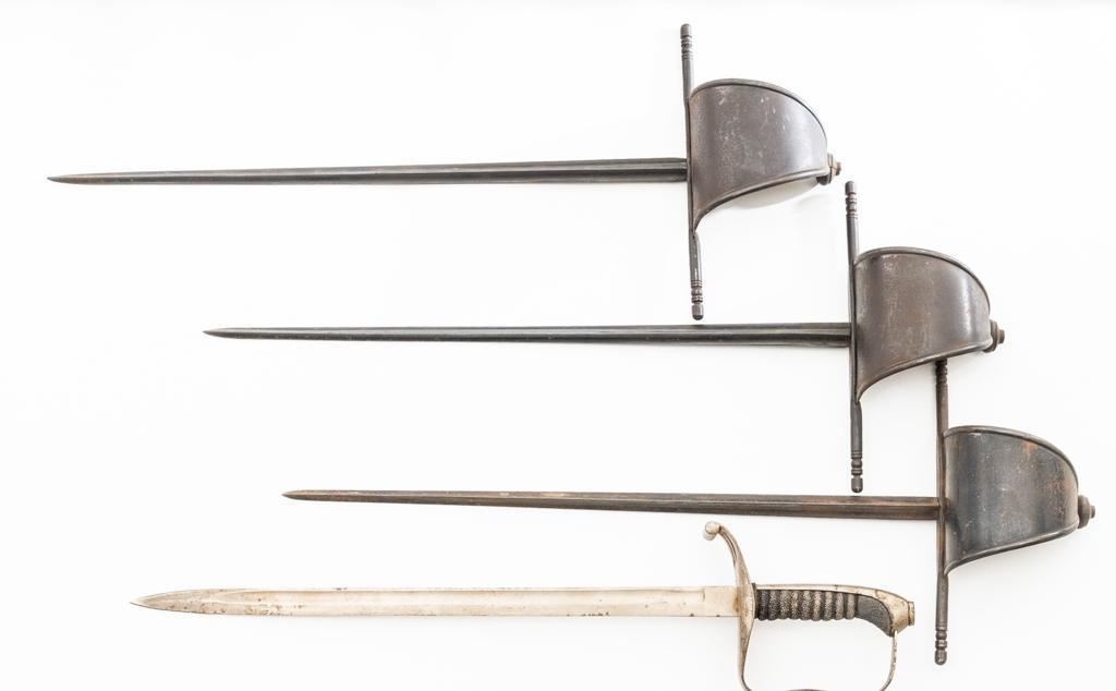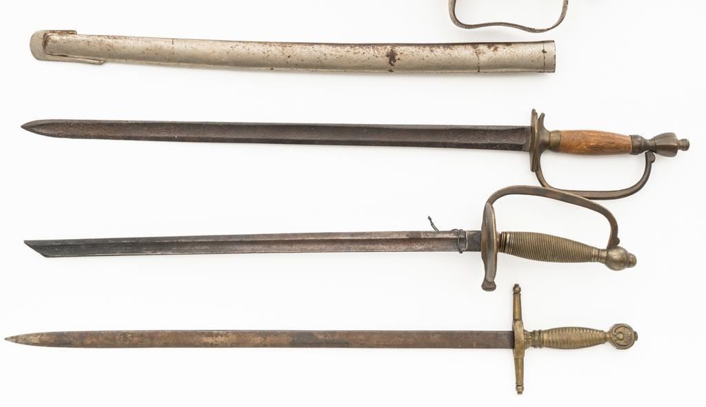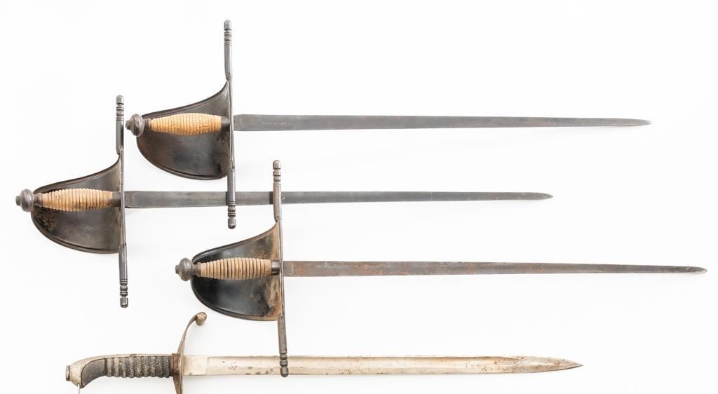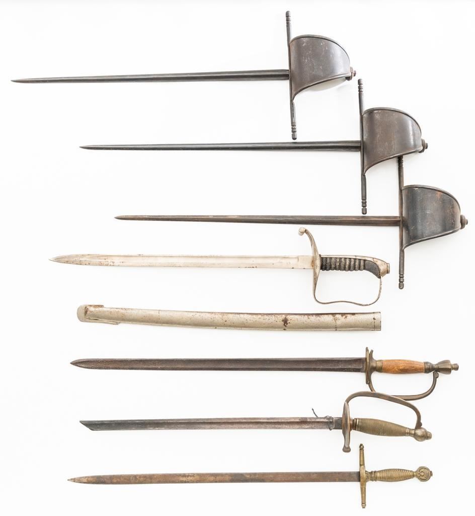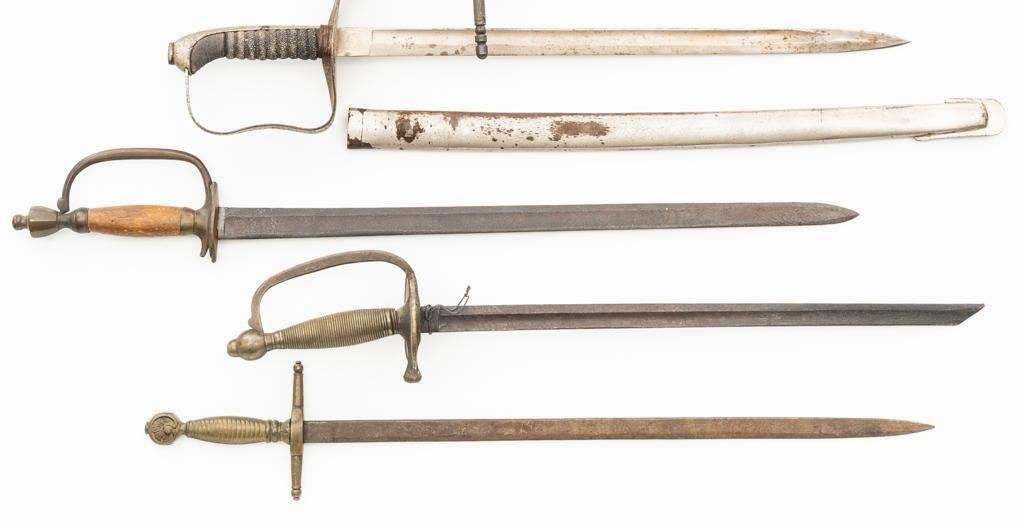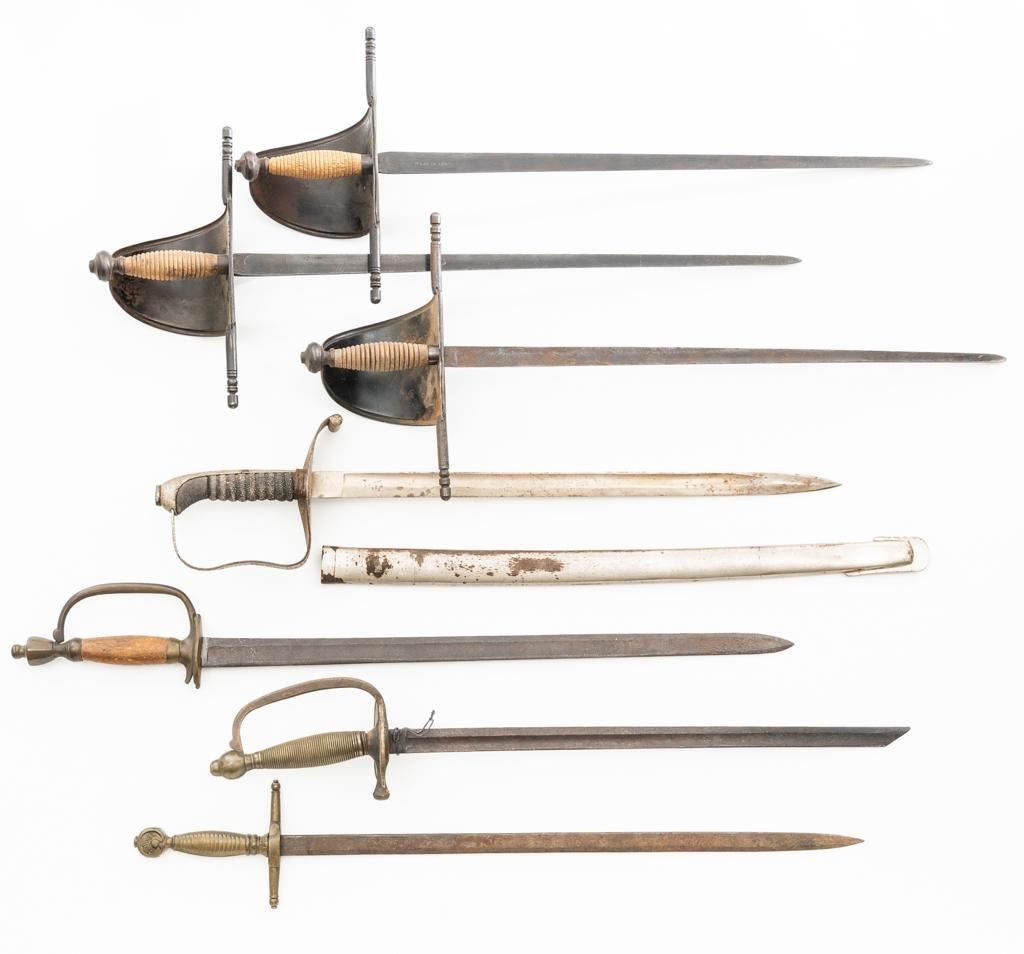 Lot of Seven (7) Swords: 1.) Knuckle bow sword, 21'' blade with attached brass guard and angular pommel. Made from a relic sword blade. No scabbard. Condition is fair, blade is poor with old pitting. 2.) Brass hilted sword, 20.5'' single edged blade with spear point. Ribbed brass grip and straight guard. Round pommel embossed with French style ''Flaming Grenade''. No scabbard. Condition is good with dark patina and sharpening to the blade. 3.) Broken U.S Model 1840 Non Commissioned Officer's sword, 18.5'' single fuller blade, brass knuckle bow grip with integral wire wrap, full clamshell guard and round pommel. Ricasso is marked ''U.S./DFM/1863''and ''EMERSON & SILVER''. Condition is poor, the blade has broken off and the tip has been reshaped into a clipped point. 4.) Plated short sword with scabbard, 19.1'' single edged blade, pierced guard decorated with floral motifs and quillon with forward rolled edge. Shark skin covered grip with dove head pommel. Condition is good with finish loss and patina to the blade and hilt. Wire wrap is missing from the grip. 5-7.) Reproduction Rapier swords, 21'' blued three sided blades, straight guard with round finials, wide sheet metal hand protector, and flattened pommel. Ribbed hardwood handle. Top of blade engraved ''MADE IN SPAIN''. Condition ranges from fair to good with dents to the blade edges, rust, and patina. Est.: $300-$500/lot.