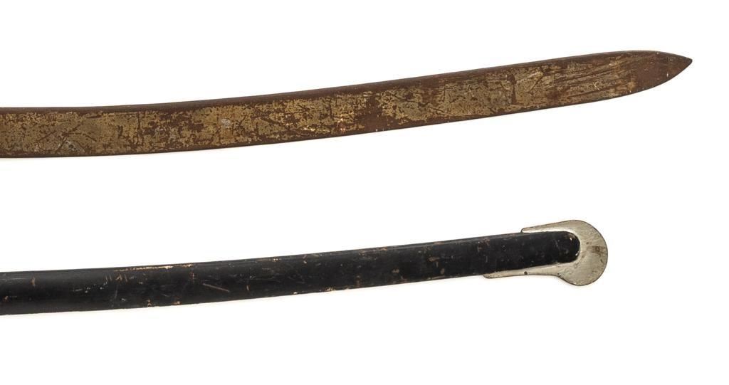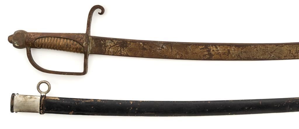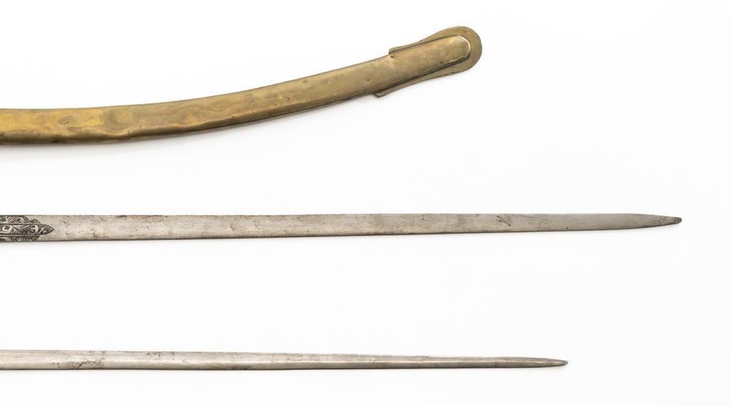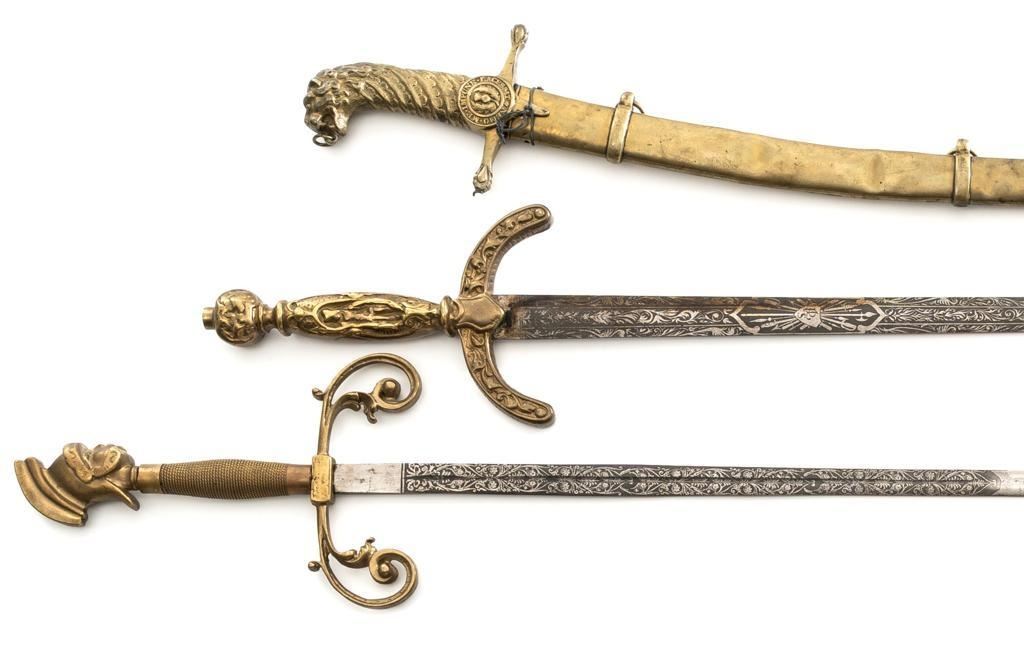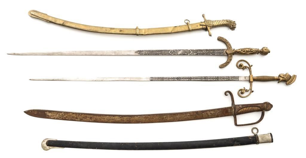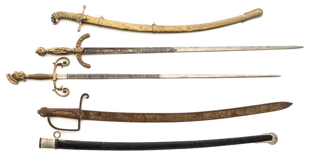 Lot of Four (4) Reproduction/Modern Swords & One Scabbard: 1.) Modern reproduction steel saber scabbard with single ring for suspension and smaller side ring. 35.25'' overall. 2.) Cast reproduction of Revolutionary or Napoleonic War era heavy cavalry sabre with full D-guard and rear swept quillon. Blade is 32.5'' long, uniform width throughout with no edge; 38.75'' overall. 3.) Modern ceremonial sword with one-piece brass handle construction and etched 35.5'' blade; 42.5'' overall. Features forward swept hilt and globe pommel. 4.) Modern decorative sword with one-piece brass handle construction, forward swept quillons, and pommel in shape of Roman legionnaires head, and etched 35'' blade; 42.75'' overall. 5.) Decorative or ceremonial reproduction of shamshir or mameluke style curved sword with brass scabbard and handle; lion head pommel. Features Latin inscription on crest near hilt. 34.25'' overall with scabbard. Blade is 27.25'' from tip to ricasso. Reproduction cavalry sabre is in fair condition, with patina and light rust throughout. Other items are in very good overall condition. Est.: $200-$350/lot.