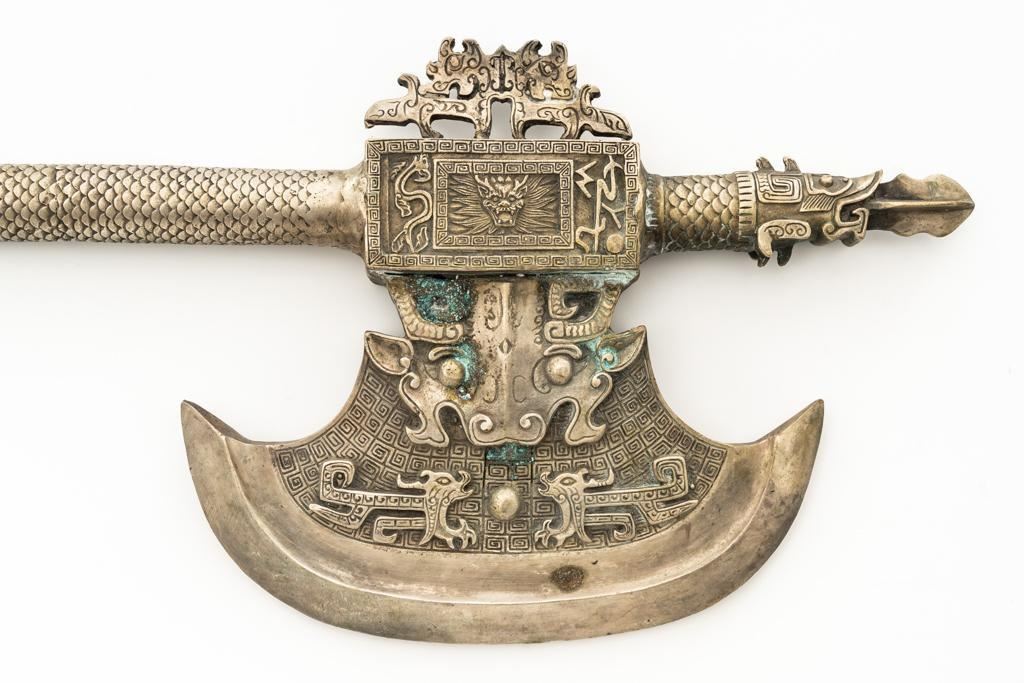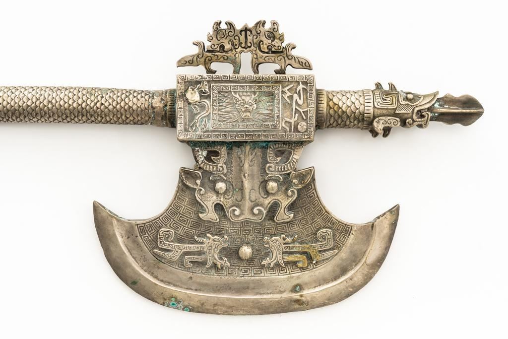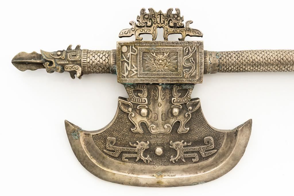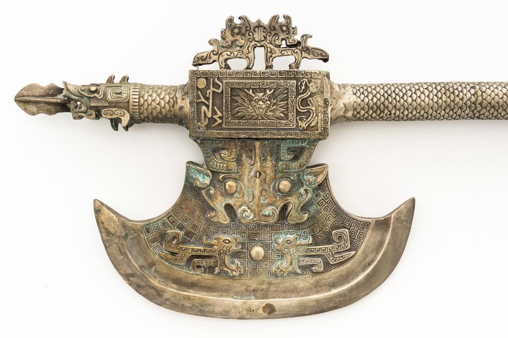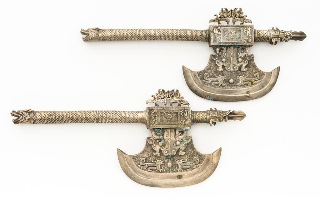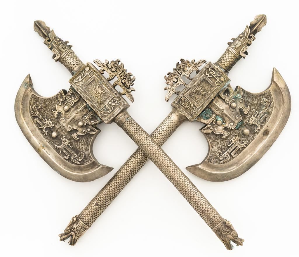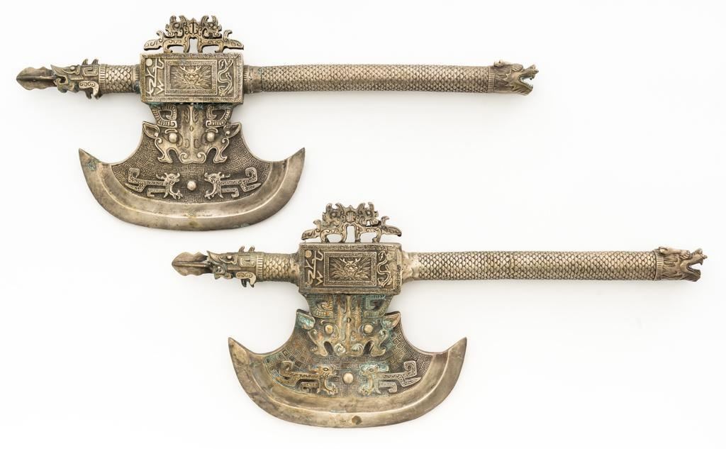 Lot of Two (2) 20th century Tibetan Style Metal Broad Axes, 21'' in length, 9'' at the widest part, weighing approx. 5lbs 11oz each, silver colored finish, handles are hollow. These are most likely made of brass or bronze. Both are in near excellent condition, showing patina and light handling marks. Est.: $300-$500/lot.