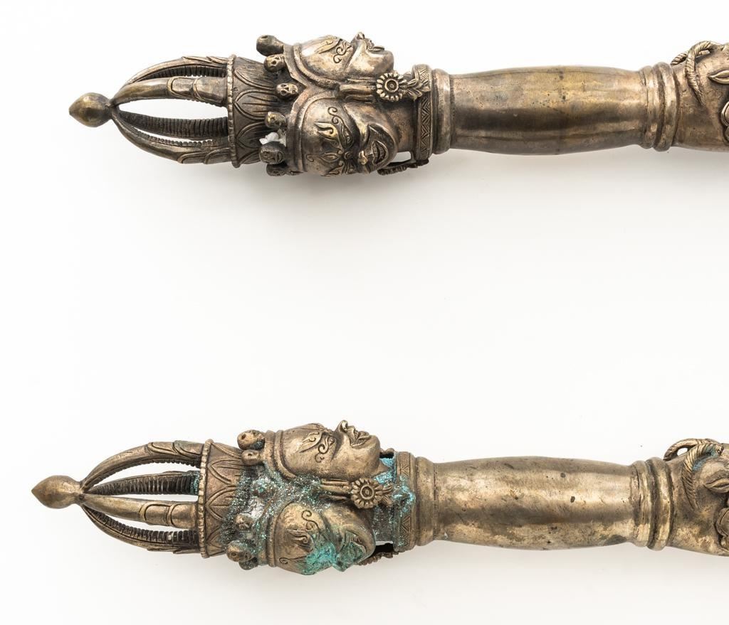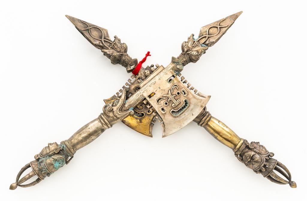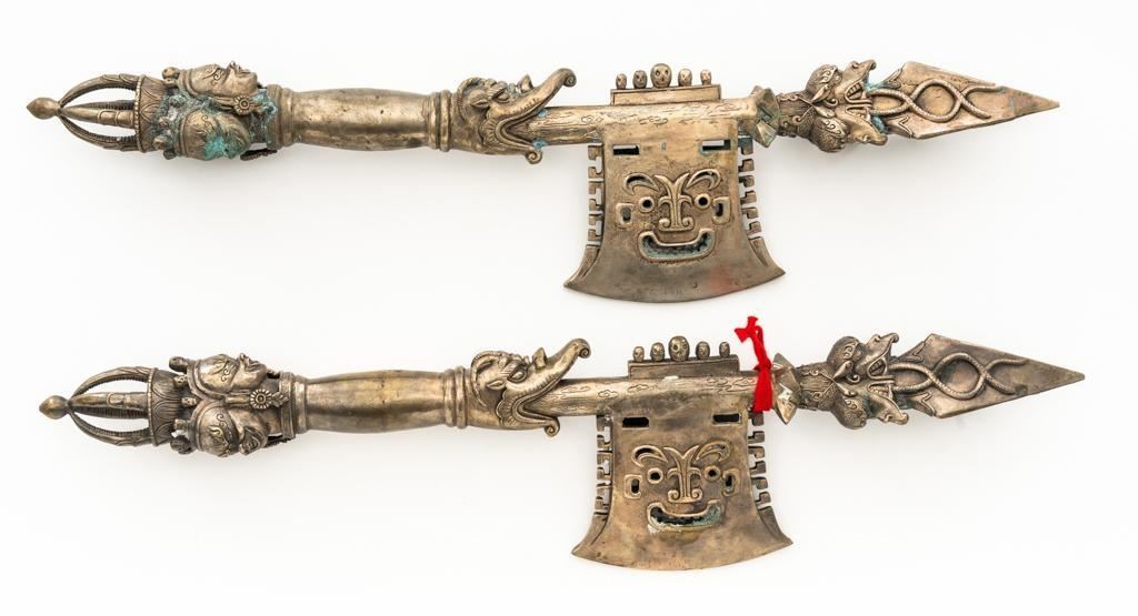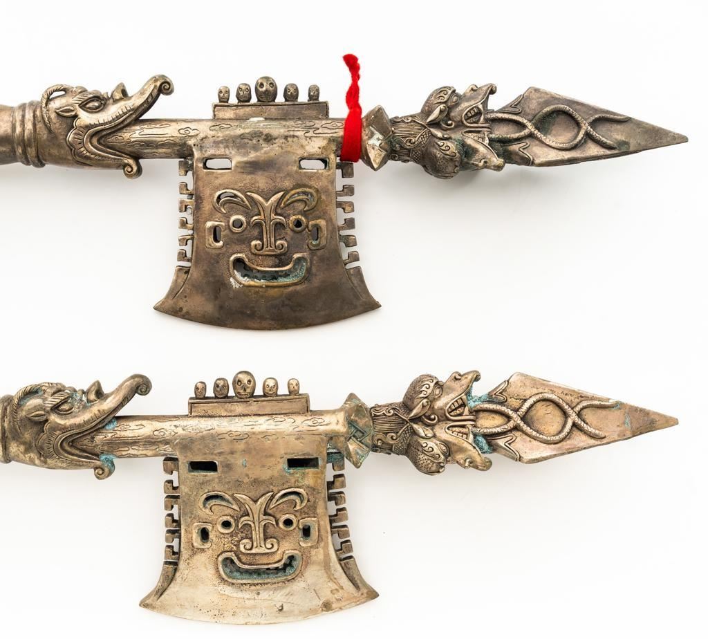 Lot of Two (2) 20th century Tibetan Style Brass Dagger Axes, 25.25'' in length, 6'' at the widest part, weighing approx. 5lbs each, with silver colored finish. Both are in very good condition, showing patina, and light handling marks. There are areas on both pieces where the finish has worn, exposing the brass. Est.: $300-$500/lot.