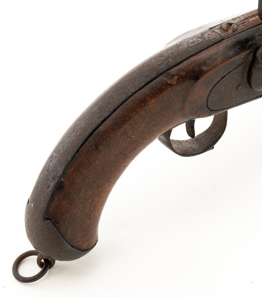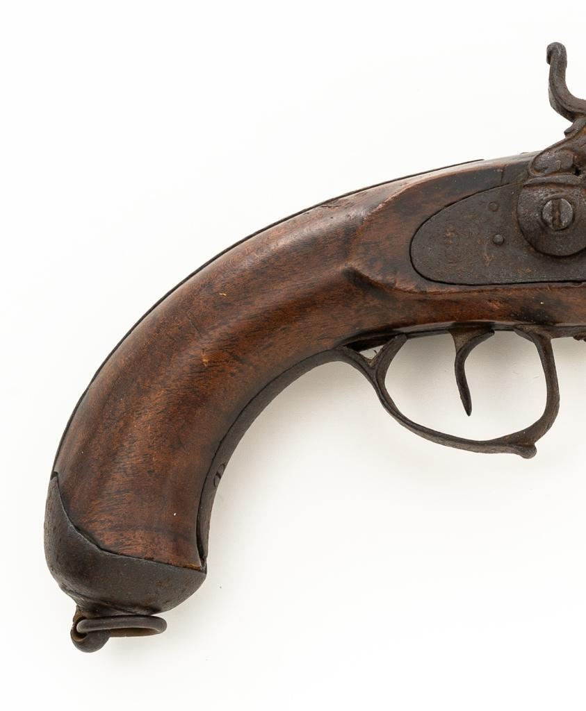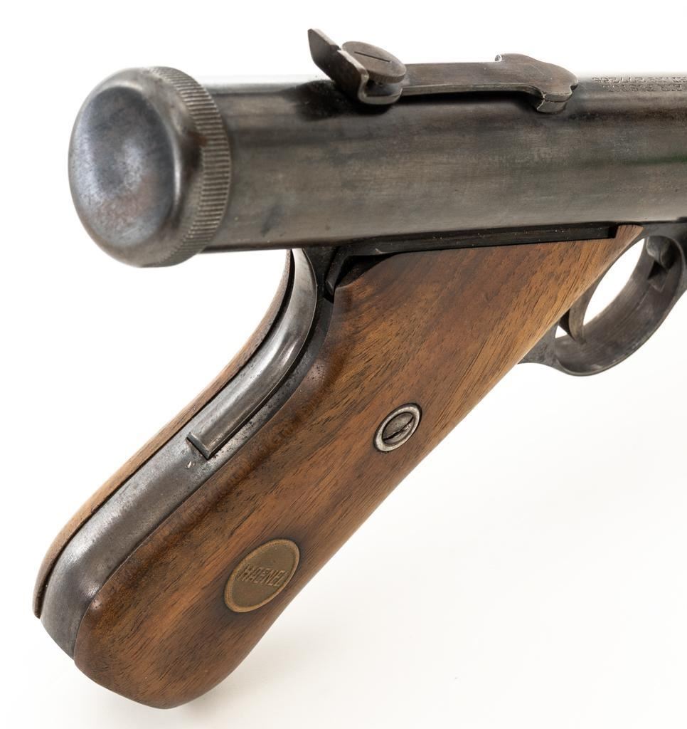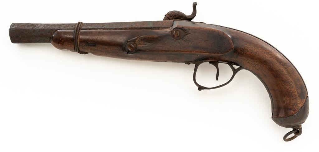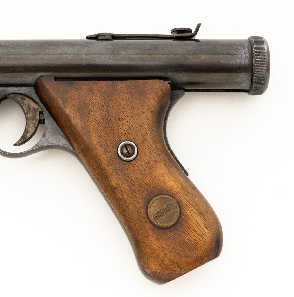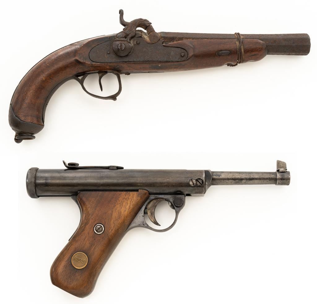 Lot of Two (2): Haenel Air Pistol & Unknow Percussion Belt Pistol: 1.) Haenel Model 28 Pneumatic Single Shot Air Pistol, #6198, .177 cal., 4'' barrel, blue finish, smooth walnut two-piece grips, factory dovetailed blade front and adjustable V notch rear sights. In good overall condition, retaining approx. 50%-60% thinning factory finish with some areas of light surface erosion and staining. Action is not working. Bore is very good. 2.) Mid-19th Century Single Shot Percussion Belt Pistol, #NVSN, approx. .74 cal., 7'' octagon barrel, dark patina, smooth hardwood stock with bag grip, iron straps and lanyard ring, no sights, and no visible markings. Appears to be from circa mid-19th century. Pistol is in fair condition with the metal surfaces gone to patinated finish with surface rust and erosion. Hammer is carved into an animal figure with nice detail. Screw heads are marred. Stock is in very good condition with indentations, other marks from age and use, particularly around the screw heads. Front barrel band is missing and has been replaced with rusty bailing wire. Action does not function. Bore is dark. Est.: $150-$300/lot.
