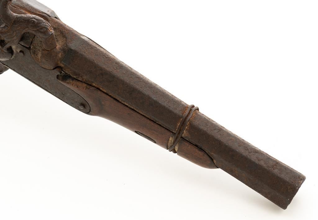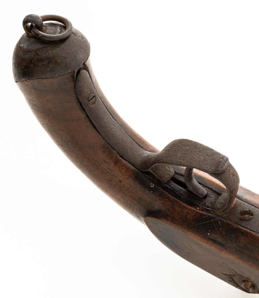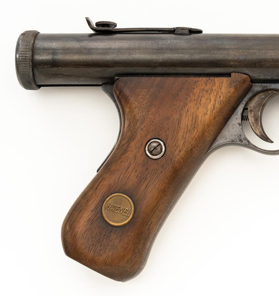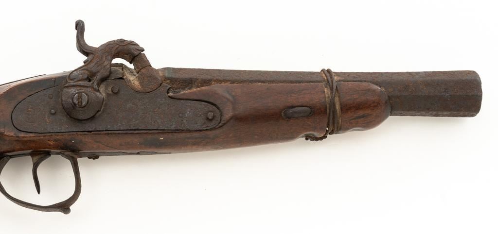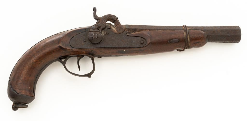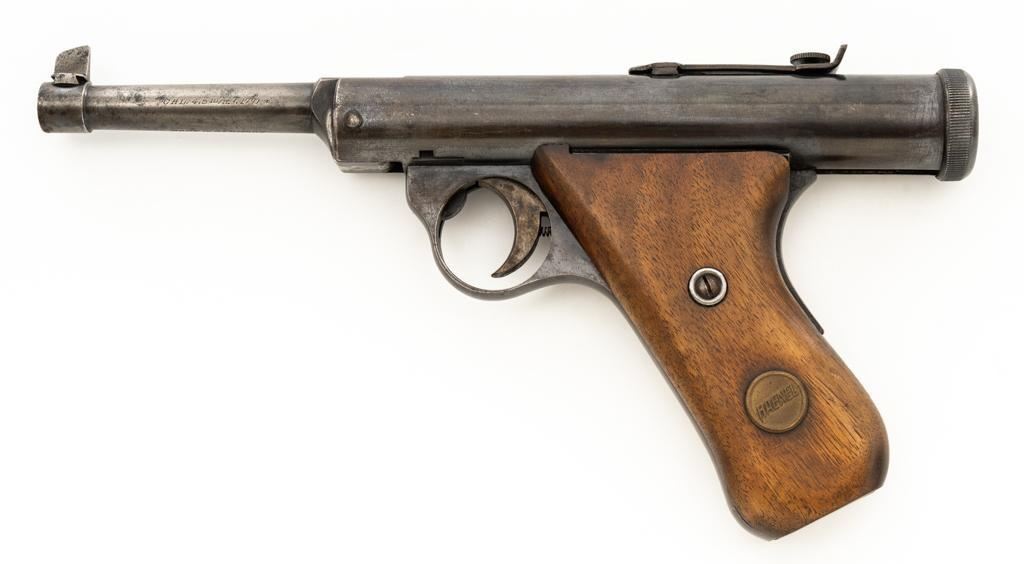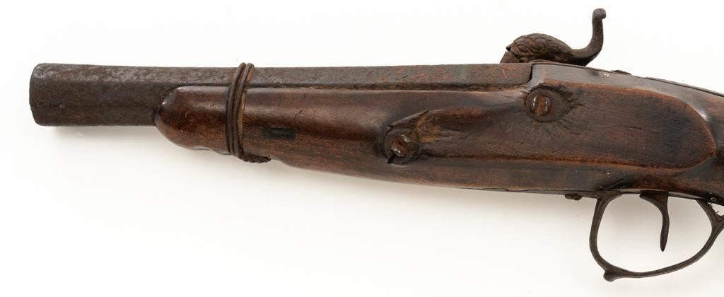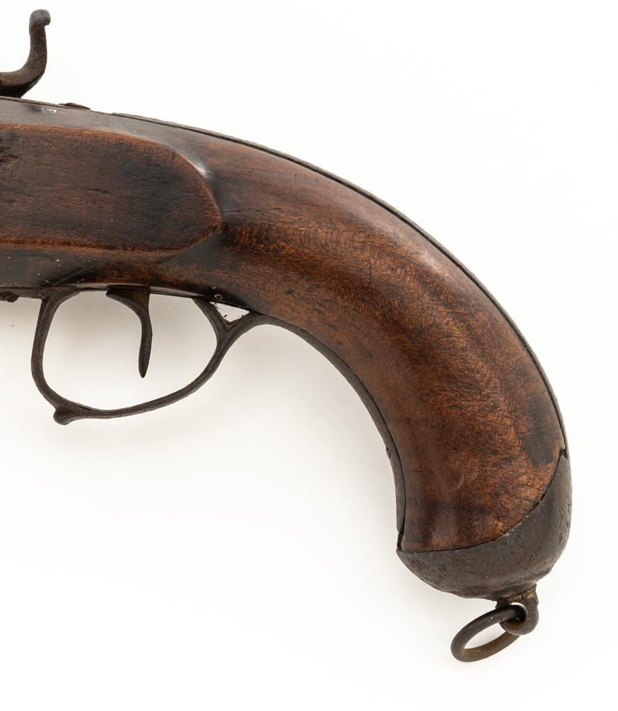 Lot of Two (2): Haenel Air Pistol & Unknow Percussion Belt Pistol: 1.) Haenel Model 28 Pneumatic Single Shot Air Pistol, #6198, .177 cal., 4'' barrel, blue finish, smooth walnut two-piece grips, factory dovetailed blade front and adjustable V notch rear sights. In good overall condition, retaining approx. 50%-60% thinning factory finish with some areas of light surface erosion and staining. Action is not working. Bore is very good. 2.) Mid-19th Century Single Shot Percussion Belt Pistol, #NVSN, approx. .74 cal., 7'' octagon barrel, dark patina, smooth hardwood stock with bag grip, iron straps and lanyard ring, no sights, and no visible markings. Appears to be from circa mid-19th century. Pistol is in fair condition with the metal surfaces gone to patinated finish with surface rust and erosion. Hammer is carved into an animal figure with nice detail. Screw heads are marred. Stock is in very good condition with indentations, other marks from age and use, particularly around the screw heads. Front barrel band is missing and has been replaced with rusty bailing wire. Action does not function. Bore is dark. Est.: $150-$300/lot.