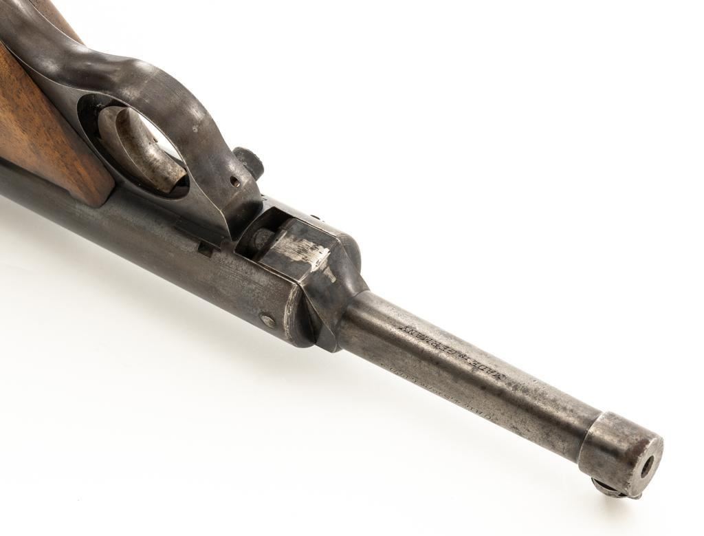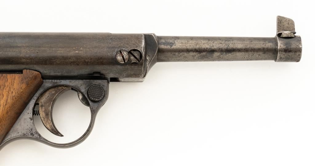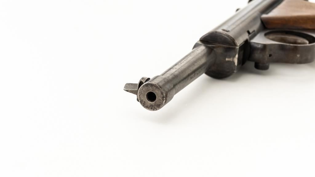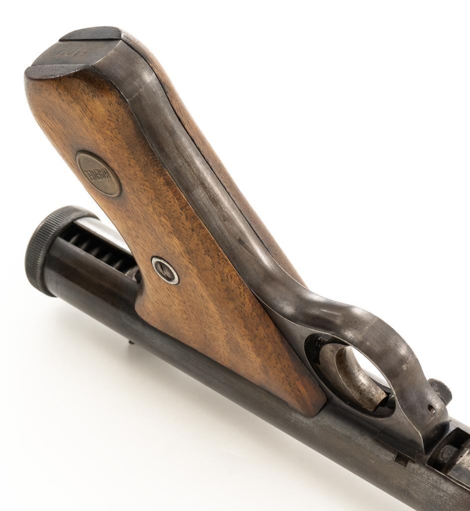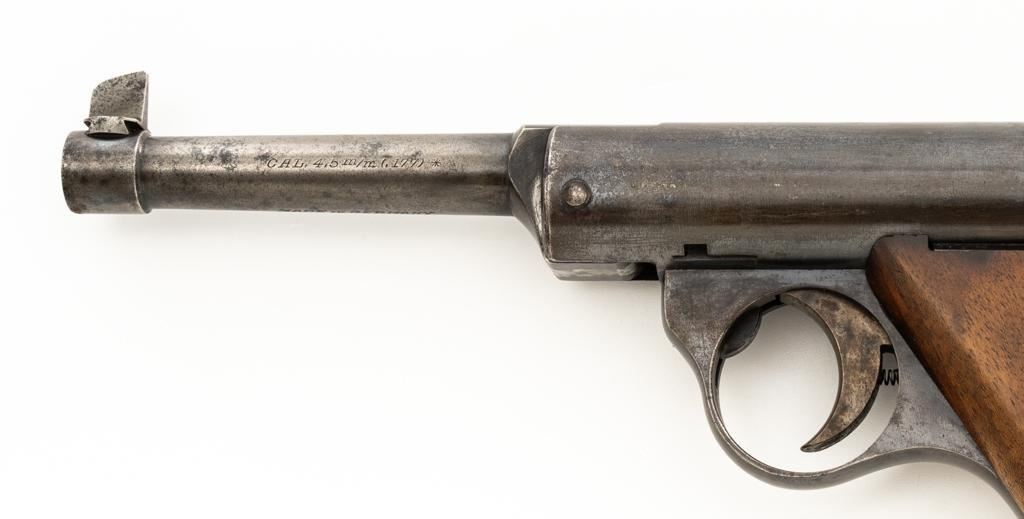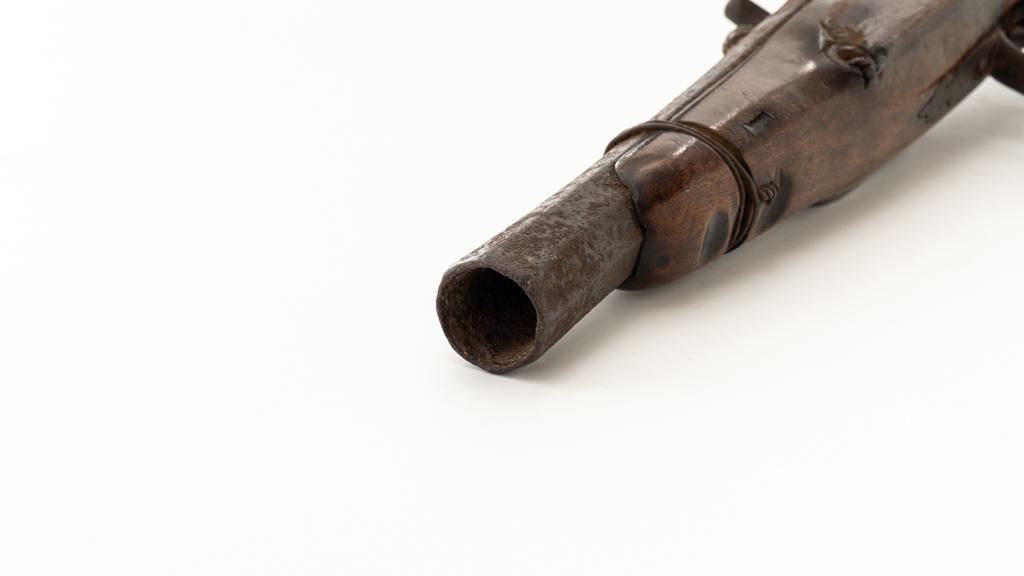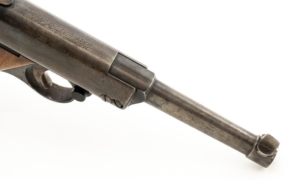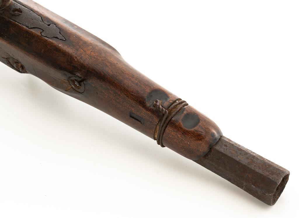 Lot of Two (2): Haenel Air Pistol & Unknow Percussion Belt Pistol: 1.) Haenel Model 28 Pneumatic Single Shot Air Pistol, #6198, .177 cal., 4'' barrel, blue finish, smooth walnut two-piece grips, factory dovetailed blade front and adjustable V notch rear sights. In good overall condition, retaining approx. 50%-60% thinning factory finish with some areas of light surface erosion and staining. Action is not working. Bore is very good. 2.) Mid-19th Century Single Shot Percussion Belt Pistol, #NVSN, approx. .74 cal., 7'' octagon barrel, dark patina, smooth hardwood stock with bag grip, iron straps and lanyard ring, no sights, and no visible markings. Appears to be from circa mid-19th century. Pistol is in fair condition with the metal surfaces gone to patinated finish with surface rust and erosion. Hammer is carved into an animal figure with nice detail. Screw heads are marred. Stock is in very good condition with indentations, other marks from age and use, particularly around the screw heads. Front barrel band is missing and has been replaced with rusty bailing wire. Action does not function. Bore is dark. Est.: $150-$300/lot.