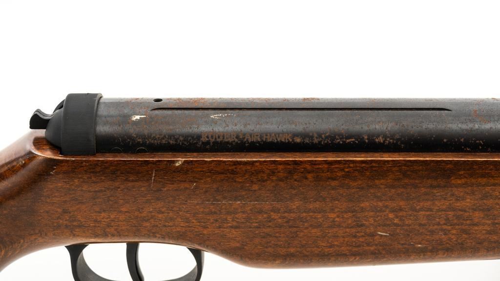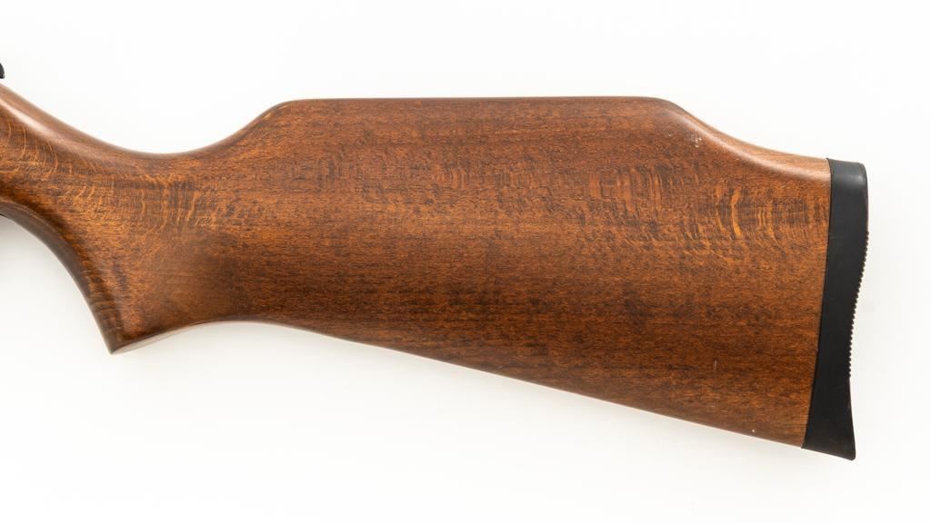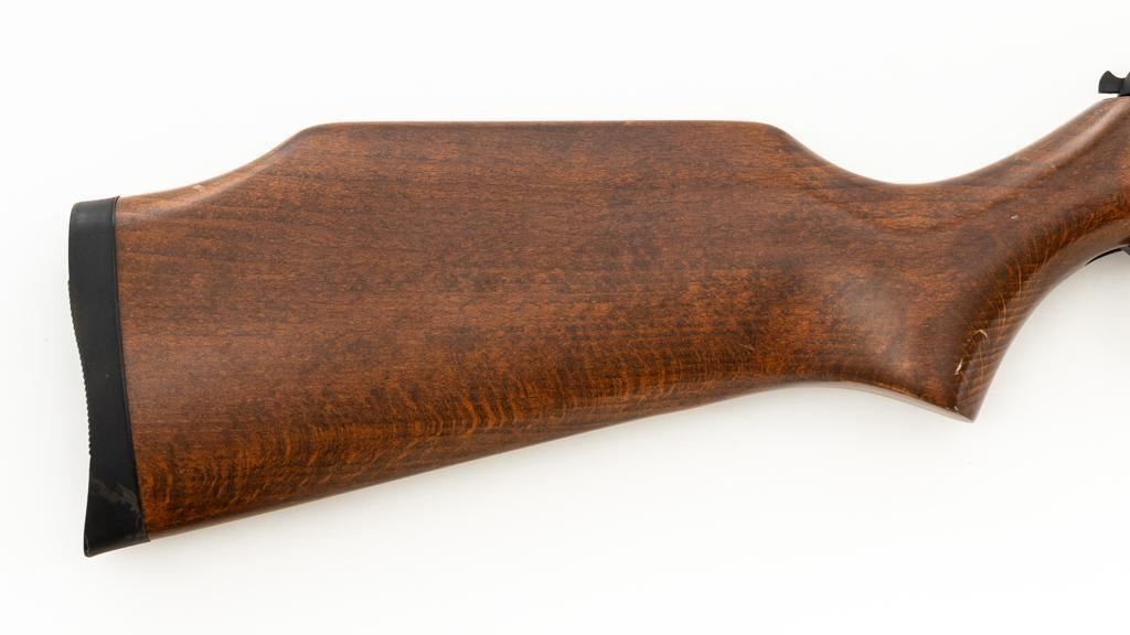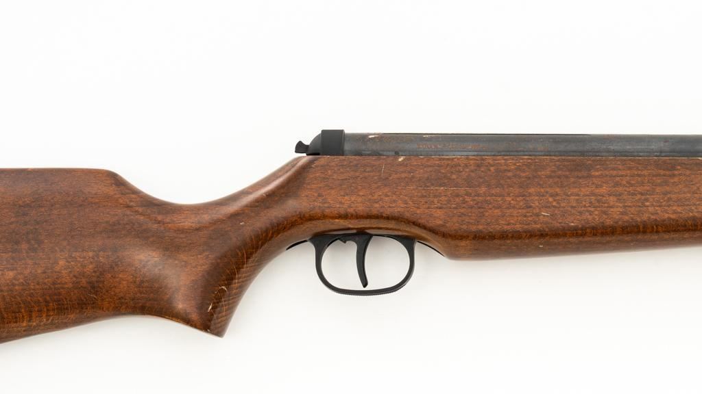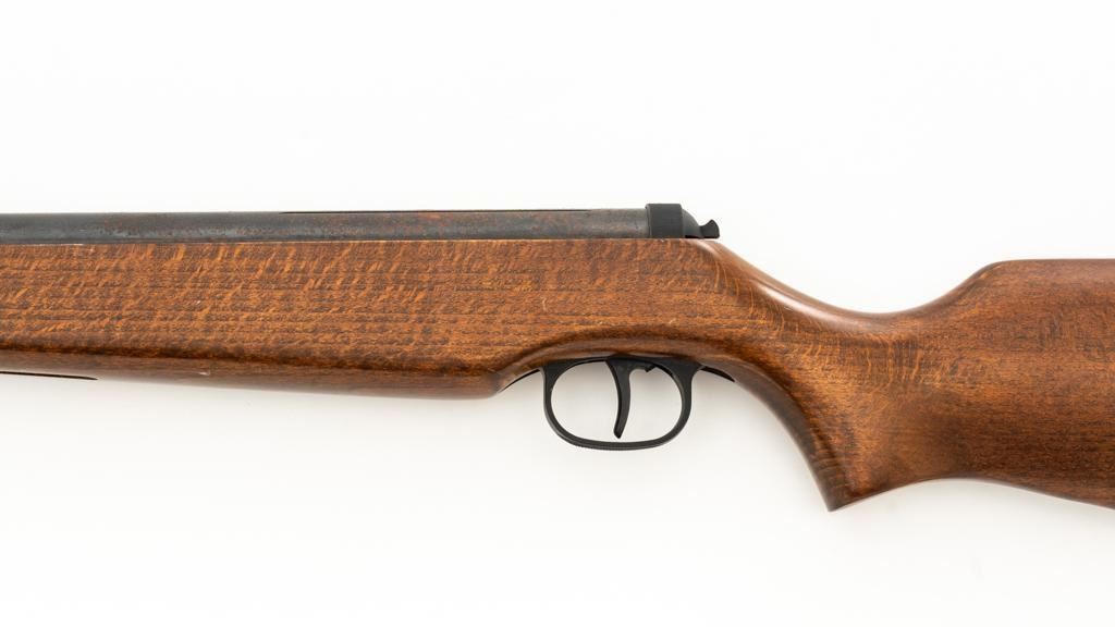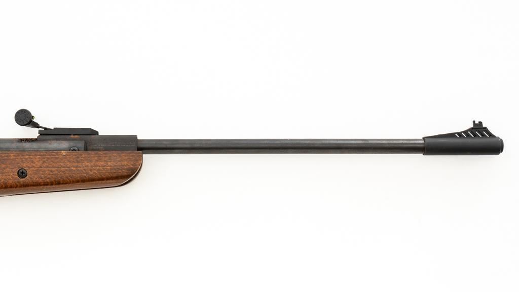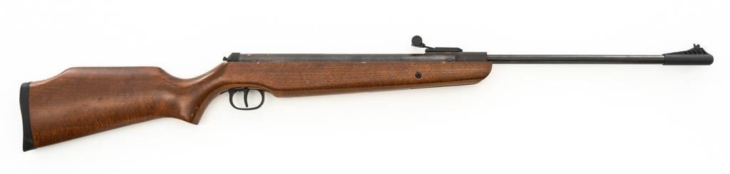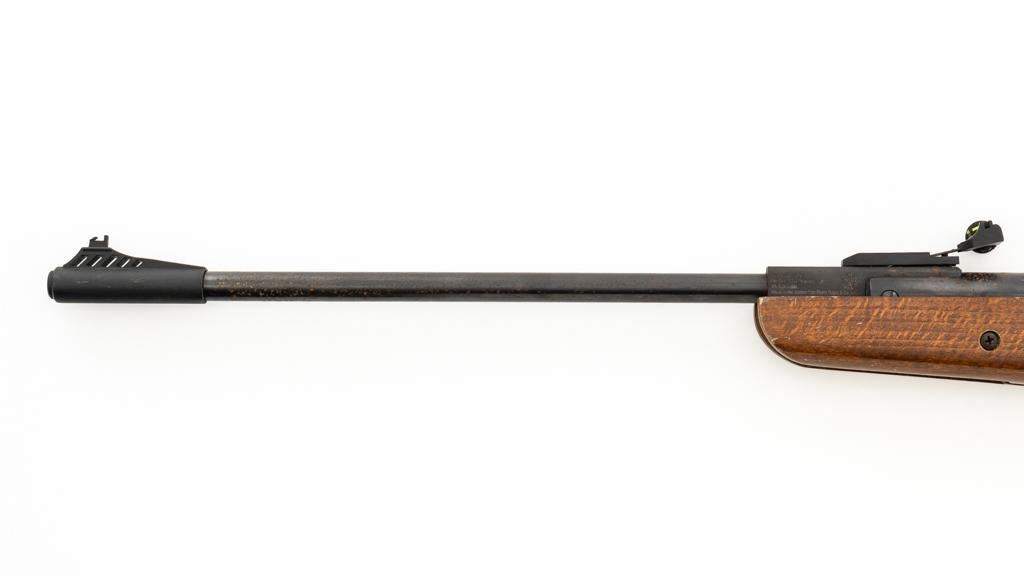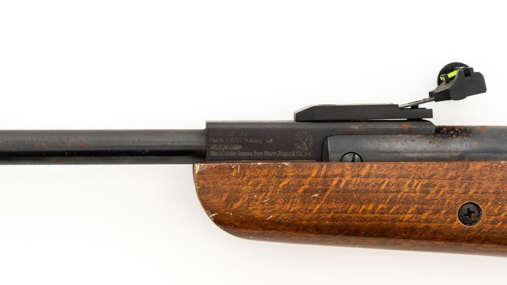 Ruger/Umarex Break Barrel Air Rifle, #000110050, .177 cal., 18.75'' barrel, blued finish, smooth one-piece hardwood stock with serrated rubber recoil pad, ramped fiber optic front sight (holder for fiber optic is broken), and square-notched adjustable rear sight with two green fiber optic dots. Mfg'd circa 2009-2017. Overall, the condition is fair, with barrel and receiver having a moderate amount of surface rust and pitting. Wood stock is serviceable with scattered scratches and shallow dents. Break barrel action operates properly. Est.: $50-$100.