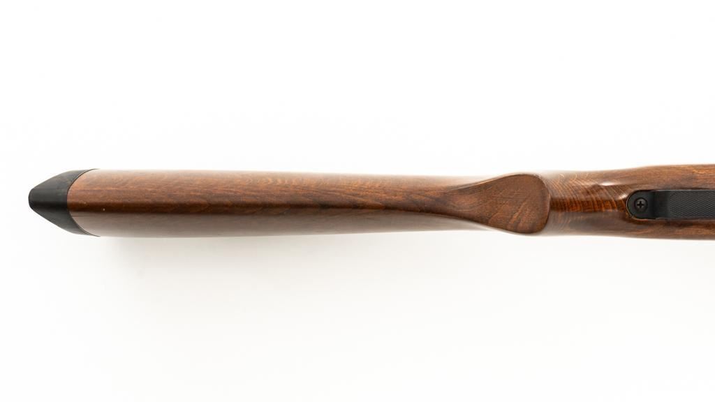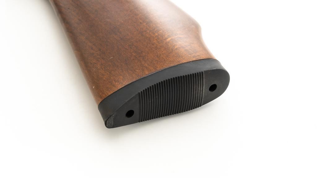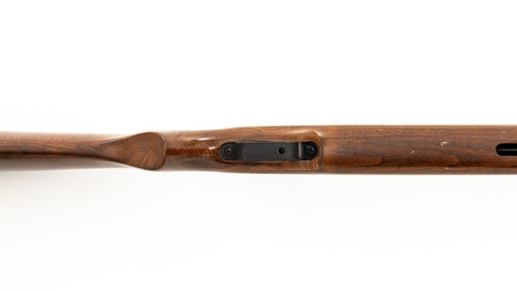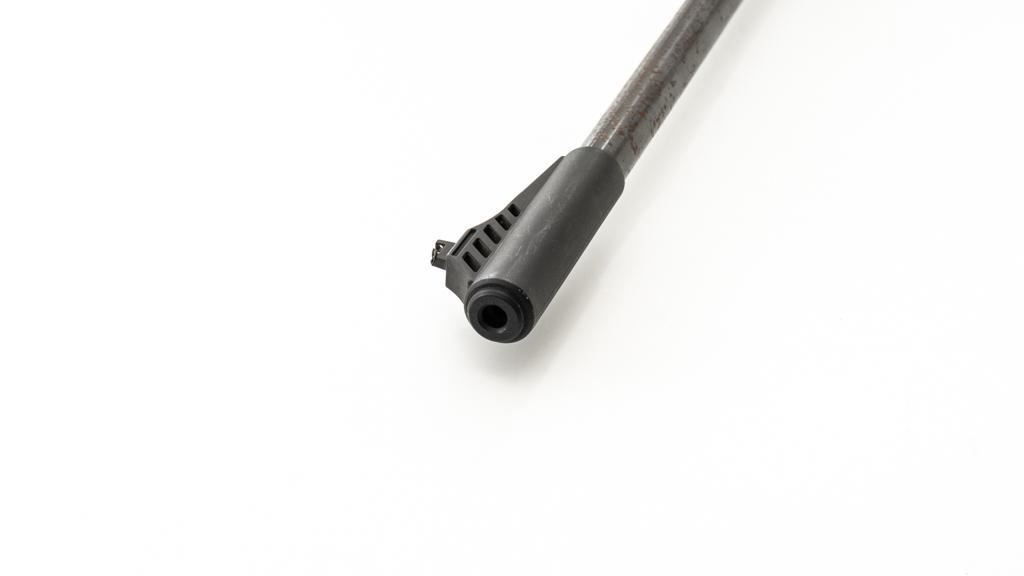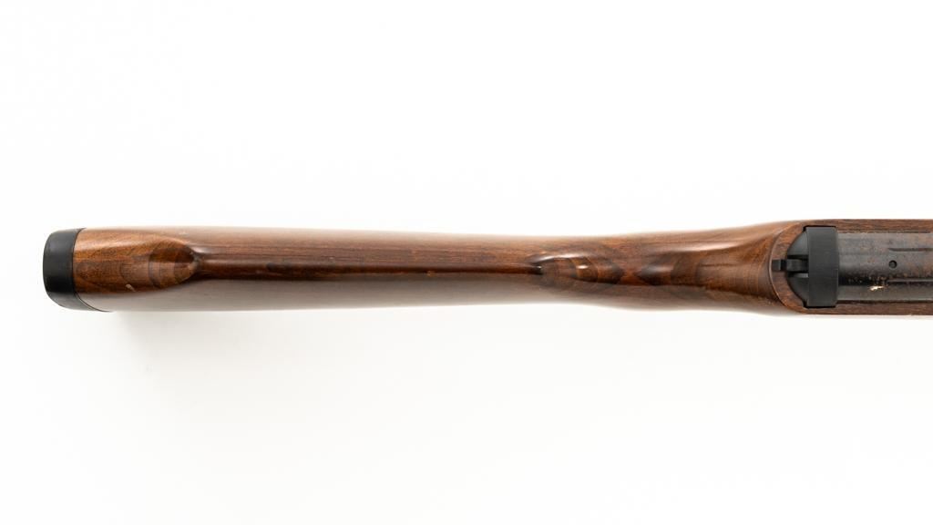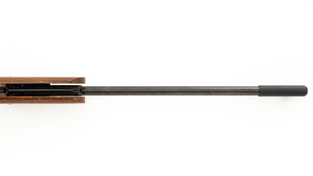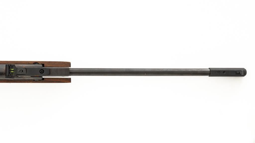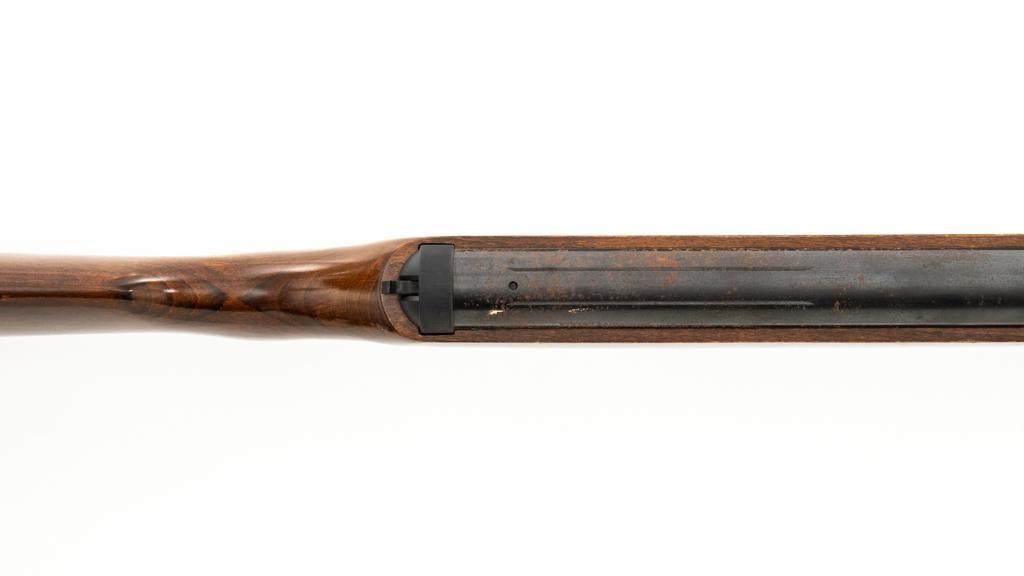 Ruger/Umarex Break Barrel Air Rifle, #000110050, .177 cal., 18.75'' barrel, blued finish, smooth one-piece hardwood stock with serrated rubber recoil pad, ramped fiber optic front sight (holder for fiber optic is broken), and square-notched adjustable rear sight with two green fiber optic dots. Mfg'd circa 2009-2017. Overall, the condition is fair, with barrel and receiver having a moderate amount of surface rust and pitting. Wood stock is serviceable with scattered scratches and shallow dents. Break barrel action operates properly. Est.: $50-$100.
