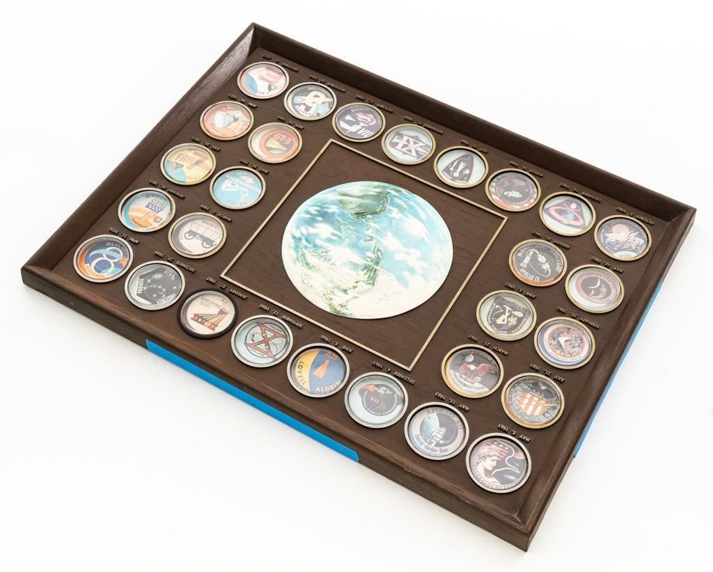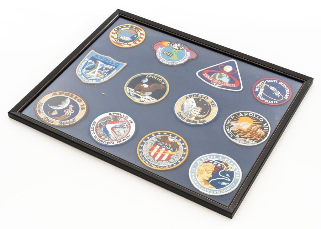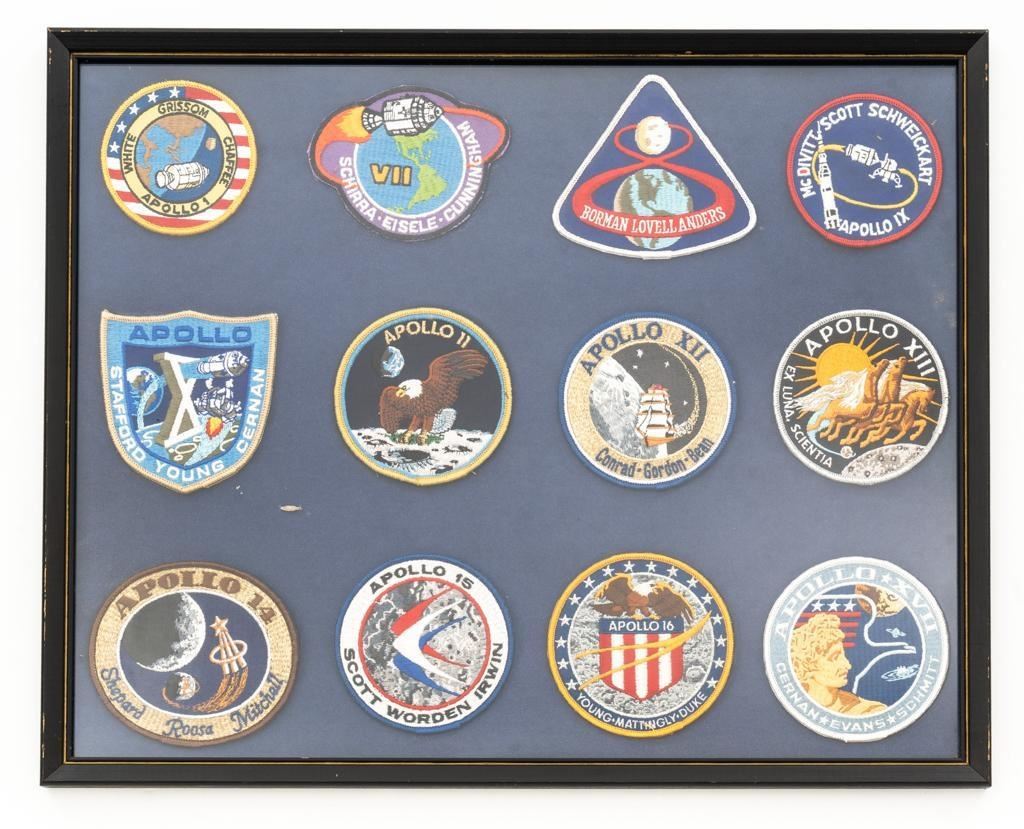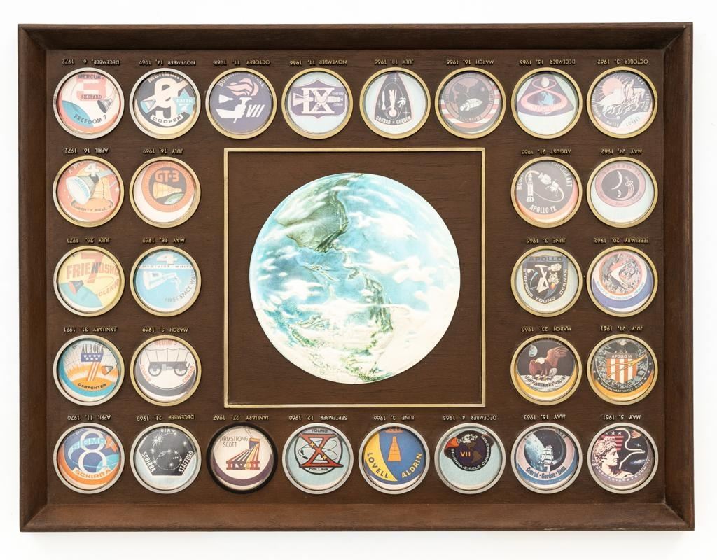 Lot of Two (2) Framed Pieces of NASA Memorabilia: 1.) Twelve (12) Mission Patches, circa 1960's- 1970's. They have never been used/sewn onto anything and are in excellent condition. These are held in a 20-7/8 x 17'' glass frame. There is light edge wear to the wood frame and a small area of water staining to the cardboard backer. 2.) Framed NASA mission logos, dated from May 08, 1961December 06, 1972, each is viewable through a round recessed hole that is covered with a plastic capsule. They are all held in a simulated wood grain plastic frame measuring 20-1/2'' x 15-1/2''. The center of the frame features a raised image of the Earths Western Hemisphere. Frame is in excellent condition, but the backing is held on with blue painters tapes as the original adhesive has failed. Print itself is slightly faded and in very good overall condition. Est.: $150-$250/lot.