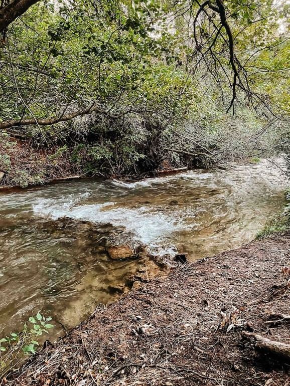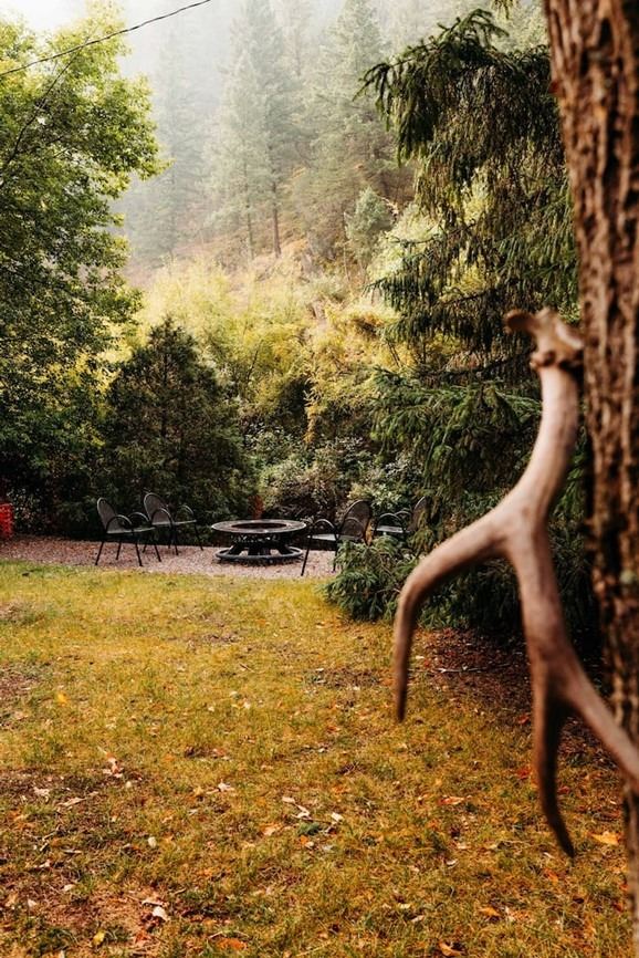 Outside you’ll find a hot tub right by the creek, two patio chairs and a small table to enjoy your morning coffee. There’s also a fire pit with 4 sturdy chairs, right by the creek. A little further down the property you’ll find a picnic table- also right by the creek. Behind the cabin is plenty of yard to romp and play.