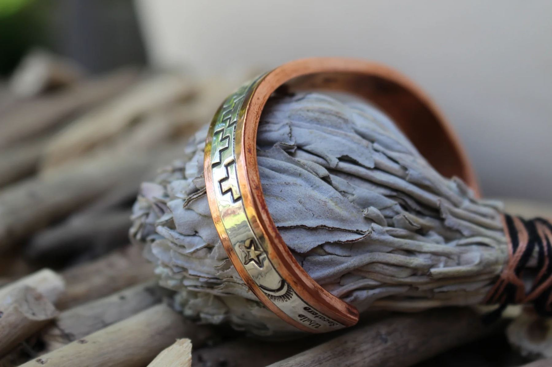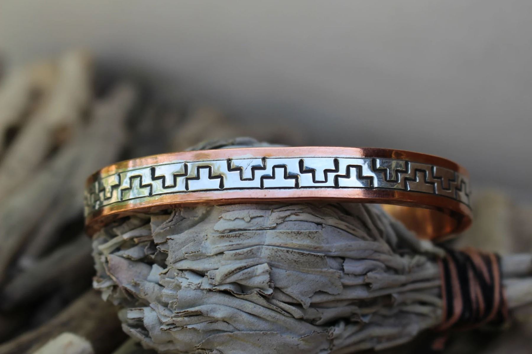 This handmade Sterling and Copper Arches Bracelet by Wylie Secatero features a striking stamped design in sterling silver over copper. It is hallmarked by artisan for authenticity. Add a touch of elegance and uniqueness to your look with this piece.