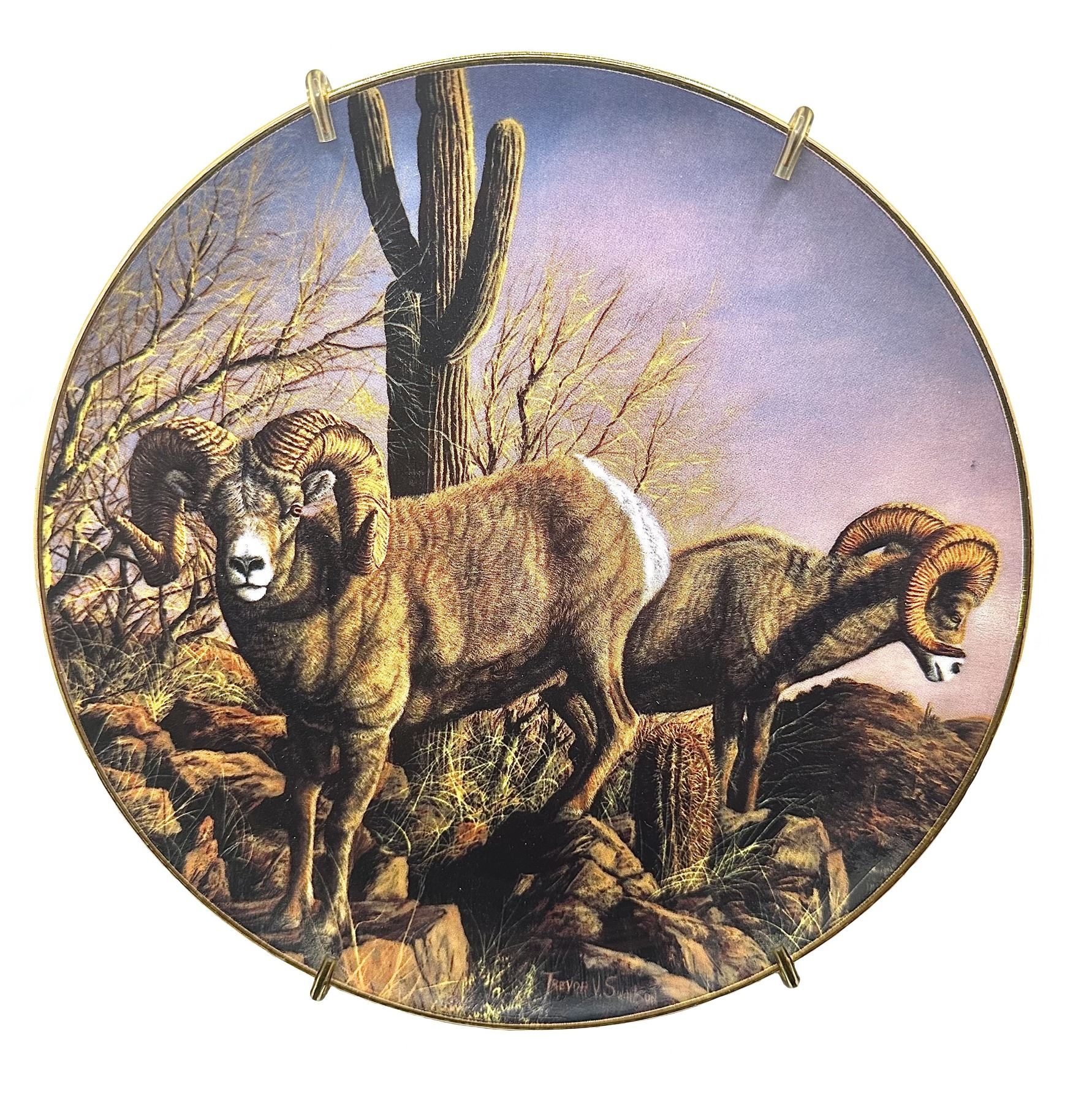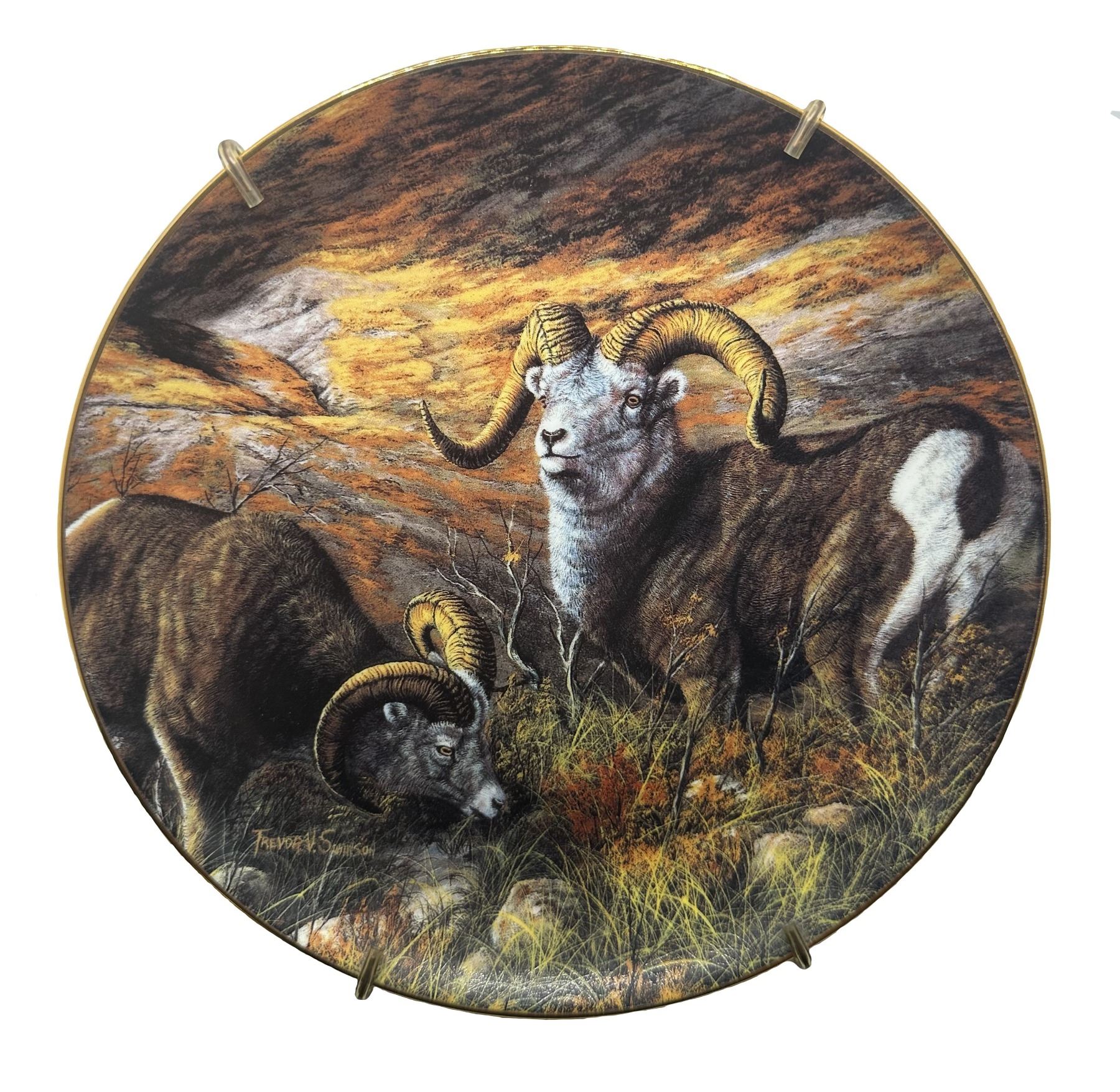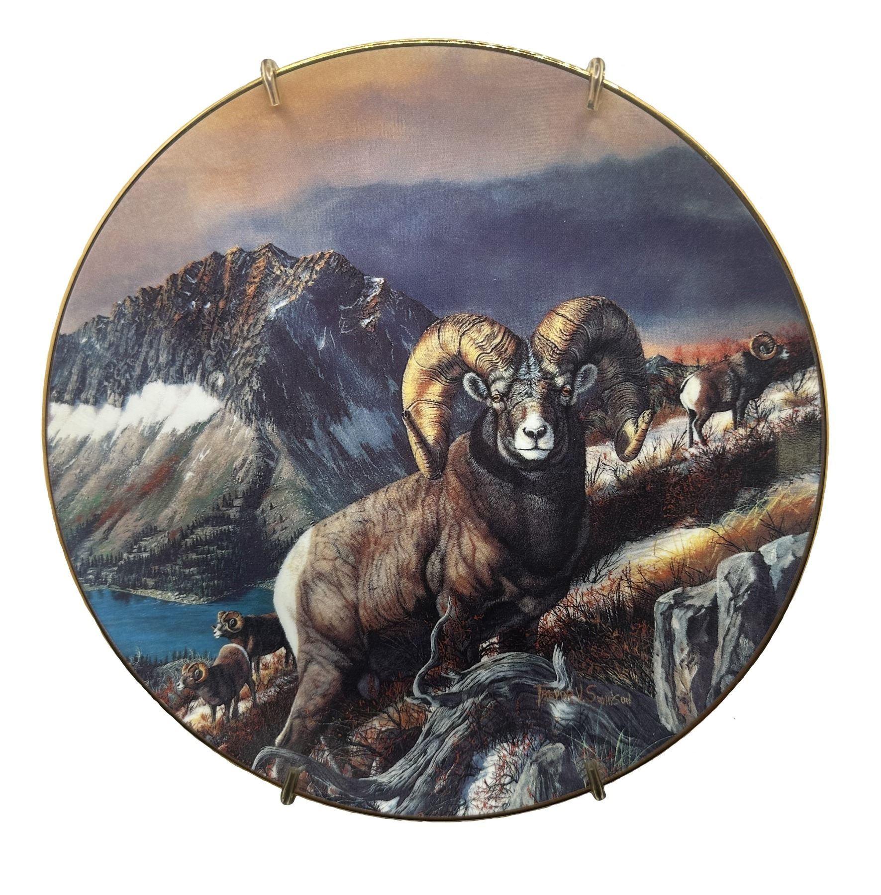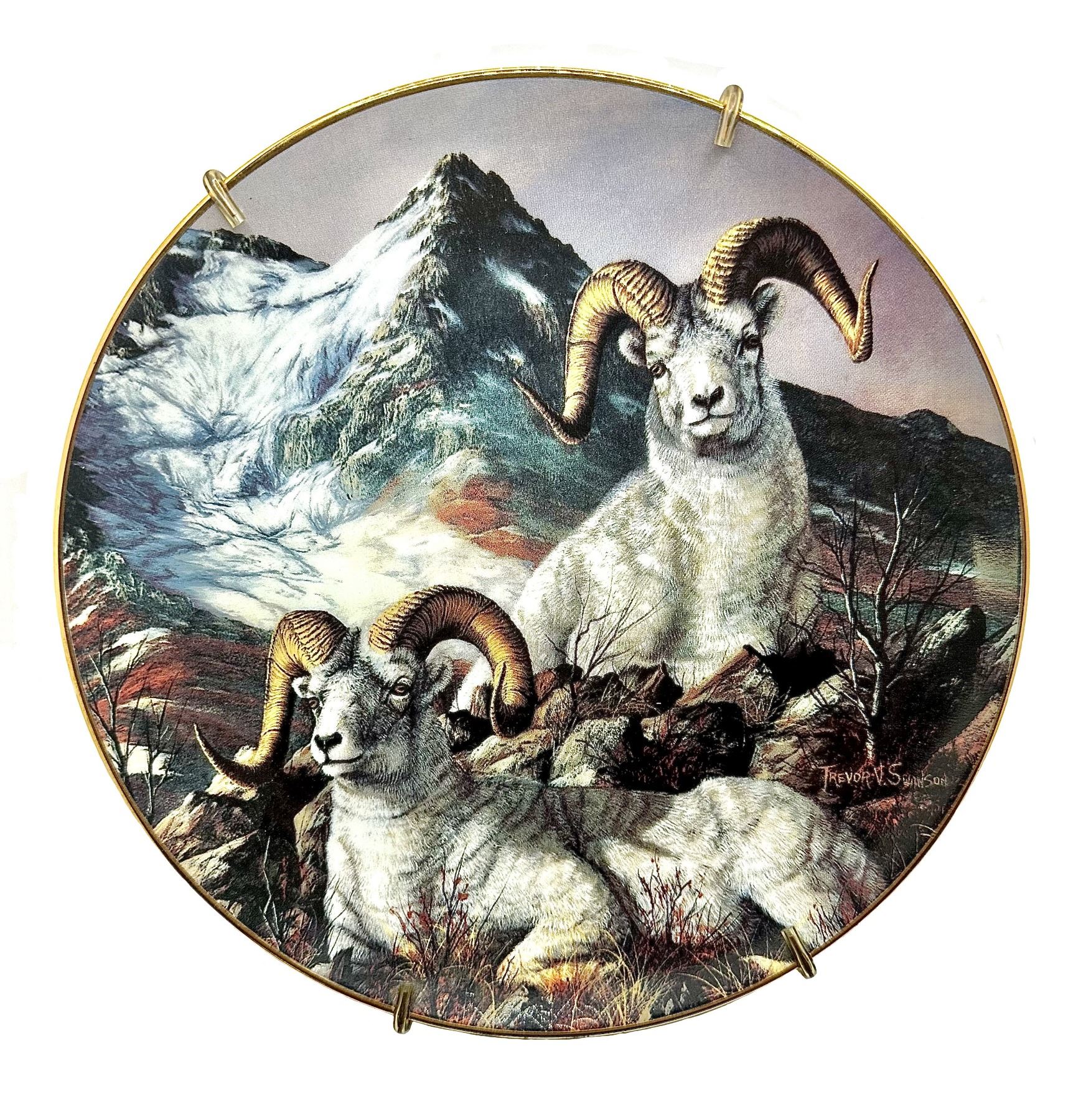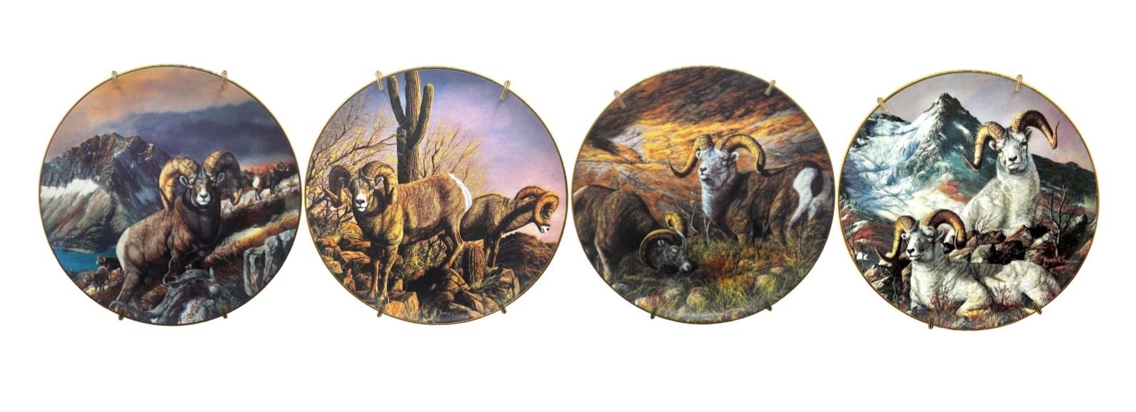 Set of 4 limited edition plates by Trevor Swanson from the collection entitled THE GRAND SLAM. Made by the Danbury Mint, this is a complete set with all 4 plates numbered A328. Each plate is crafted in fine porcelain and decorated with 23kt gold. They were designed by Gary and Trevor Swanson and produced in the late 1970s and early 80s. The Grand Slam set consists of the Rocky Mountain Bighorn, Desert Bighorn, Dall and Stone Sheep.