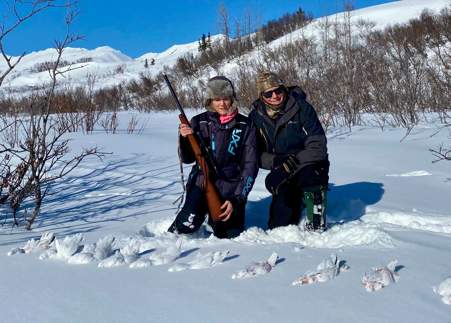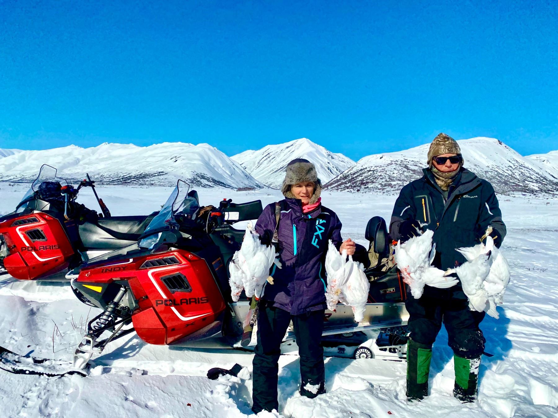 The Lodge is your rustic, yet well-appointed, home from which you can hunt, fish, ski, view the Iditarod or participate in any number of other winter activities, or just relax amid the majesty of the Alaska Range. The Perrins family is there to make sure you are comfortable, well fed, and wonderfully worn out at the end of each day. The Perrins Rainy Pass Lodge is your rustic, yet well-appointed ‘Cabin in the Woods’ nestled in the heart of the Alaska Range. The buildings here are primarily log cabins dating back to 1937. The lodge is located on 5 acres of private land and surrounded by hundreds of miles of un-inhabited State land. On the property there are 12 main buildings with a handful of little sheds and service buildings. Off the property are 10 ‘OUT CAMPS’ that we use for guest activities and hunting camps. Ptarmigan hunting is a relaxing, easy hunting experience available for all ages. A great way to start off a young kid or good practice at homing in your skills a with scope or shotgun. These birds are not your typical ‘on-the-wing’ type shooting. Although you can use a shotgun (typically a .410 or 20 gauge). The Ptarmigan stay on the ground a lot and it is actually quite sporting to use a scoped or open-sights .22 magnum rifle. Regardless of your firearm choice, you will have a blast as you navigate your own snow machine through the willows and up the creeks looking for these beautiful birds that sometimes gather in the hundreds. There are many great outdoor activities to be based from the beautiful lodge!