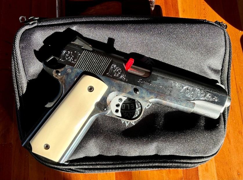 Lot 28 UNLOCK BOX, PREMIUM BOTTLE OF ALCOHOL OR Custom-Made Pearl handle, engraved .45 Auto Pistol