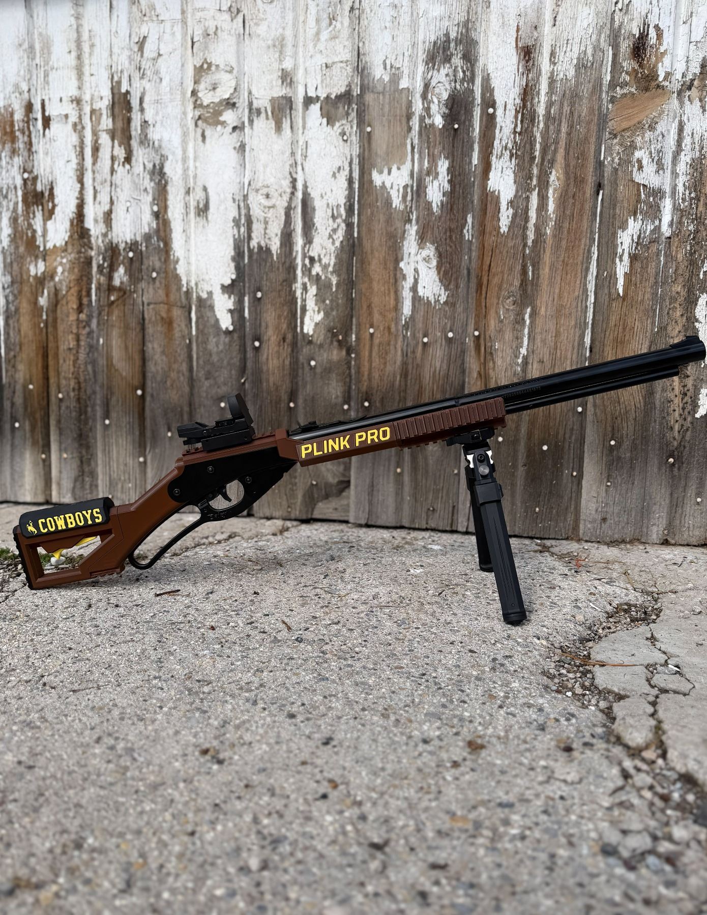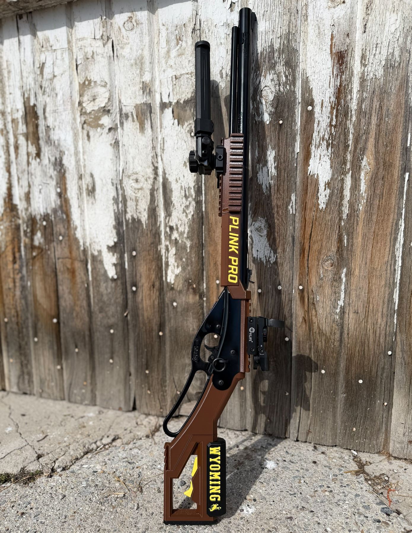 Plink Pro is the ultimate customization upgrade for your Daisy Red Ryder BB gun! This aftermarket kit replaces the stock and foregrip with a fully adjustable stock that fits both kids and adults, ensuring better shooting form and comfort. A Picatinny rail on top makes it easy to add scopes or red dots, while the 3-sided foregrip rail gives you room for accessories like grips, slings, lasers, or bipods. Available in three color options, the Plink Pro Kit combines classic Red Ryder fun with modern tactical performance! GET THIS CUSTOM ONE TODAY IN THE WYOMING COWBOYS VERSION!