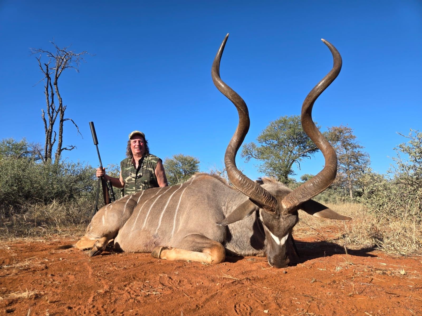The Limpopo Province in untamed Africa, with wide open bushveld, big skies, ever present thorn trees and the mystical baobab tree. The area is known for the very large Southern Greater Kudu, Southern Impala, Greater Waterbuck, Blue Wildebeest, Klipspringer, Limpopo Bushbuck, and Eland. The province borders the countries of Botswana to the west, Zimbabwe to the north, and Mozambique to the east. Lodging is comfortable chalets with all modern amenities on site.