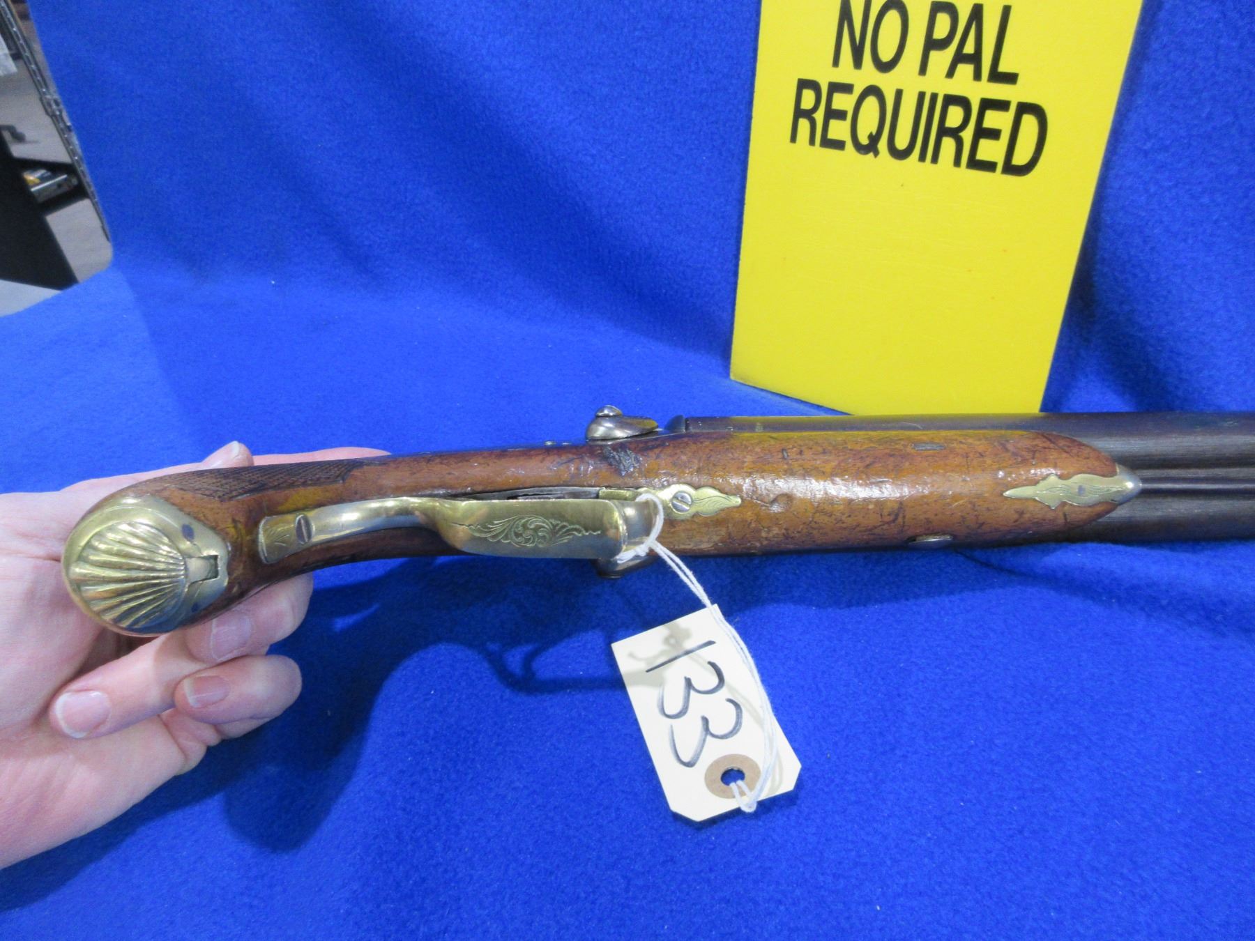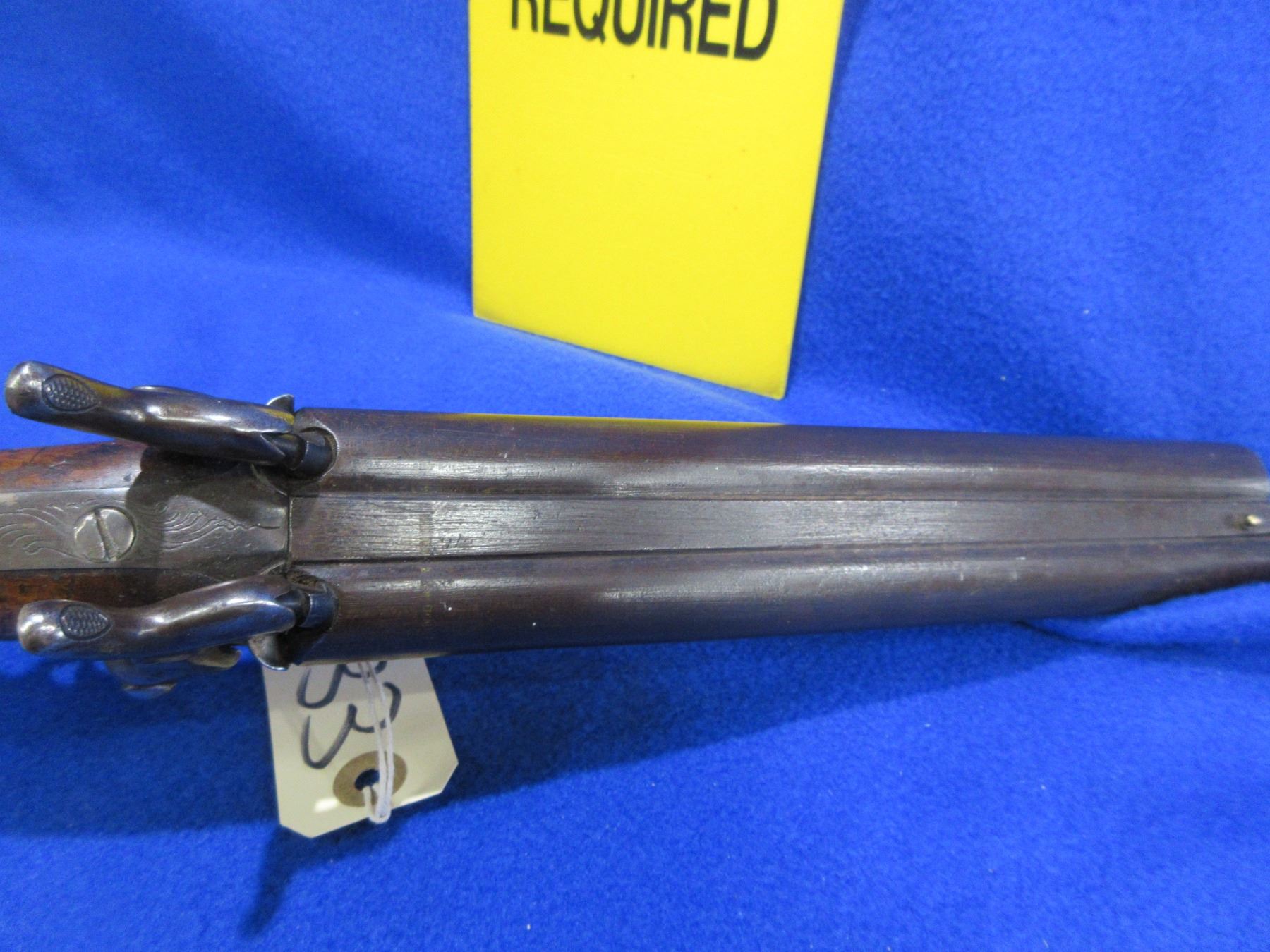 Antique - No PAL Required - Howdah Cap & Ball Pistol in appears to be 20 Ga. - This is a cap and ball SXS hammer pistol, action appears to be in working order. Barrels are approx. 8 1/2", smooth bores appear good, browning on barrels is good, wood grip/stock is good with many usage marks, brass trigger guard and furniture are good, comes with ram rod. Ser # 3010