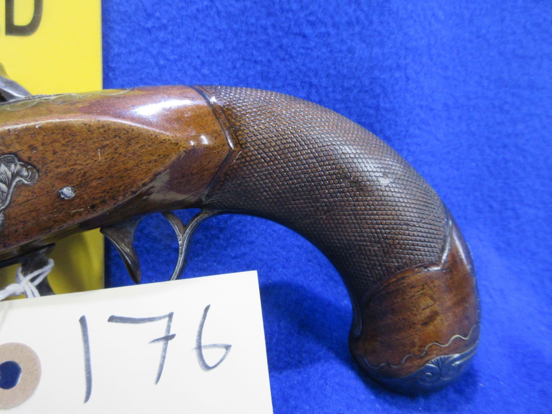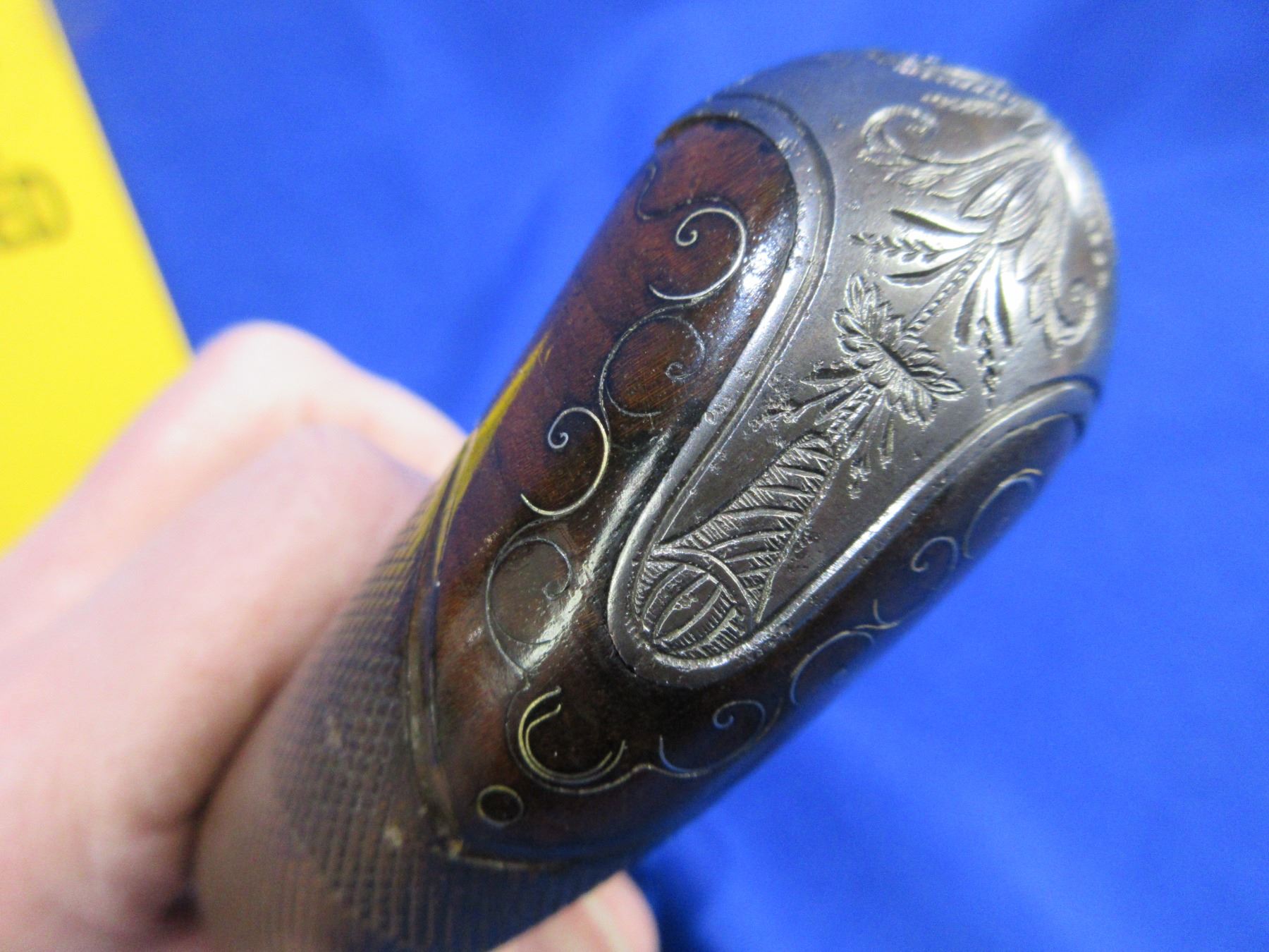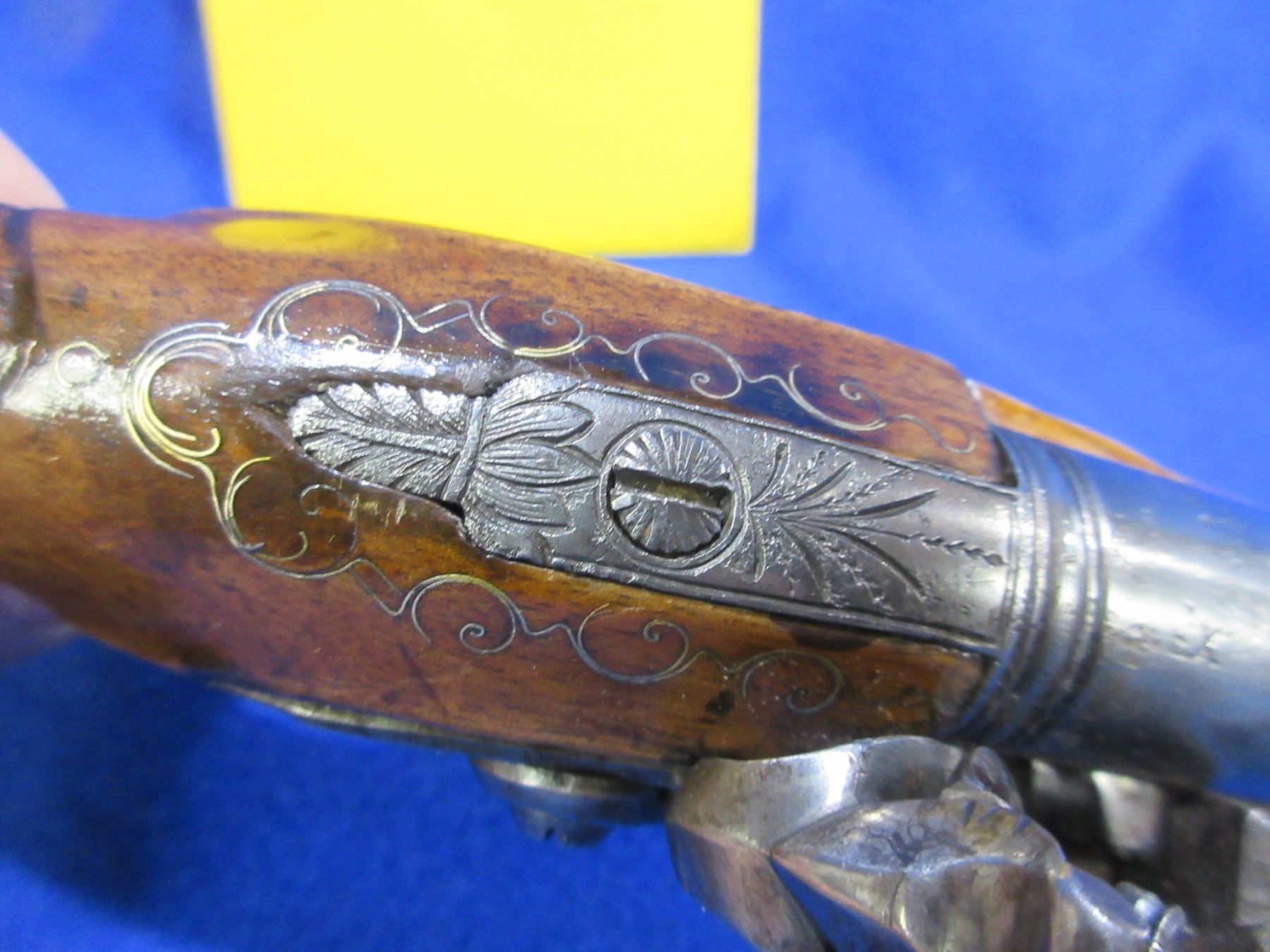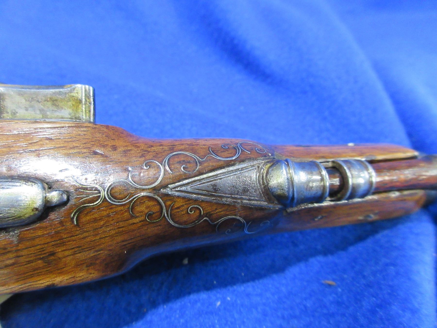 Antique - No PAL Required - Flintlock Pistol in Approx. 54 Cal. - This is a flintlock single-shot pistol, action is in non working order as will not hold cock. Barrel is approx 5". Bore appears good for age. Trigger guard, ball butt and top tang are nicely engraved. Stock is good to very good for age and has inlay around top tang, ball butt and under muzzle, comes with ram rod. Ser #None