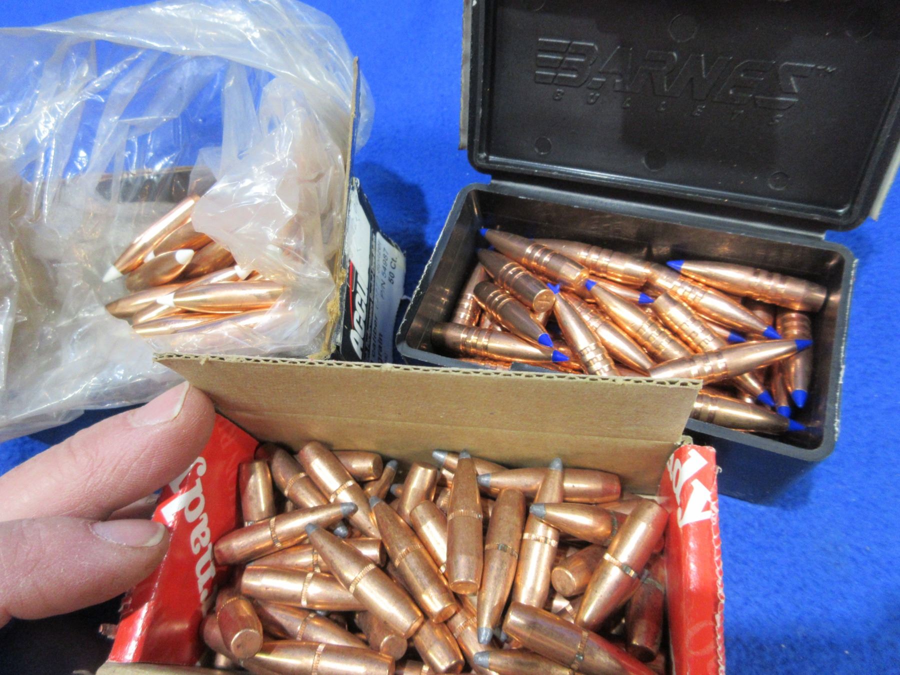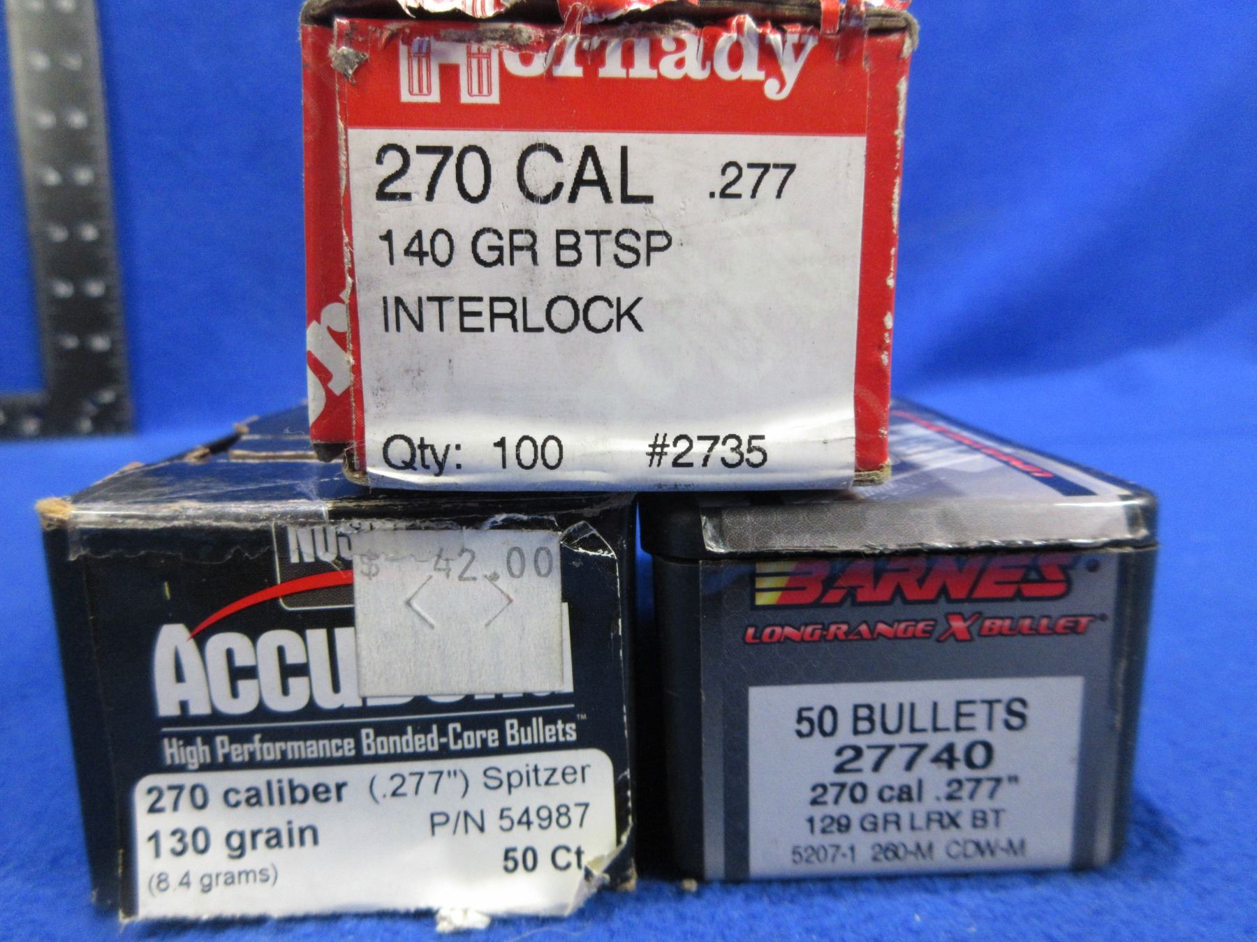 270 Cal. .277" Barnes, Nosler & Hornady Bullets - Box of 69 (Hornady 140gr BTSP), Box of 43 (Barnes 129gr LRX BT), Box of 16 (Nosler 130gr Spitzer)