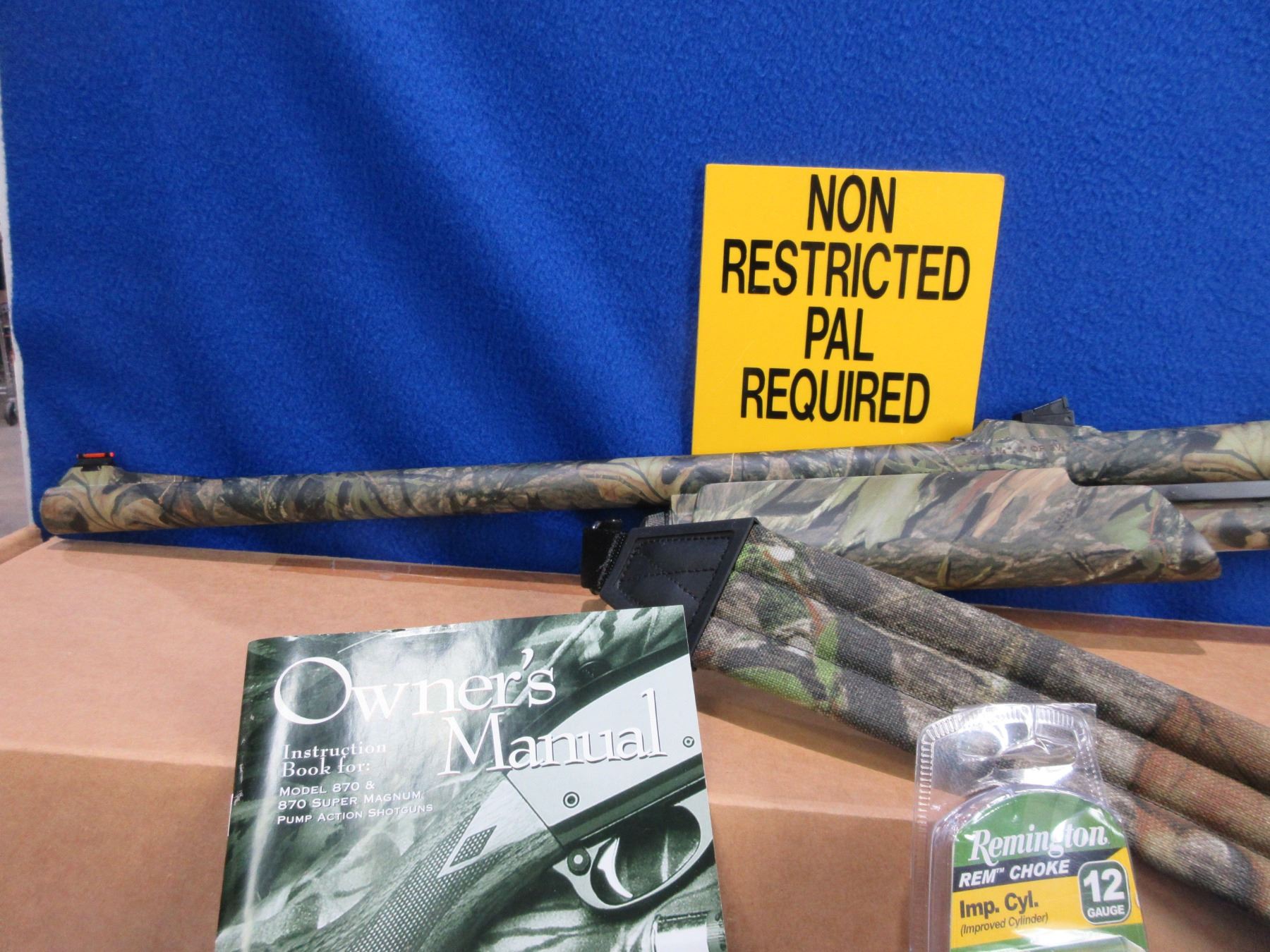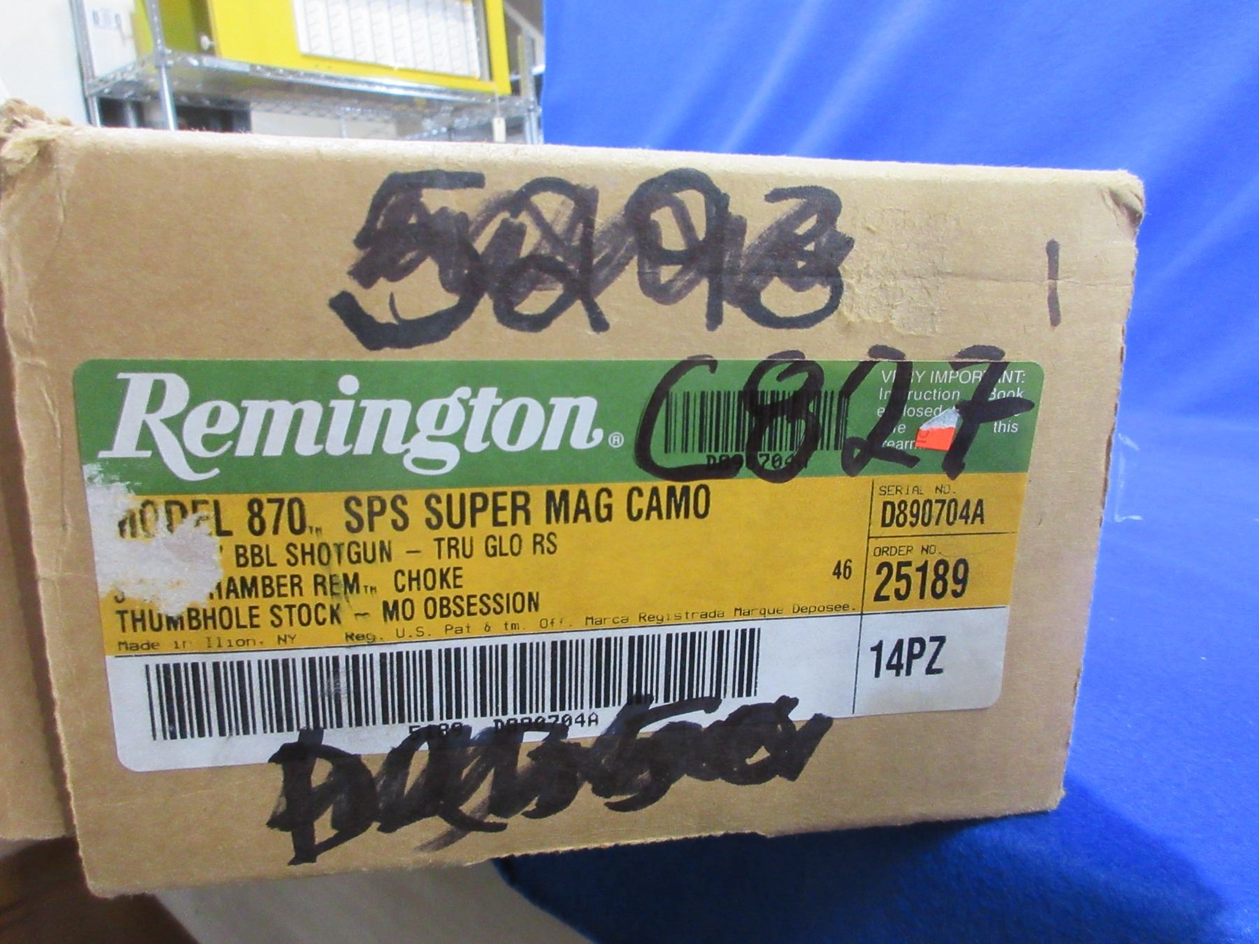 NEW - Non-Restricted - Remington 870 SPS Super Mag in 12 Ga. 2 3/4", 3", 3 1/2" - This is a NEW pump action shotgun with tube magazine and removable choke. Barrel is 23", has fiber optic sights, Mossy Oak Obsession thumbhole stock, forearm, action and barrel, length of pull is 15", rubber recoil pad deteriorating, comes with swivels and camo sling, original box, 2 extra chokes, speed wrench, plug, 2 J-Lock safety keys, Owner's Manual. Ser # D890704A