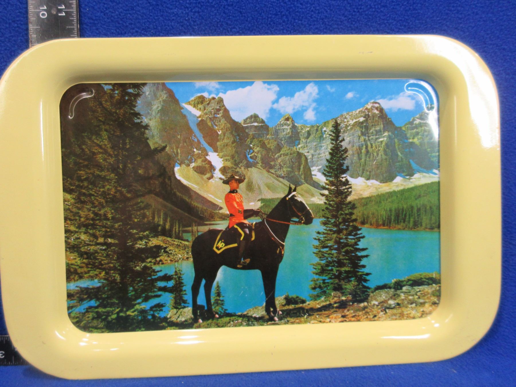 Lot 283 Vintage RCMP Metal Serving Tray - Canadian Rockies with Yellow Border