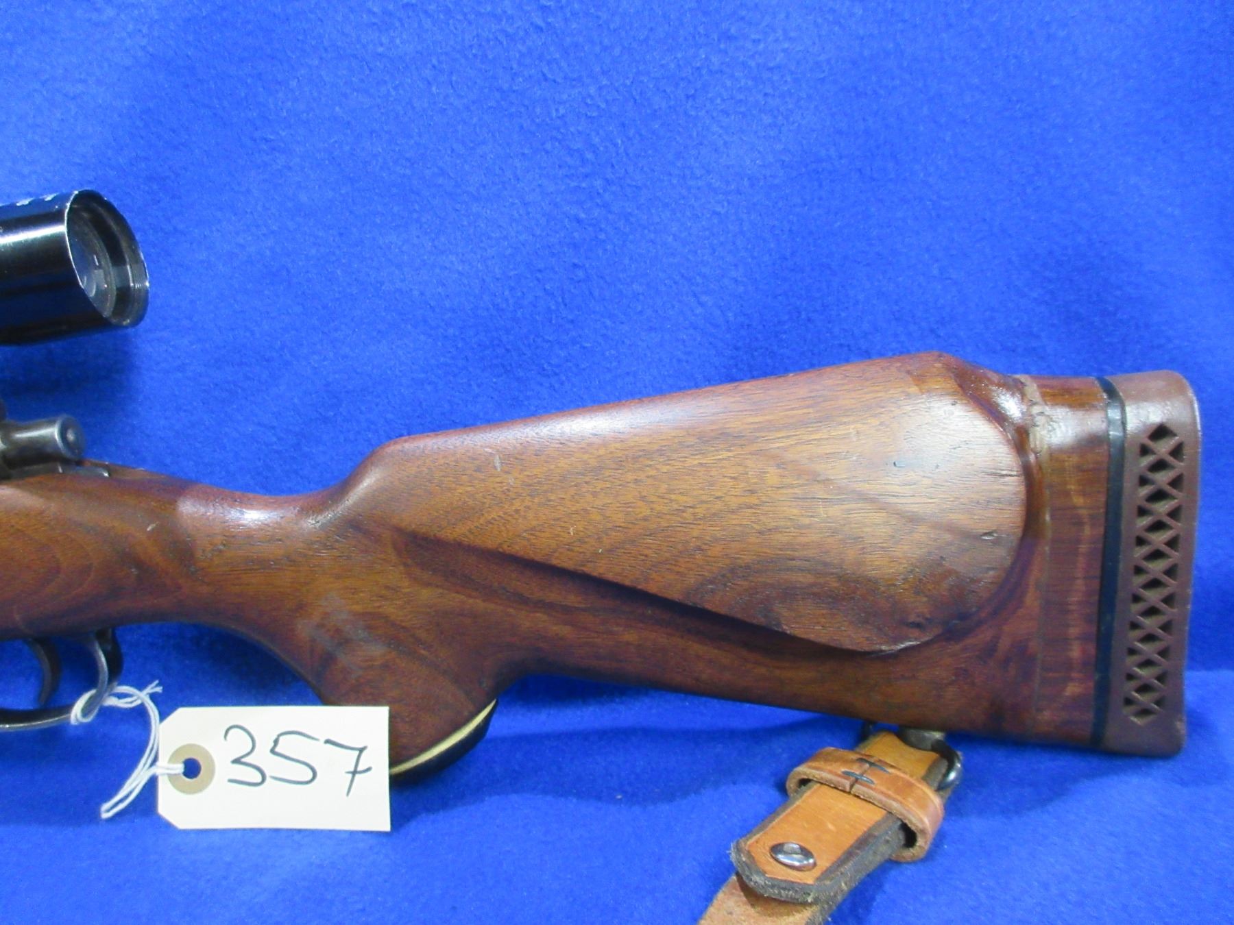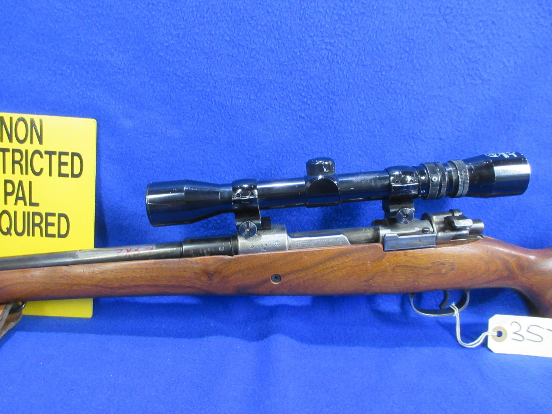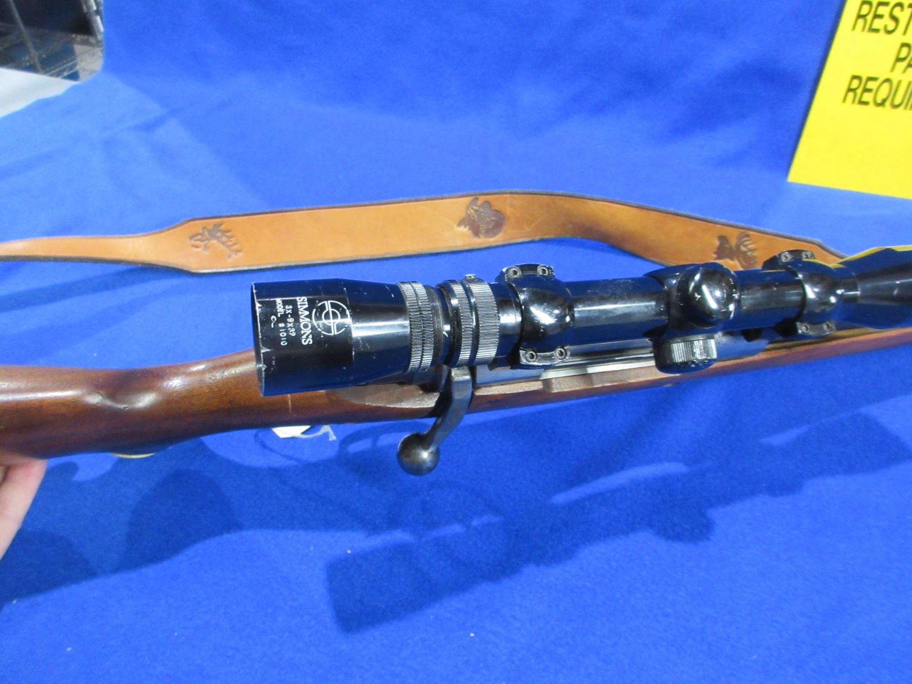 Non-Restricted - Mauser Model 1908 in 7x57 - This is a bolt action rifle with floorplate magazine, action appears to be in good working order. Barrel is 22", rifling is good, bluing is fair to good, has no sights but has Simmons model 1010 3-9x32 scope - appears clear - duplex reticle, stock has been shortened then lengthened and is good with usage marks, length of pull is 13 3/4", rubber recoil pad, comes with swivels and leather sling. Ser # 1375