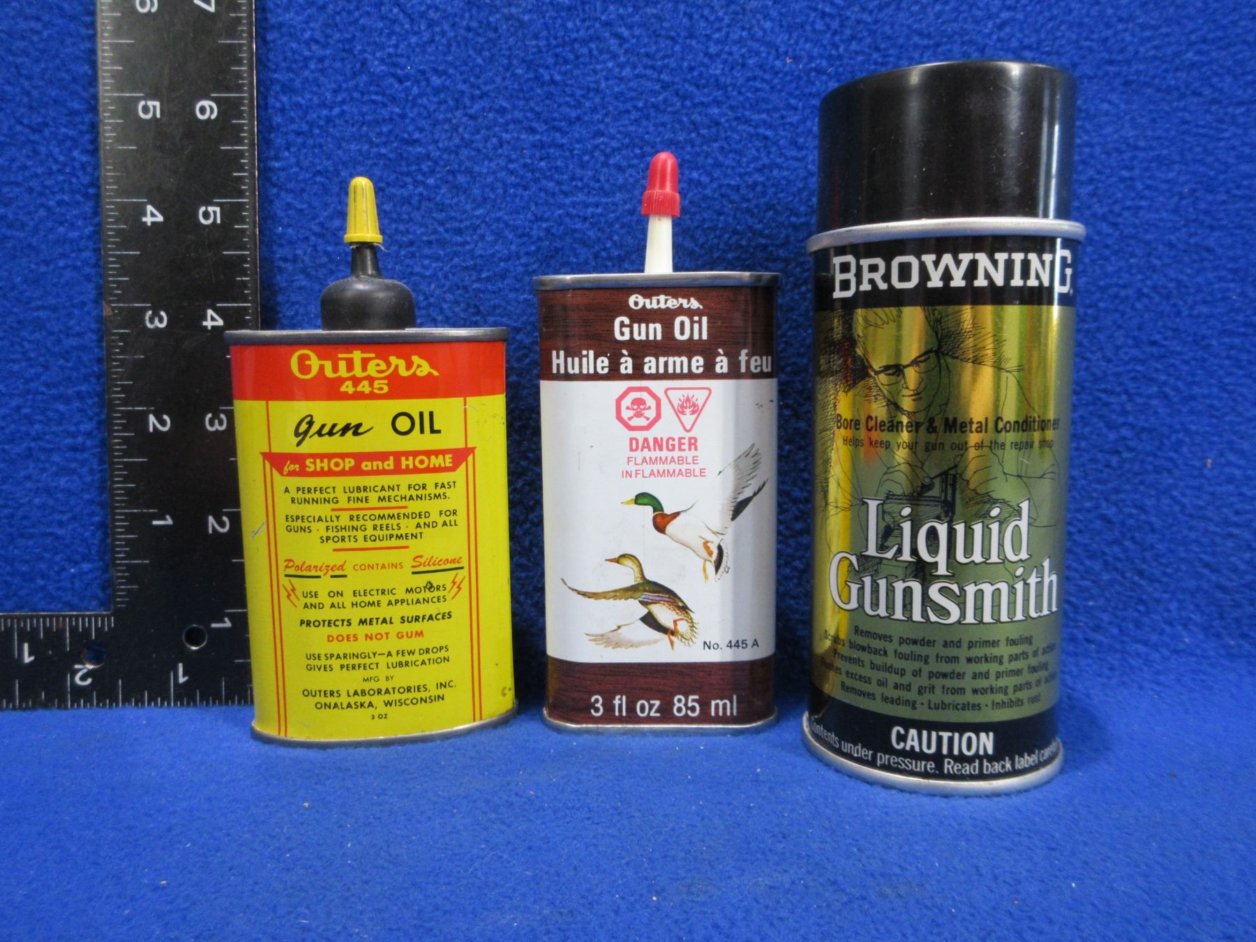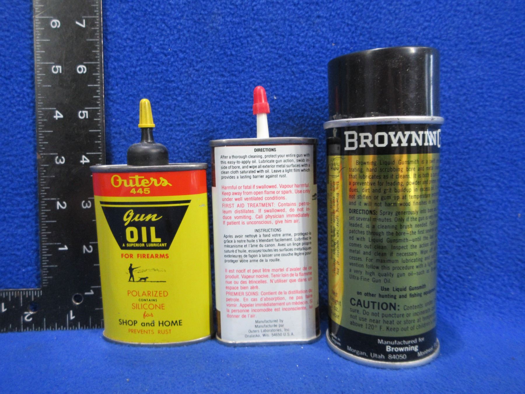 Lot 429 3 Vintage Oil Cans - Browning Liquid Gunsmith & 2 Outers Gun Oil