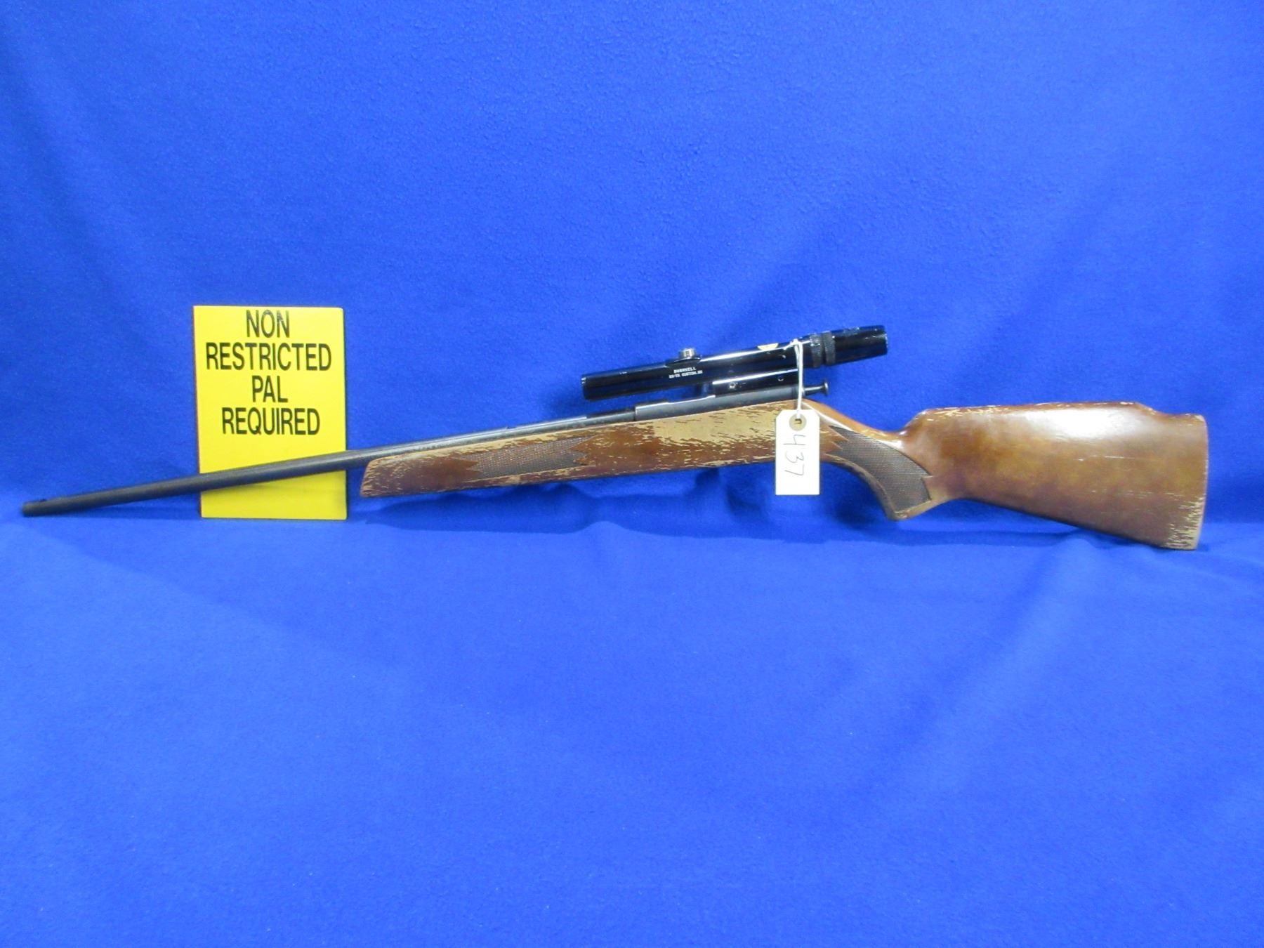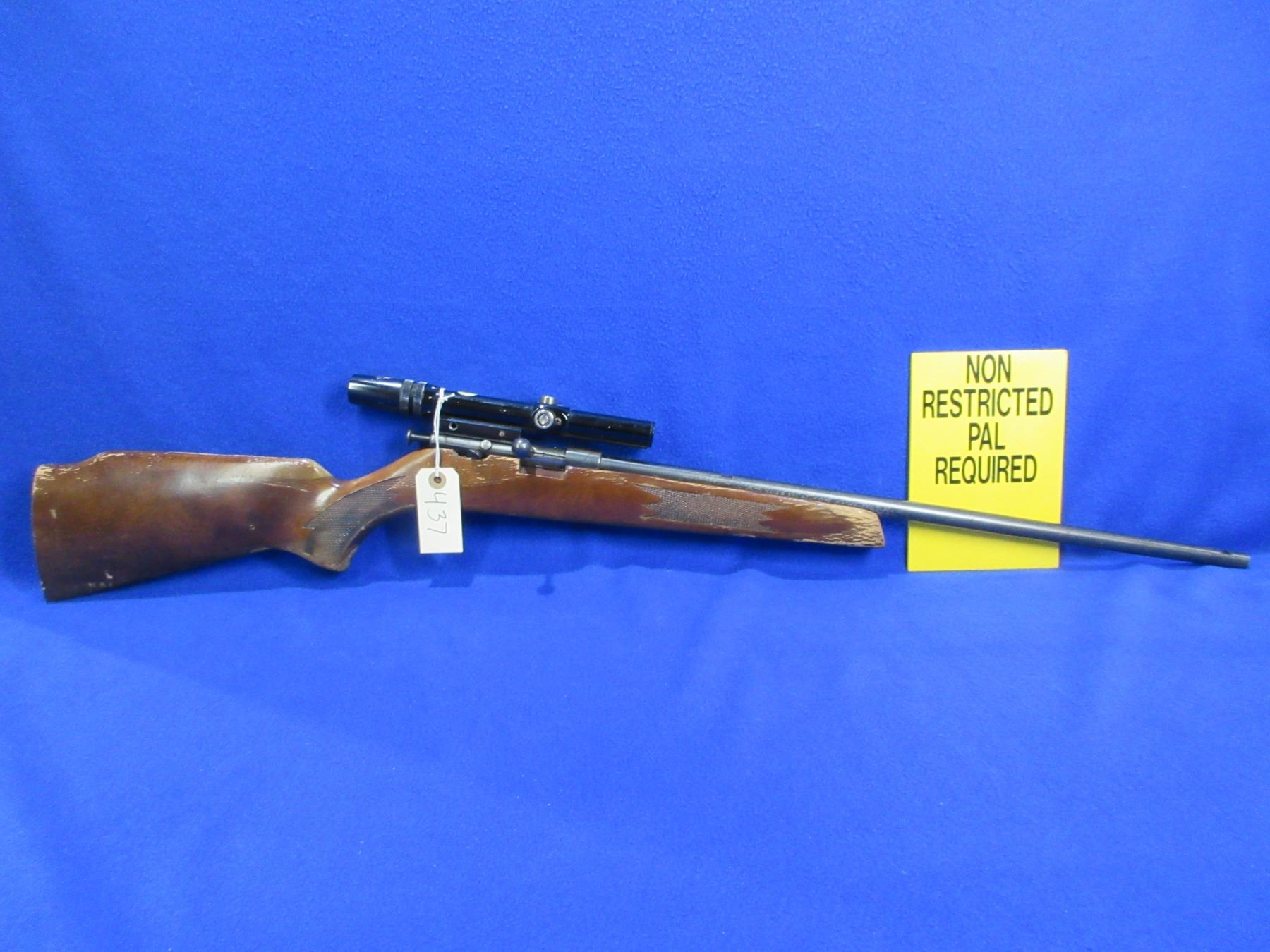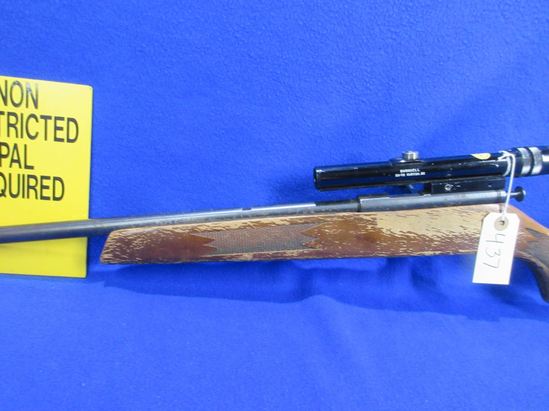 Non-Restricted - Lakefield Mossberg Model Mk I in 22 S/L/LR - This is a single shot bolt action rifle, action appears to be in working order. Barrel is 23", rifling is poor, bluing has pitting, sights are missing but has Bushnell 2x-7x Custom .22 scope - appears clear - standard reticle, stock is good but finish is flaking, trigger guard missing, length of pull is 13 1/4", butt plate missing. Ser # 209980