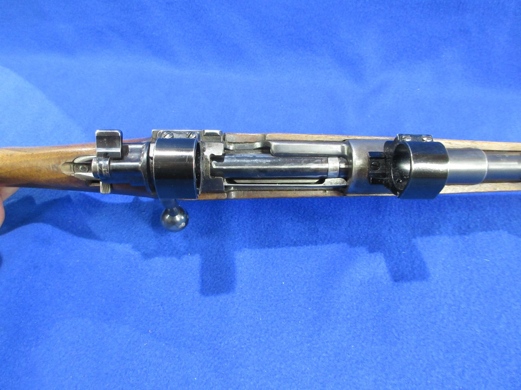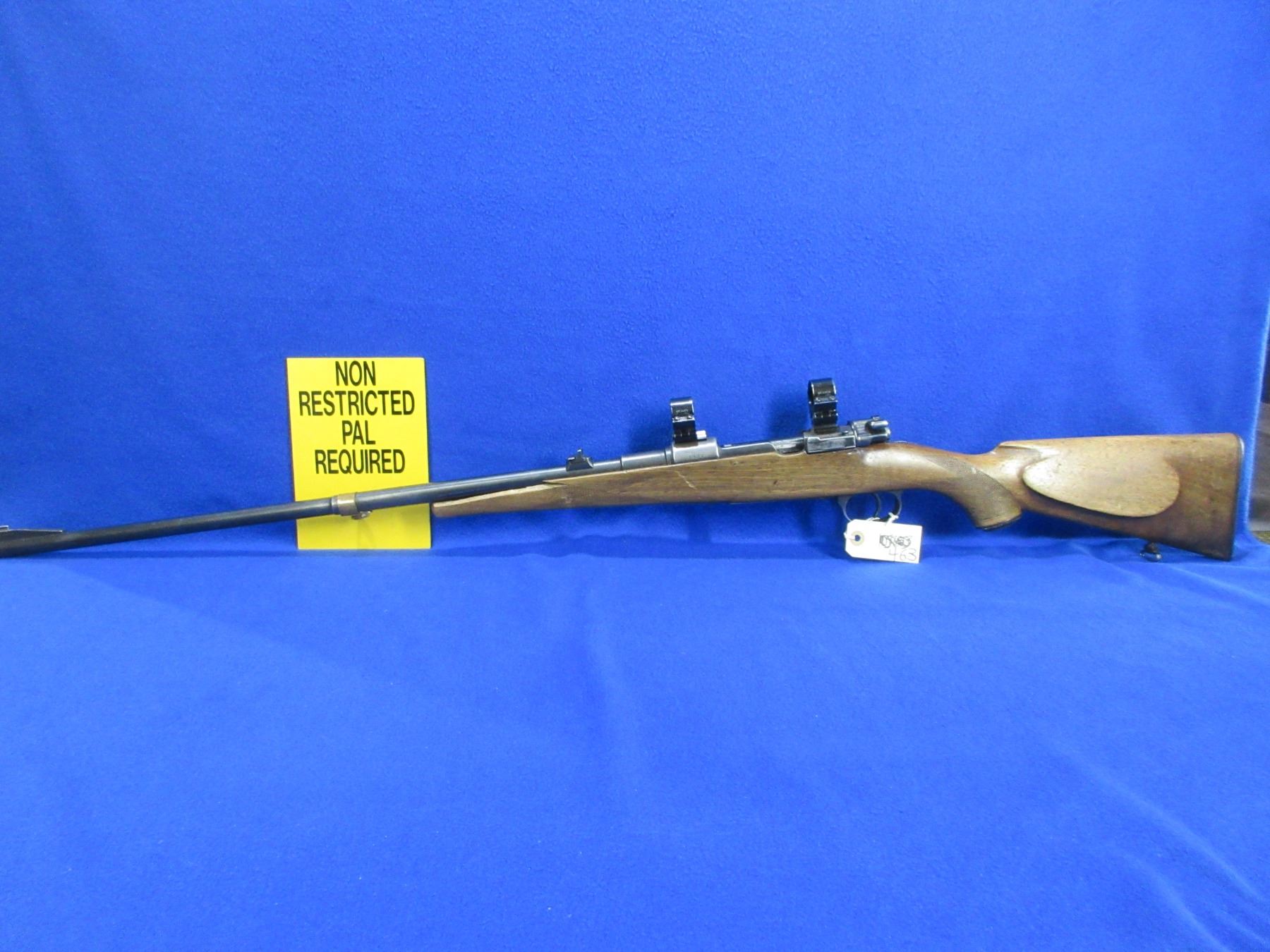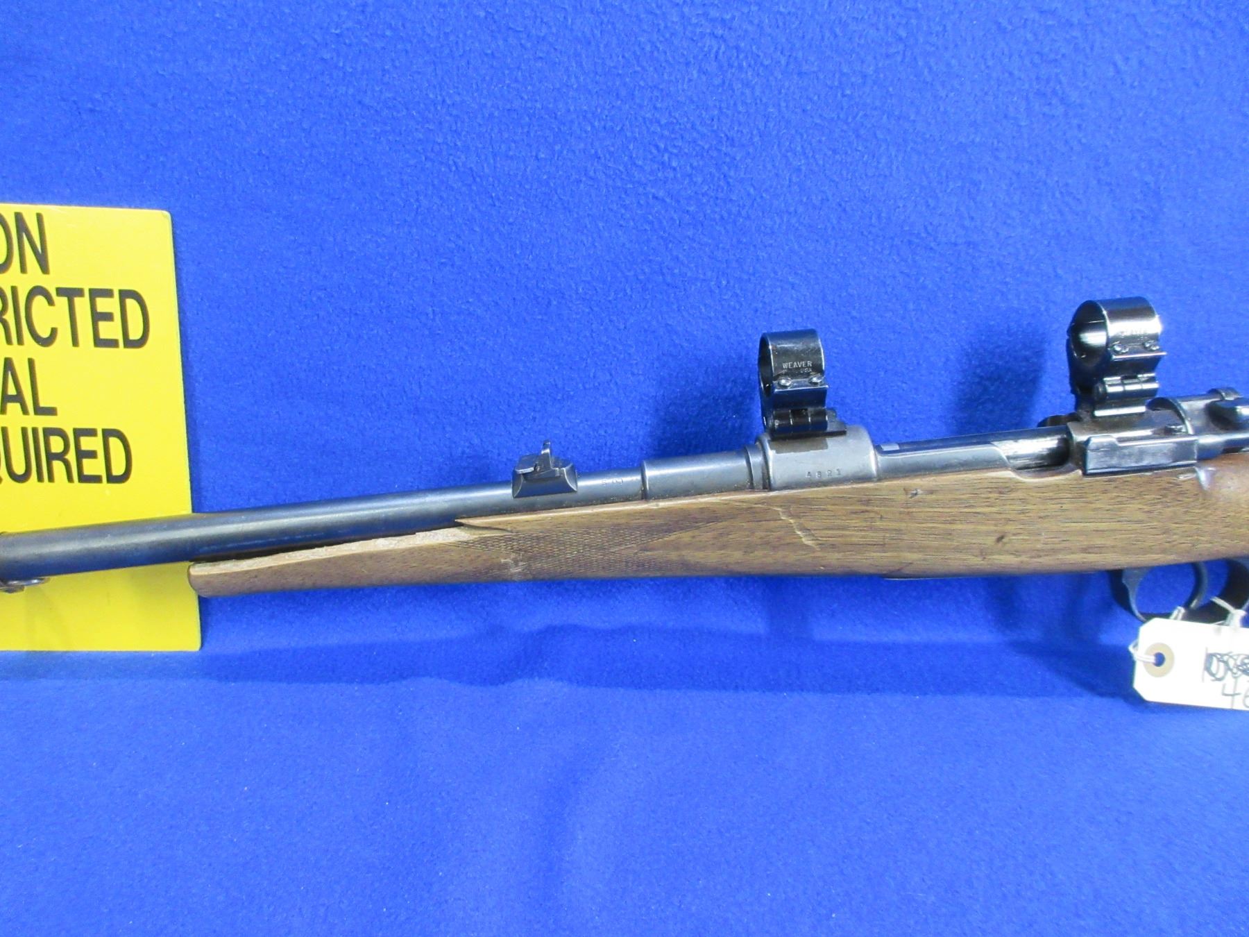 Non-Restricted - Geco Model 98 in 6.5x55 - This is a bolt action rifle with floorplate magazine, action appears to be in good working order. Barrel is 26 1/2", rifling is good, bluing is turning grey, has both sights and Weaver 1" Tip-off rings, stock has a large chip on the forearm on left side and many usage marks, length of pull is 13", butt plate has a small chip on the toe, comes with swivels. Ser # 4821