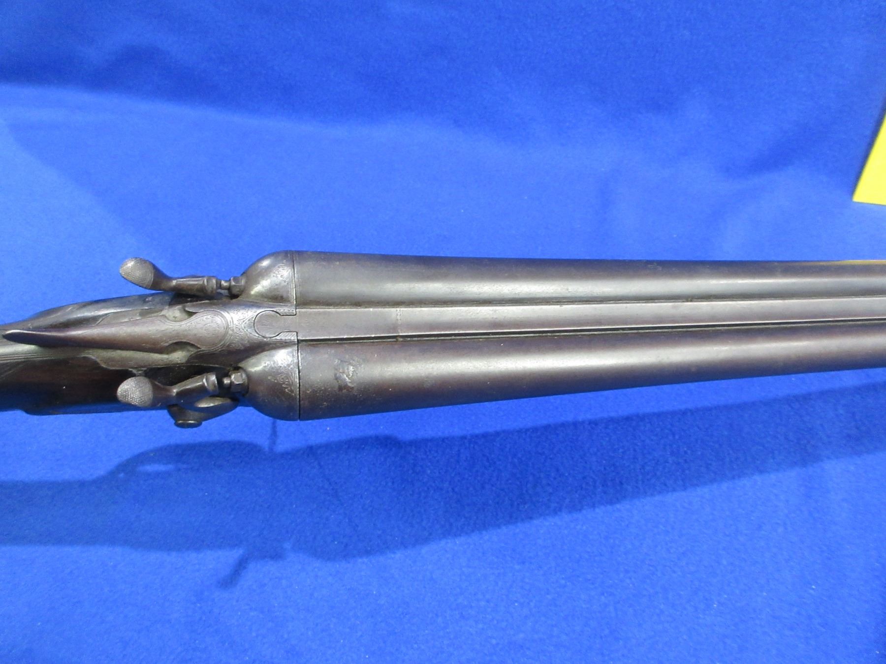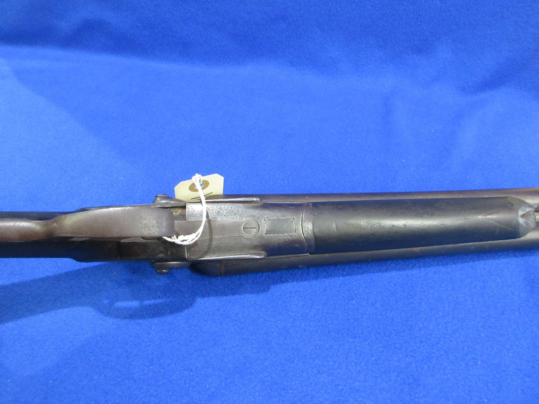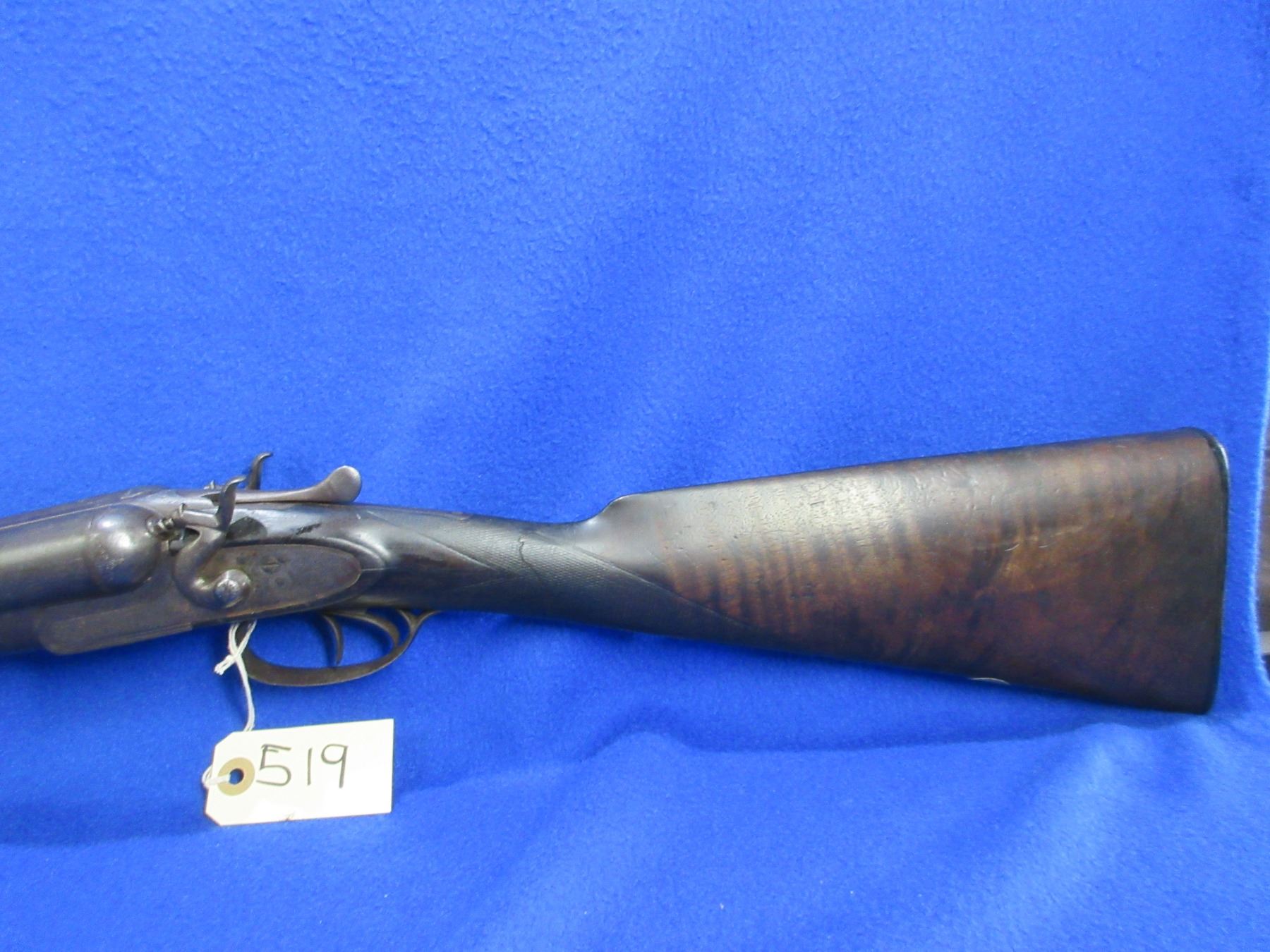 Non-Restricted - Hooton & Jones in 12 Ga. 2 1/2" - This is a tip up hammer SXS shotgun, action is tight and appears to be in working order. Barrels are 30", bores are fair to good, bluing has light pitting, has bead front sight, stock is cracked in the wrist area, forearm is good but front inlay missing and is loose to barrel, length of pull is 14 1/4", butt plate good. Ser # None